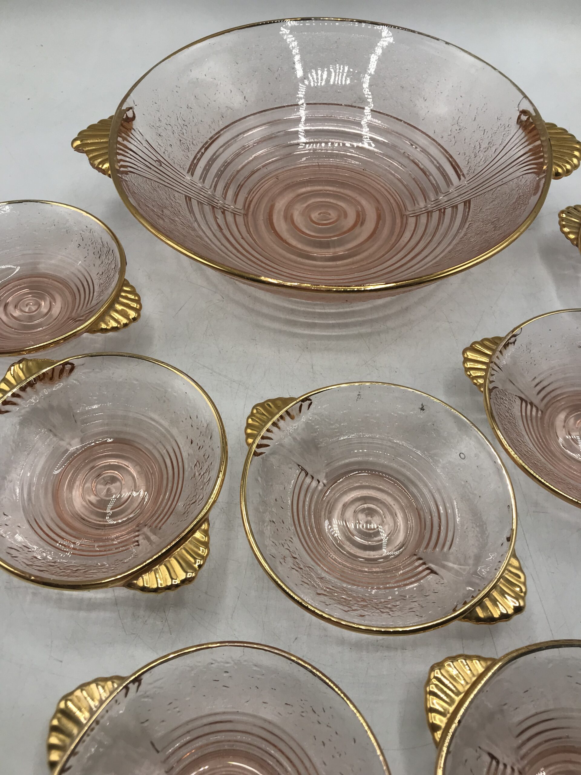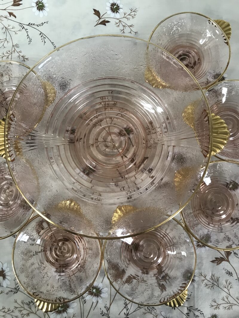 Alerte pépite !!! Service à fruits doré en rosaline vintage. Vrai coup de cœur pour cet ensemble. Il est composé d’un saladier de diamètre 23 cm pour une hauteur de 7 cm. Il est accompagné de 7 petites coupelles rondes de diamètre 10,5 cm pour une hauteur de 3 cm. Un ensemble au design art déco avec ses formes géométriques, de plus nous avons sur chaque pièces un effet givré sur le verre qui est du plus bel effet. Un service plein de douceur et de charme. Le duo rosaline et poignées dorées marche à merveille. Surprenez vos invités au moment d’apporter les douceurs.