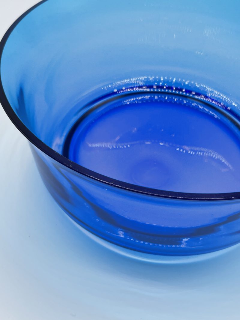 Ce joli service à salade de fruits en verre est composé d’1 saladier et de 5 petits ramequins à pied de couleur bleu. 2 ramequins sont un peu ébréchés (cf photos) mais cela n’altère pas leur bonne utilisation. La couleur bleue est une couleur qui revient en force dans nos cuisines et nos intérieurs, alors laissez-vous tenter par ce joli service qui donnera une touche rétro et pop à votre table !