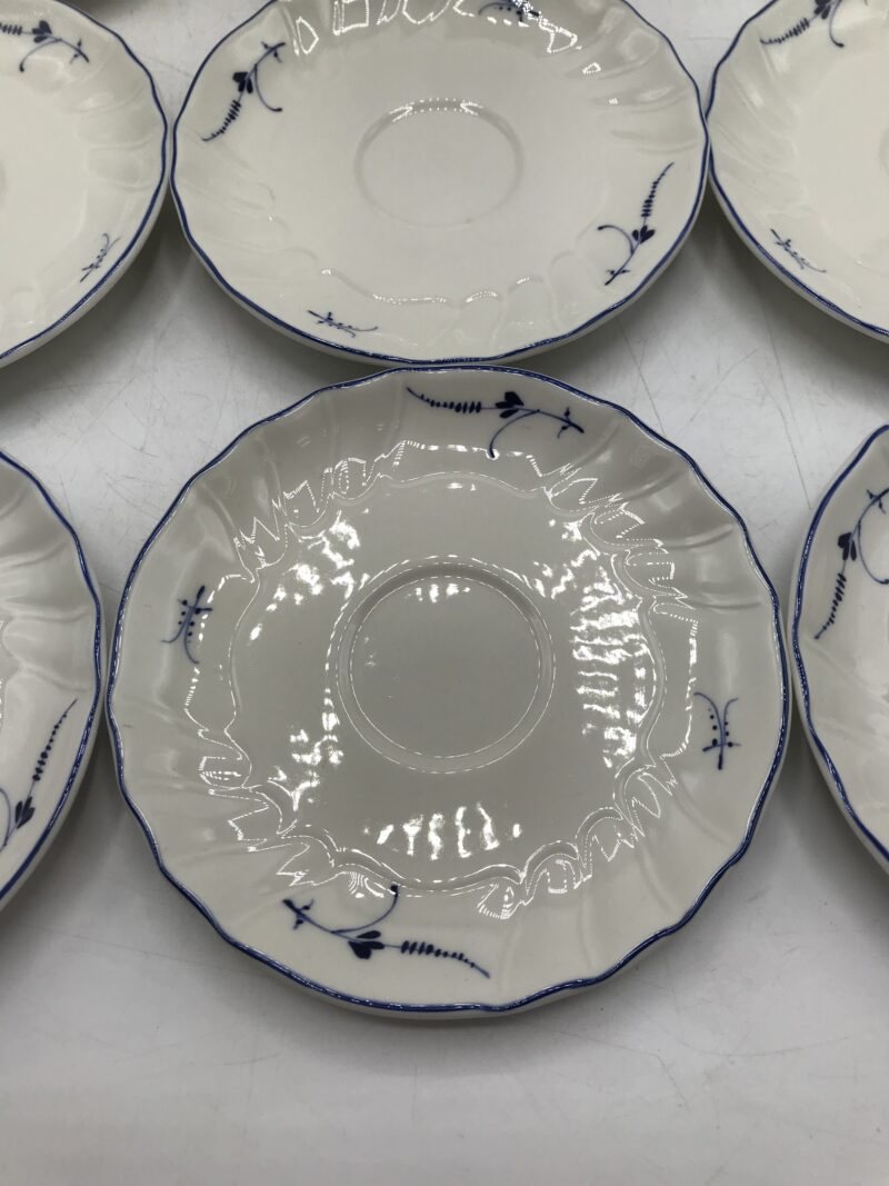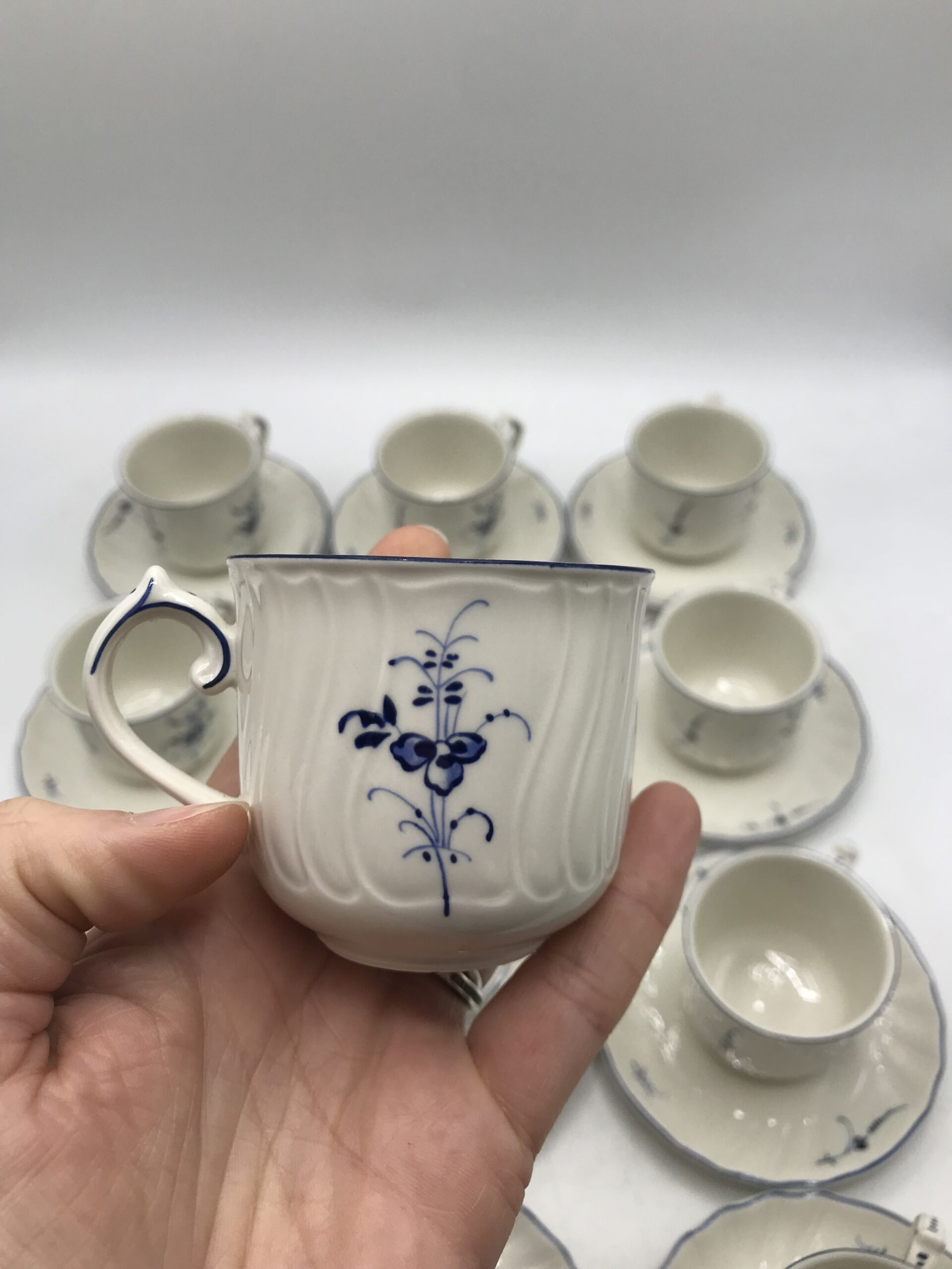 Alerte pépite !!!! Service à thé 24 pièces Villeroy et Boch collection Vieux Luxembourg. Ses douces ondulations, ses lignes délicates et son harmonie parfaite. Ce service traditionnel raffiné en Premium Porcelaine de haute qualité est apprécié depuis toujours et séduit par ses motifs rococo bleus appliqués à la main représentant des rameaux fleuris ainsi que par ses reliefs en filigrane. Le service est composé de 11 tasses avec leur sous tasses et d’une théière. Etat parfait rien à noter. Avis aux fans de Villeroy et Boch. Ensemble 5 pièces de service Villeroy et Boch Vieux Luxembourg.
