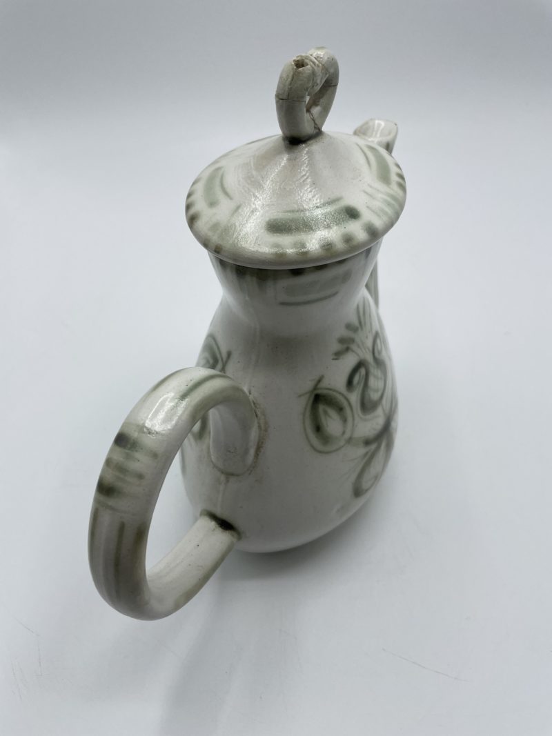 Ce joli service à thé se compose d’1 théière, 1 pot à sucre et 1 pot à lait. Signé Keraluc Quimper, il est en terre cuite couleur beige et il est décoré de motifs arabesques de couleur vert amande. Vintage, des traces d’usure sont à prévoir (cf photos) jolies marques du temps passé. Un joli service champêtre et rétro !