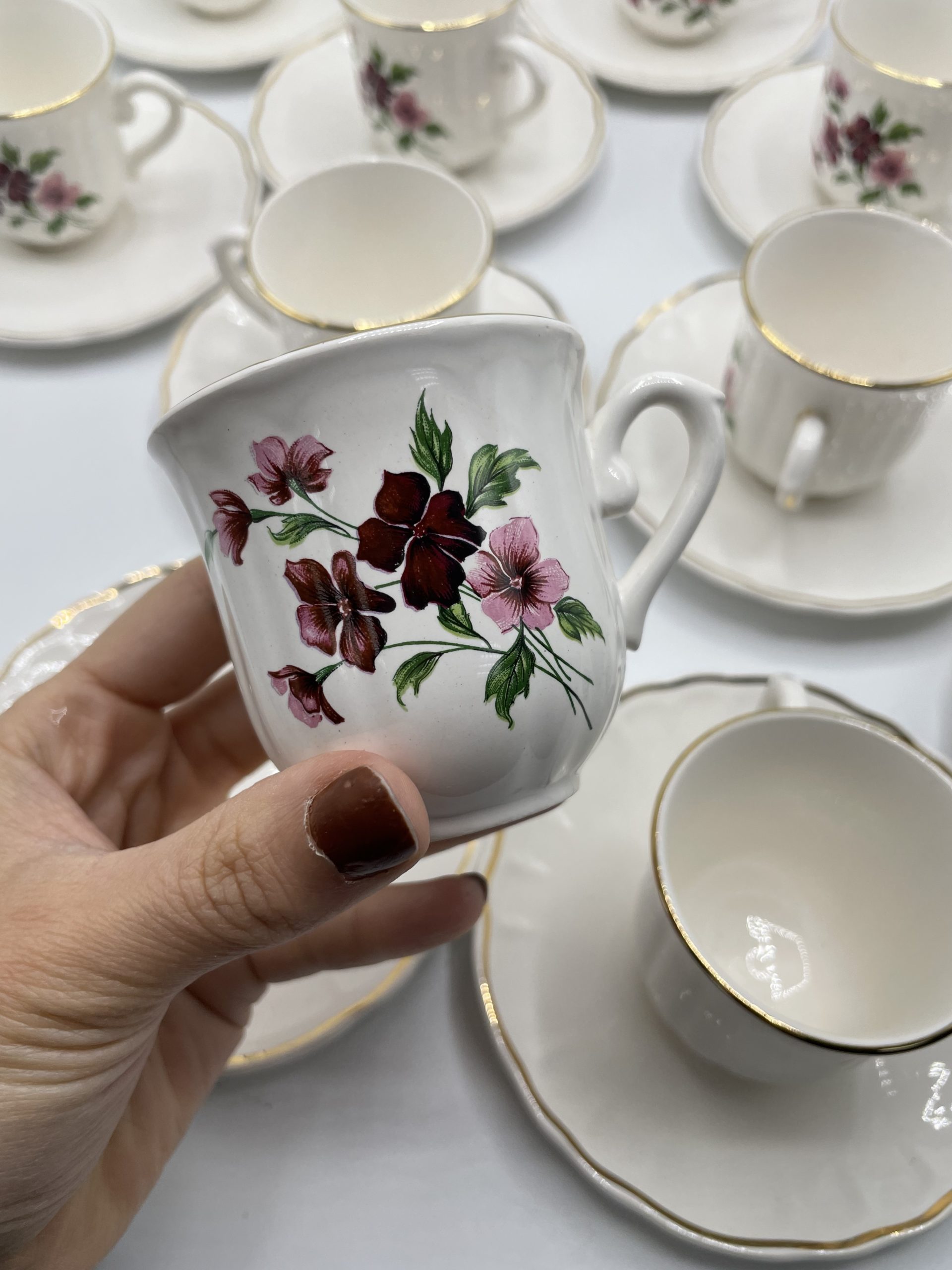 Comment résister face à ce sublime service à thé vintage ? De 30 pièces ce service se compose de 12 tasses ( 1 tasse a une anse cassée mais on peut la restaurer car nous l’avons) et 12 coupes, 1 théière, 1 pot à lait, 1 sucrier, 2 raviers et 1 saucier. Estampillé Salins France, le service est décoré du décor Briare. De couleur blanche, le service est décoré avec des motifs de fleurs mauves, fuchsia et vertes et de liseré dorés, ce qui lui donne un style romantique et très élégant. Vintage, des traces d’usure sont à prévoir (cf photos) jolies marques du temps passé. Ce service est sublime et idéal pour le thé de l’après-midi accompagné de quelques douceurs et d’une crème anglaise !