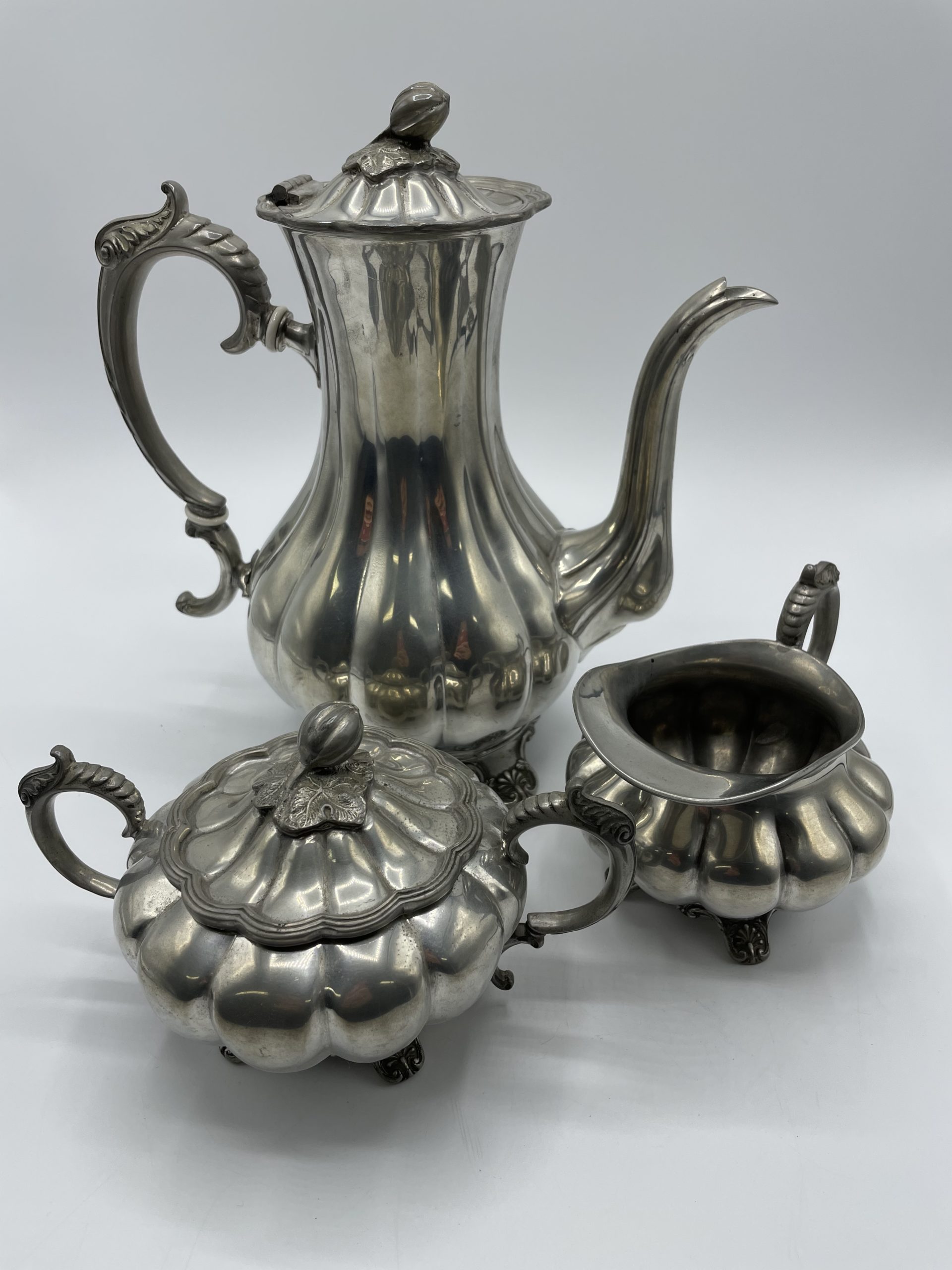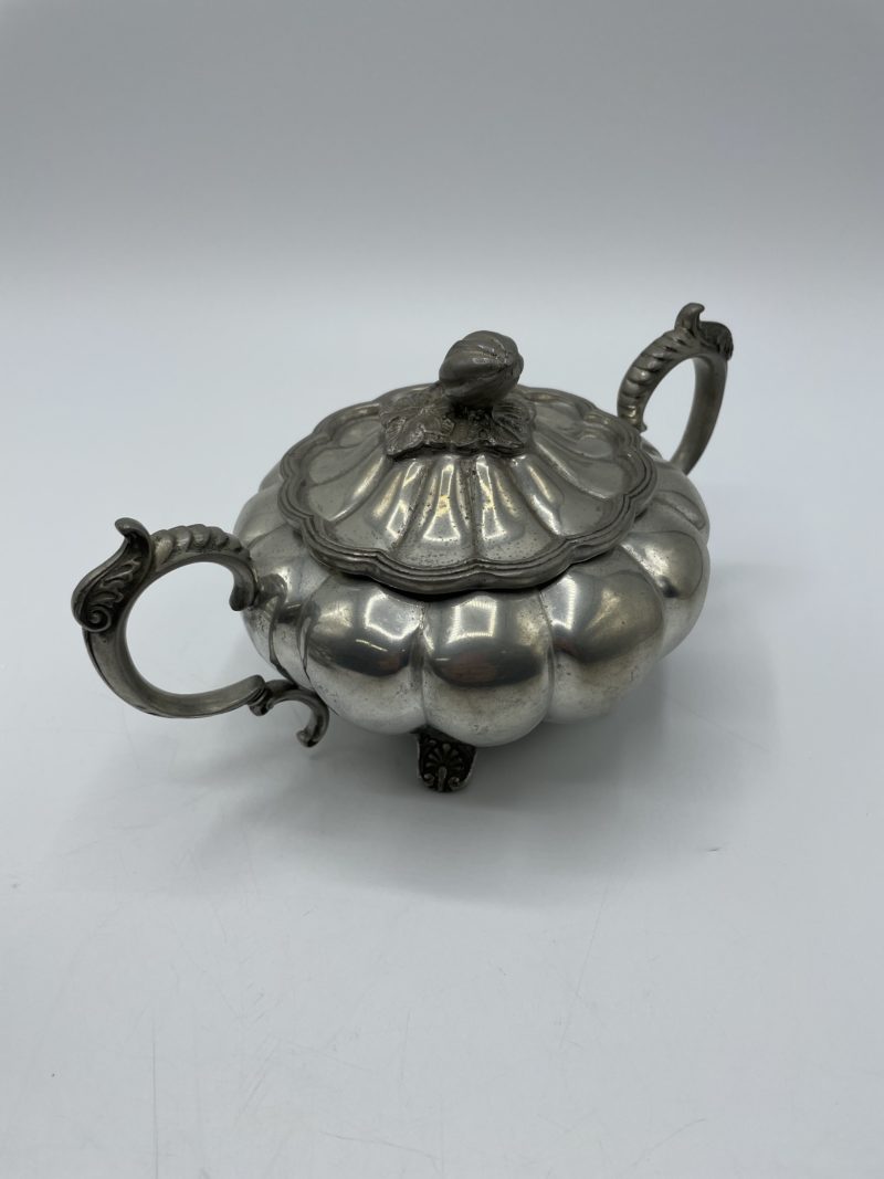 Très joli lot composé d’1théière, d’1 pot à lait et d’1 sucrier. En étain anglais, le lot est estampillé Sheffield England. Vintage, quelques traces d’usure sont à prévoir (cf photos) jolies marques du temps passé. Les pieds et les anses sont décorés de motifs ornementaux et les couvercles de la théière et du sucrier sont surmontés d’un gland qui permet une meilleure prise en main. Un petit nettoyage sera à prévoir pour rendre à l’étain tout son éclat d’origine. Ce joli service est à la fois intemporel et très élégant et c’est un joli service de collection.