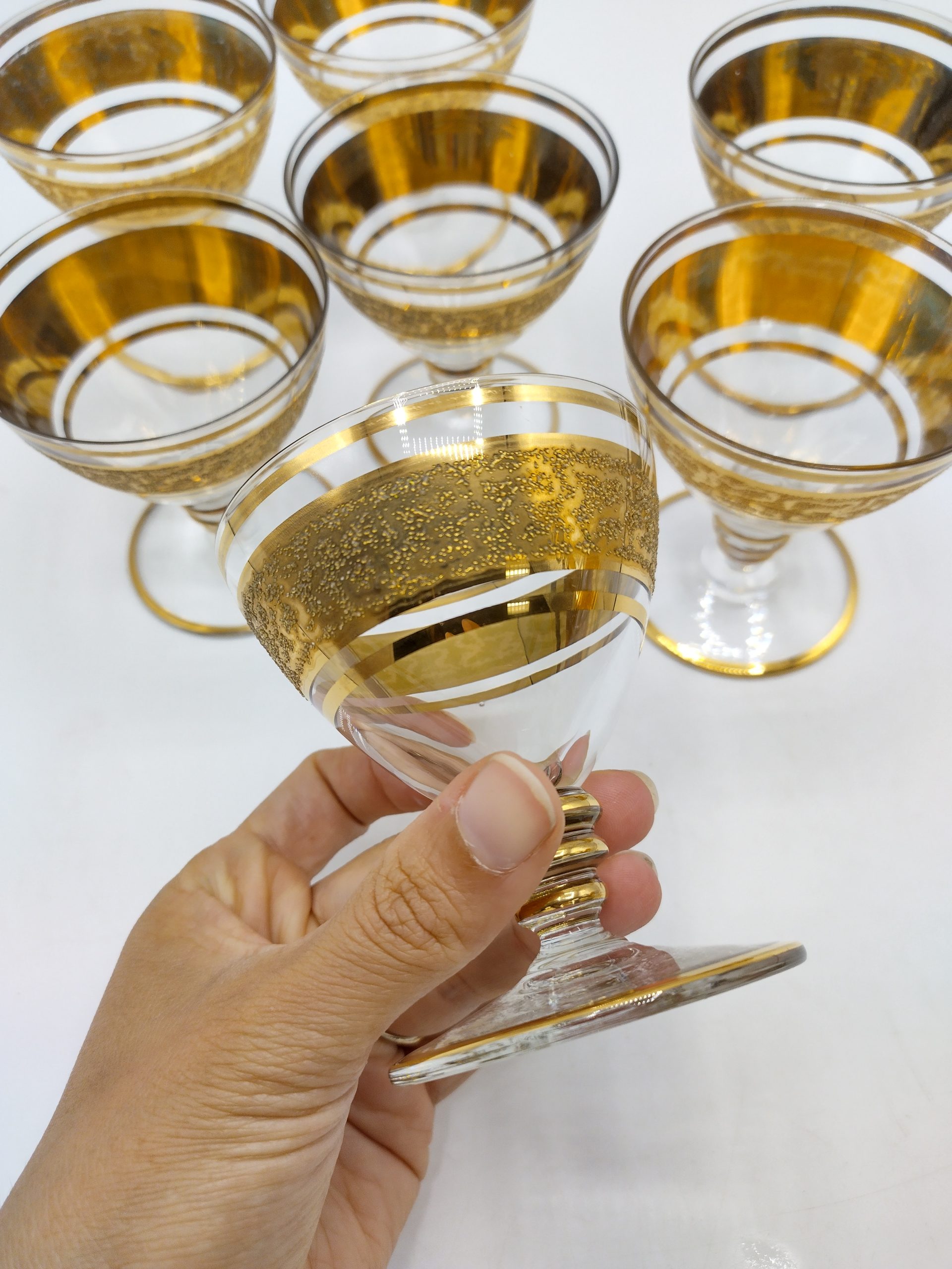 On craque d’amour pour ce magnifique service à liqueur vintage. Composé d’une carafe et de 7 petits verres à la forme de coupes vintage, ce magnifique service en verre est décoré d’une jolie bande centrale de couleur dorée et de motifs ornementaux de couleur doré qui donne un effet granité au service. Vintage des années 60, des traces d’usure sont à prévoir (cf photos) jolies marques du temps passé. Un magnifique service pour servir un apéritif ou une liqueur avec élégance.