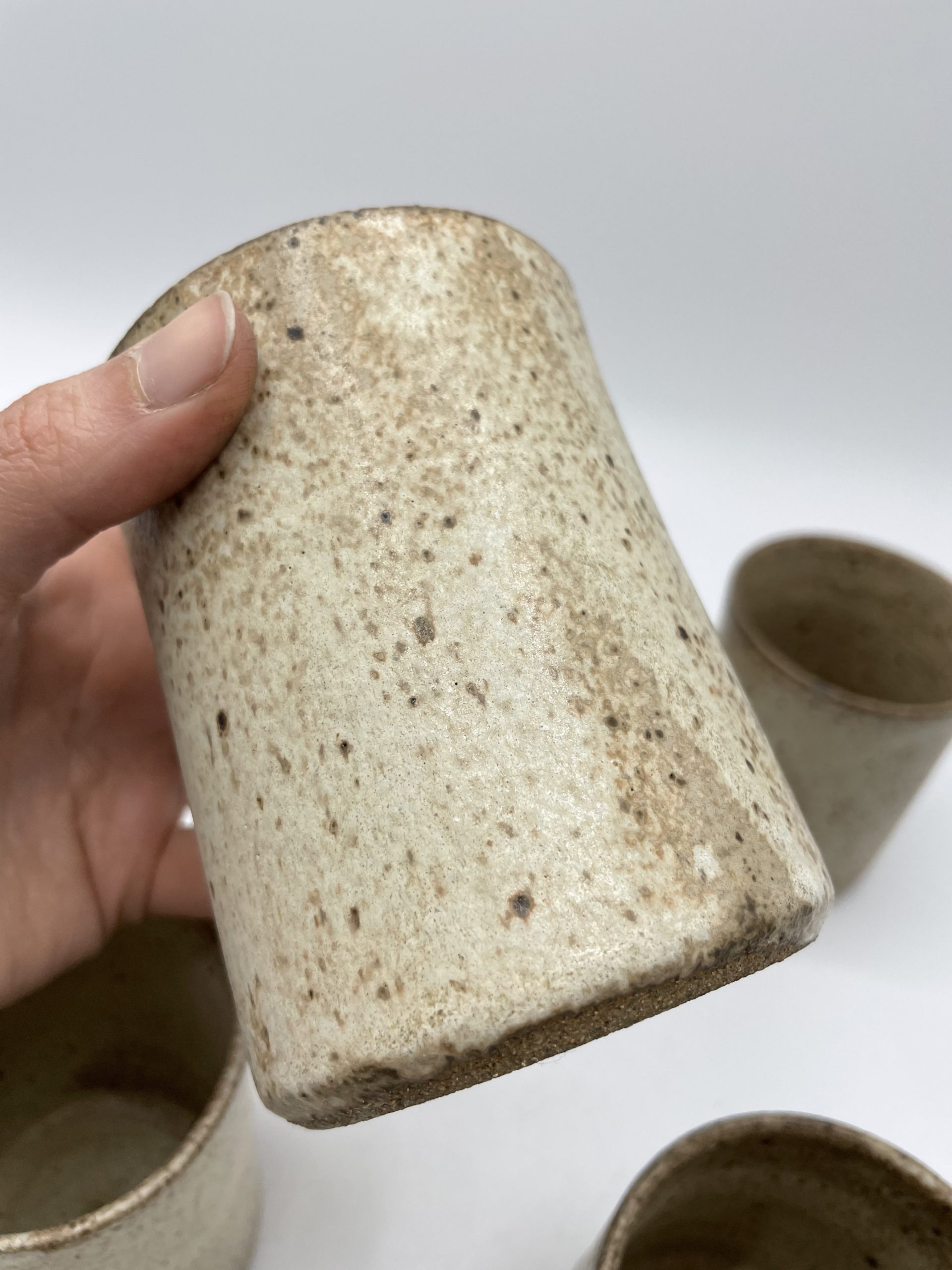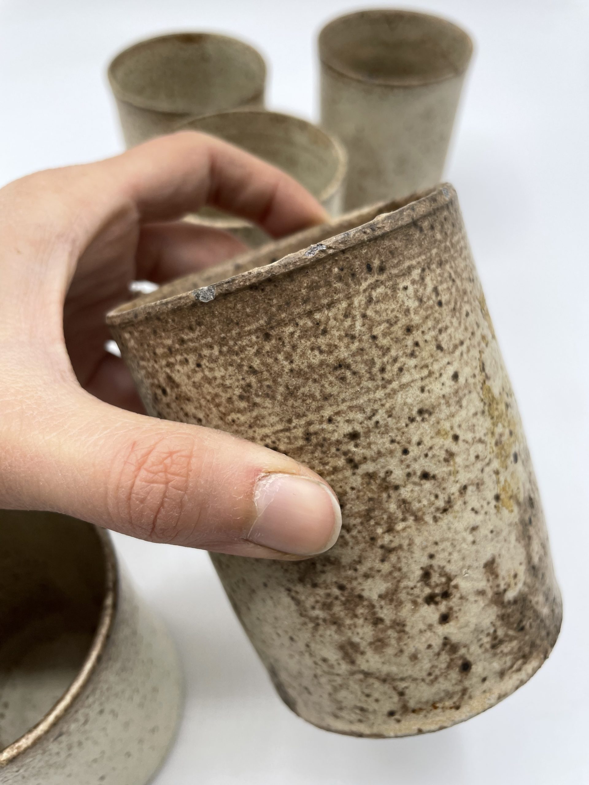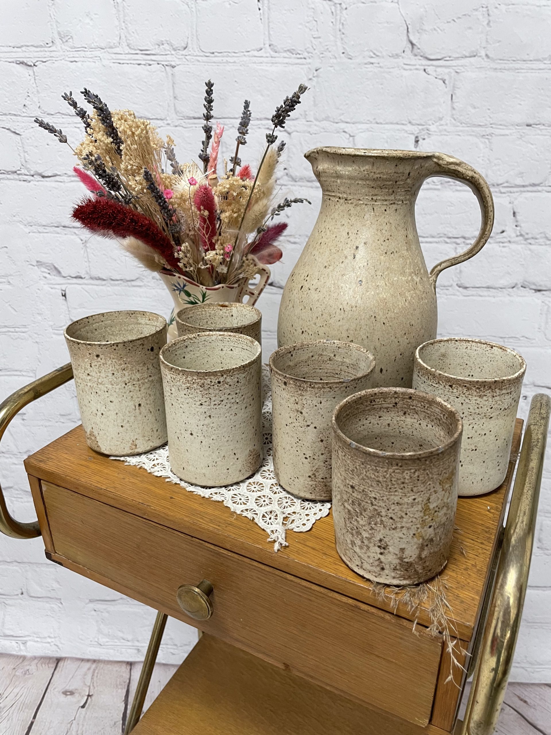 On craque d’amour pour ce sublime service de 7 pièces en grès qui se compose d’1 carafe et de 6 gobelets à eau. De fabrication artisanale, les gobelets ont tous une taille différente et chaque pièce du service est donc une pièce unique !Vintage, quelques traces d’usure sont à prévoir (cf photos) jolies marques du temps passé. Avec sa jolie couleur beige, ce joli service sera parfait pour servir une citronnade fraîche en terrasse et apportera un look minéral et naturel.