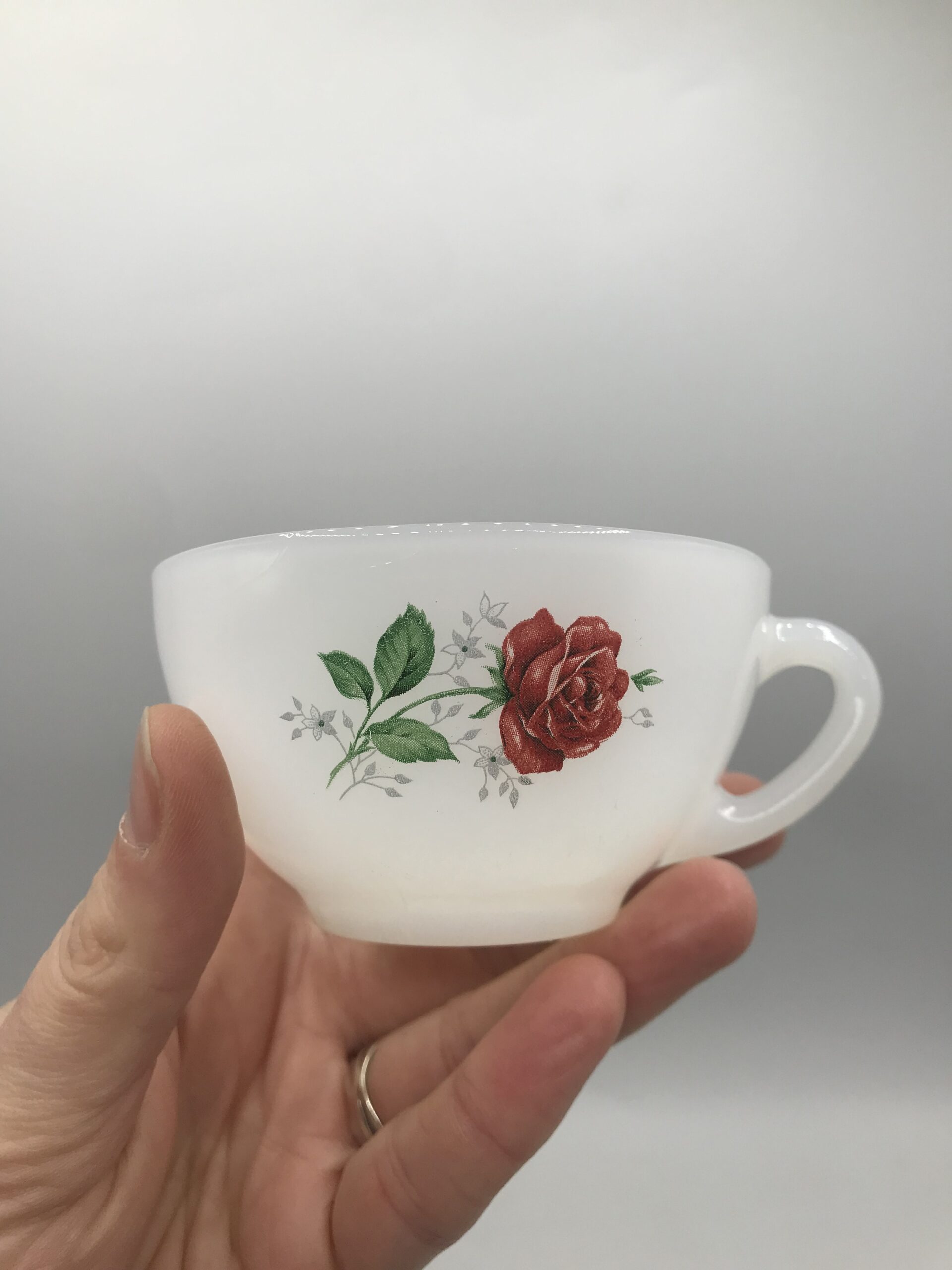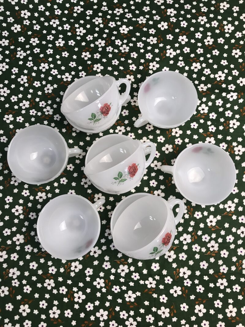 Service de 10 tasses Arcopal. Voici un ensemble plein de douceur. Lot de tasses signées Arcopal, les tasses sont en très bon état. Elles ont un diamètre de 8,5 cm pour une hauteur de 4,5 cm. De couleur blanche avec une petite transparence, elles sont décorées d’une jolie petite rose rouge. Une pointe de nostalgie envahira votre moment douceur. Une vaisselle retro vintage qui vous plongera dans un délice de moment suspendu. Apportez le café vos invités attendent. Amoureux de brocante et de chine, elles trouveront grâce à vos yeux.