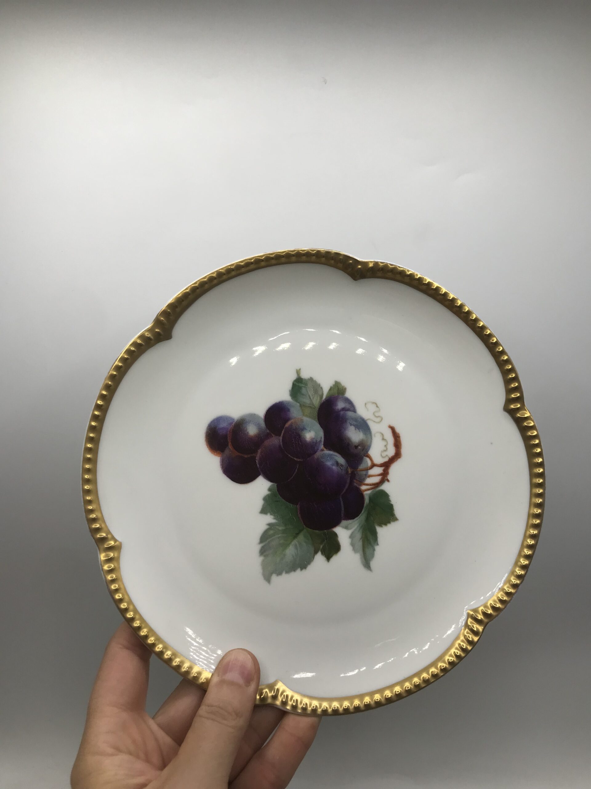 Service de 11 pièces Rosenthal. Le service est composé de 10 petite assiettes et d’un grand plat. Les assiettes ont une taille de 20 cm pour une hauteur de 2 cm. Elles sont de couleur blanche avec une frise dorée tout le tour. De magnifiques illustrations représentant de beaux fruits viennent les habiller. Nous avons 5 modèles de dessins différents, des pêches, des prunes, des cerises, du raisin et un coin. Le plat lui a un diamètre de 27,5 cm pour une hauteur de 3 cm. Un service en bon état, il porte quelques marques d’usure mais reste tout à fait prêt pour attaquer un service de haut vol. Ce service est signé K&A Selb Bavaria, si vous aimez la dorure et la fraicheur il est fait pour vous. Epatez vos amis avec cette vaisselle vintage pleine de caractère.