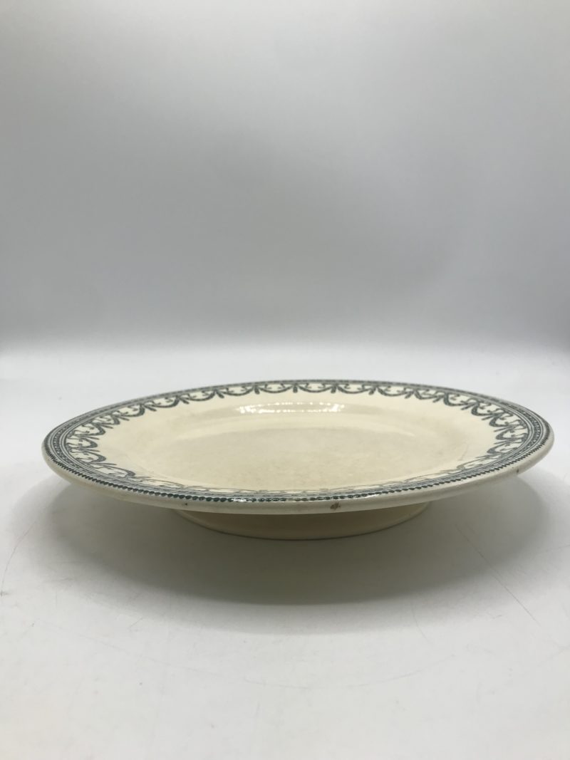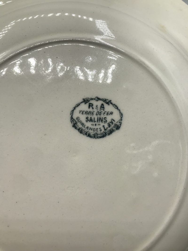 Très joli ensemble de 12 assiettes de diamètre 24,4 cm pour une hauteur de 3cm, et d’une coupe basse diamètre 24 cm pour une hauteur de 4cm. L’ensemble est décoré de guirlande Louis XVI. Une tres jolie couleur verte vient leur donner tout leur charme. Ces pièces portent quelques marques du temps passé. Le temps à laissé quelques patines sur la couleur ivoire des assiettes et leur frises. L »une d’entre elle est fendue à deux endroit. Le reste de l’ensemble est sans accros. Un beau service de Terre de Fer comme on les aime.