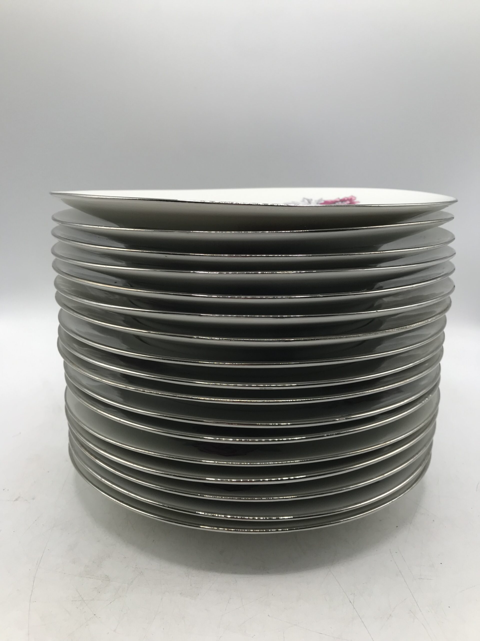Service de 17 assiettes Porcelaine de Limoges « A.Maire » Marseille. Très joli service composé de 17 assiettes plates de diamètre 24 cm pour une hauteur de 2,5 cm. Il est noté à l’arrière des assiettes Limoges U.G France A.Maire 63 rue st Ferréol Marseille. Une belle collection qui est habillée de fleurs géométriques de couleurs rouge et rose. Les bords des assiettes sont de couleur argentée. Pas d’éclats  à signaler mais des traces d’usures légères sur les motifs. Un beau service qui apporte class et originalité. Les amateurs de Porcelaine de limoges seront sous leur charme. A noter il y a deux lot de 17 assiettes disponible si besoin.