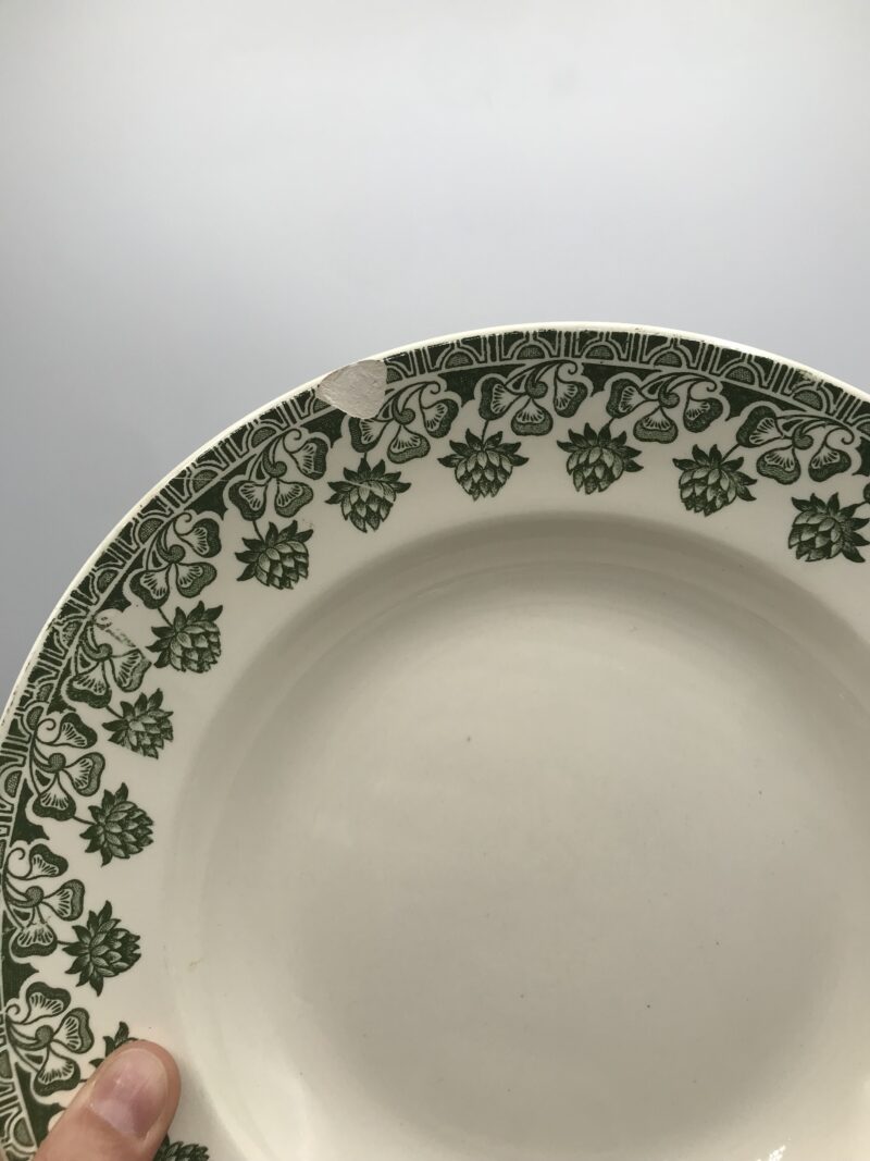 Service de 5 pièces Badonviller collection « Trèfle ». Magnifique lot de vaisselle de chez Badonviller de la collection » Trèfle ». Ce lot est composé de 4 assiettes creuses de diamètre 24,5 cm pour une hauteur de 4 cm et d’un plat de diamètre 28 cm pour une hauteur de 5 cm. Les assiettes sont en bon état mais une porte un éclat (cf photo). L’ensemble porte quelques traces d’usure mais rien de plus normal vu leur âge. La collection « Trèfle » est superbe, elle s’habille de décors floraux de couleur verte bien reconnaissable de la vaisselle ancienne. Cet ensemble apportera grâce et douceur sur vos tables. Surprenez vos convives.