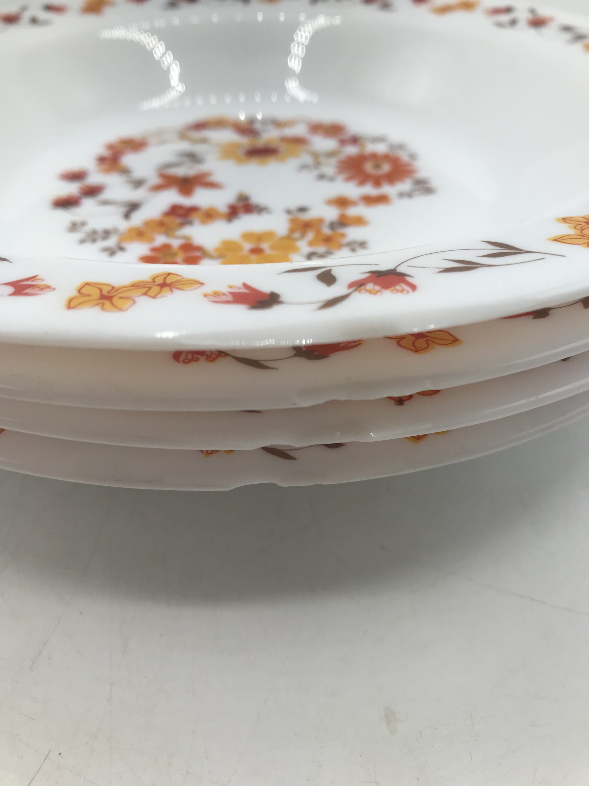 Service Arcopal de 12 pièces. Petit service très printanier plein de couleurs orangé vintage. Un service comme Arcopal sait les faire, frais, plein de légèreté, il habillera toutes les tables avec ses nuances automnales. Il est composé de 6 assiettes creuses, dont 4 ont un petits éclat sur le coté, (cf photos). Et 6 assiettes plates, dont 2 ont un petit éclat sur le coté, (cf photos). Les éclats sont vraiment mineurs. Un joli lot pour apporter la touche déco à votre vaisselle en mixant les gens pourquoi pas. Les assiettes creuses ont un diamètre de 21,5 cm pour une hauteur de 3 cm. Les assiettes plates ont un diamètre de 23, 5 cm pour une hauteur de 2,5 cm.