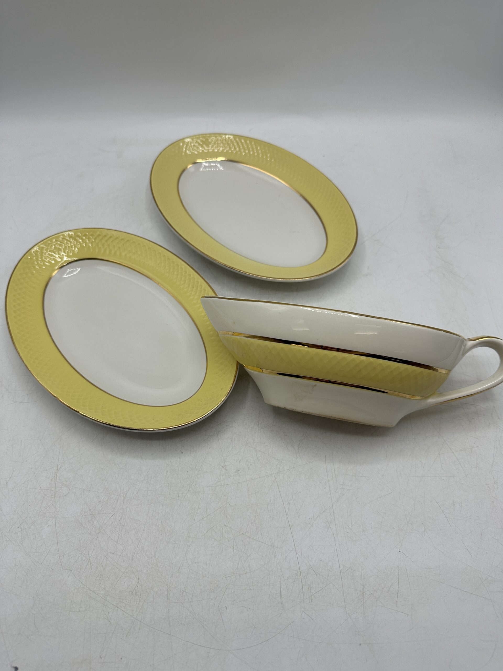 1 saladier, 1 soupière avec couvercle (le couvercle ne va pas parfaitement avec la soupière), 1 plat de service ovale, 1 saucière, 2 soucoupes, 2 grandes assiettes (1 plate et 1 semi-creuse).