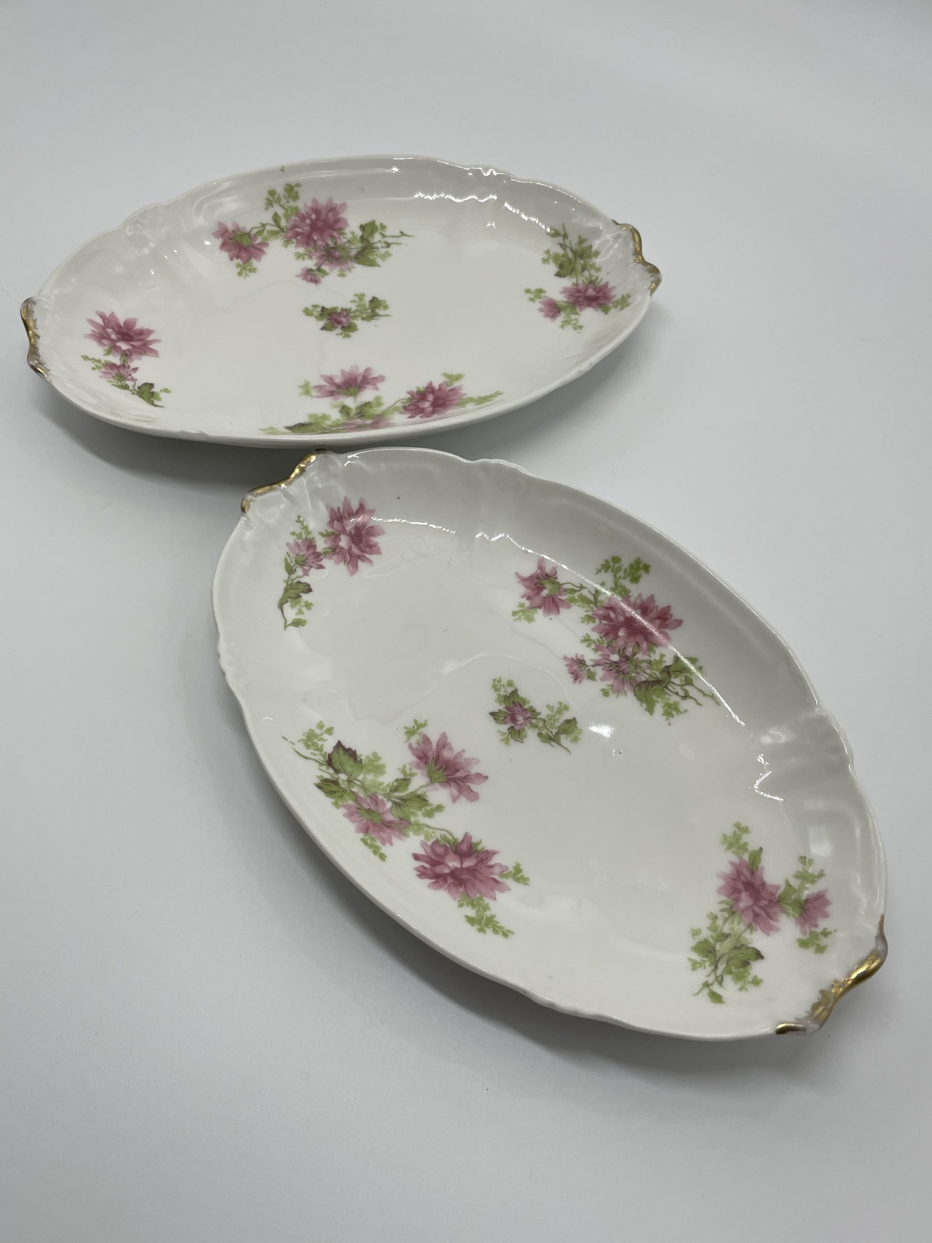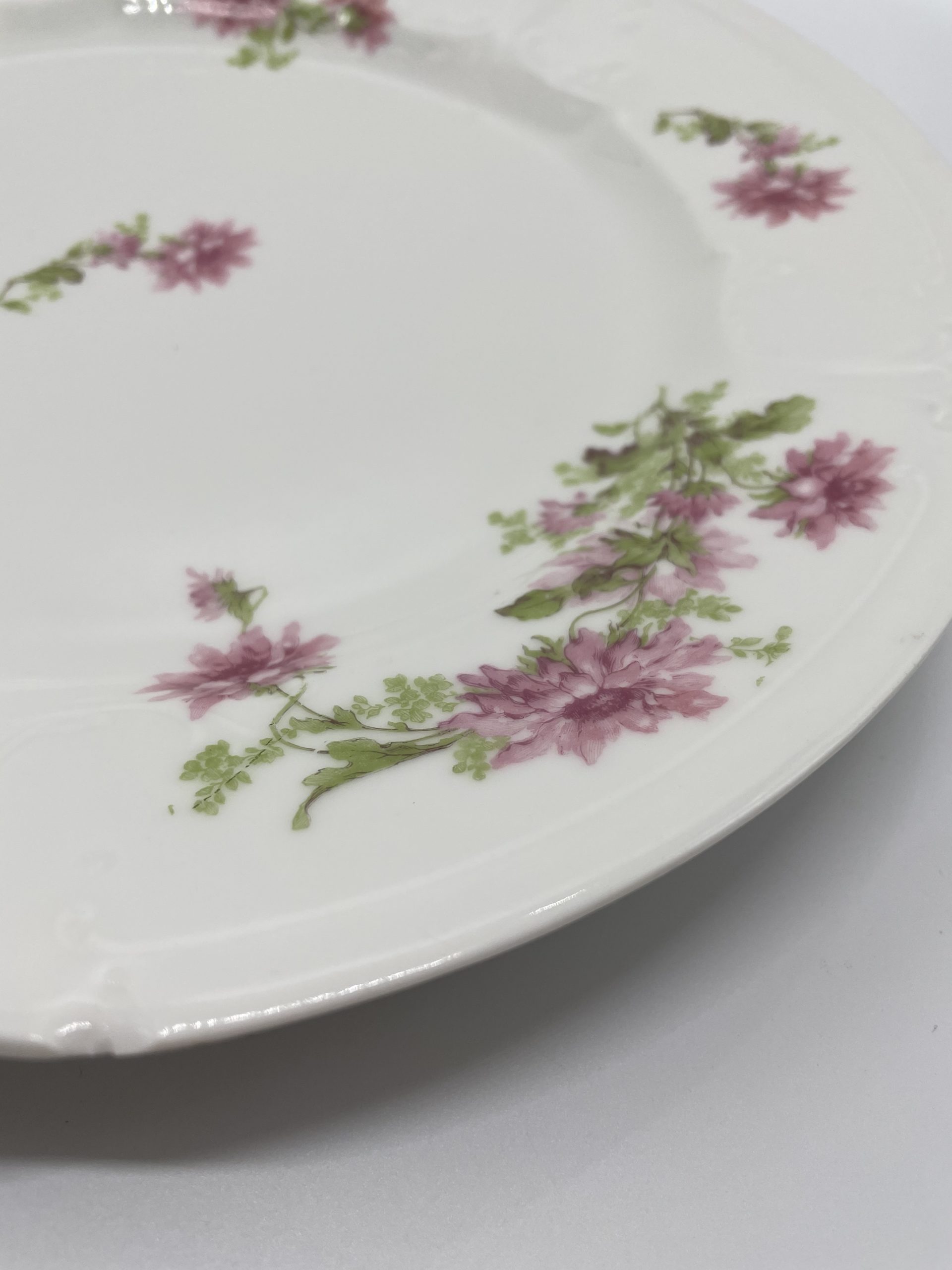 Joli service en porcelaine de Limoges estampillé «SM» composé de 16 assiettes plates de deux diamètres différents, d’1 serviteur sur pied, de petits plats, d’1 plat de service, d’1 soupière et d’1 petit serviteur. Le service est décoré de petites fleurs roses. En excellent état, c’est un service très élégant qui apportera élégance et raffinement à votre table ! Mettez les petits plats dans les grands !
