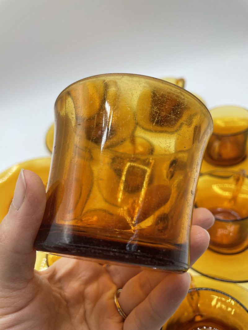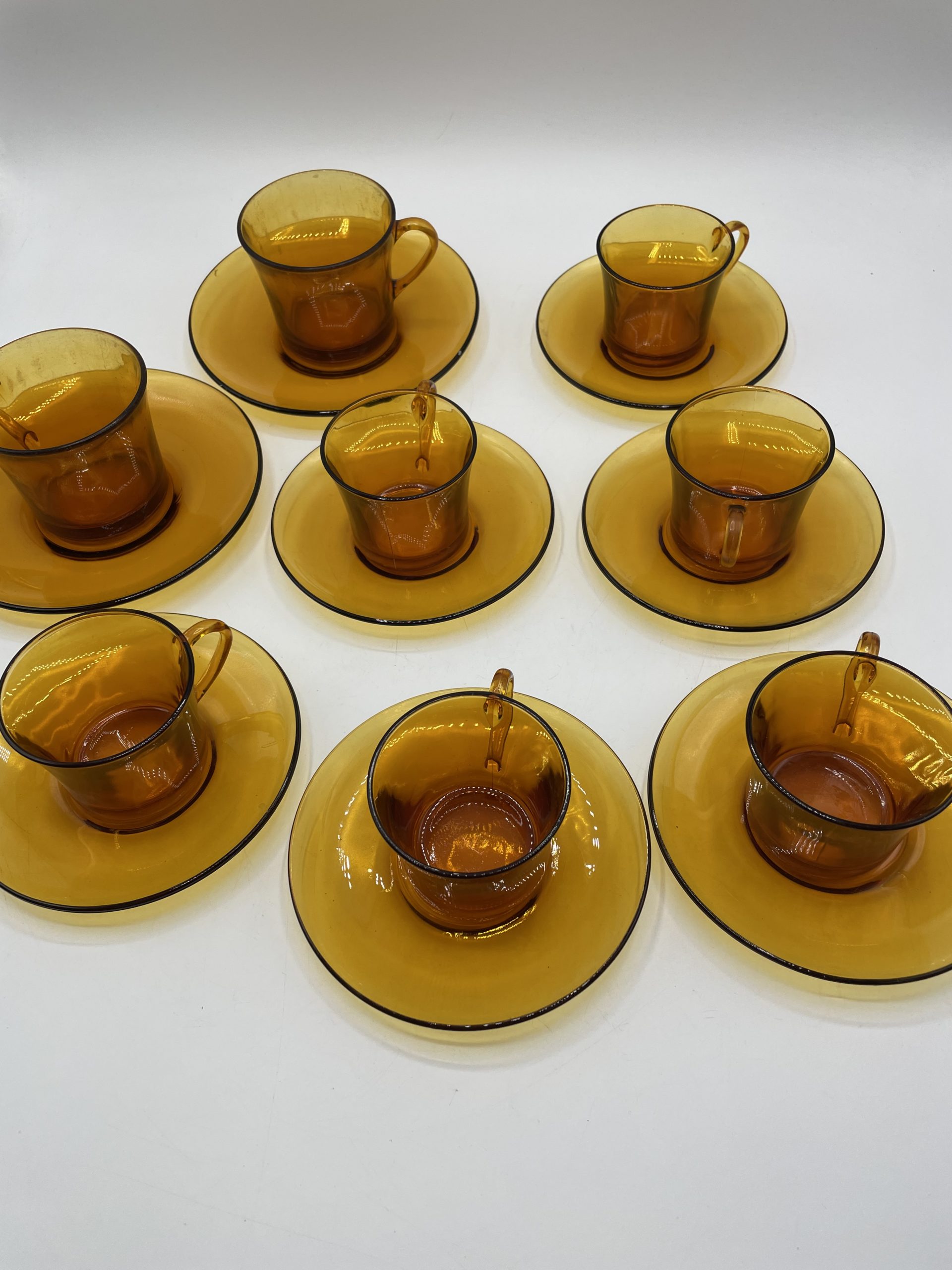 Ce joli service de 16 pièces se composent de 6 petites tasses à café, de 2 grandes tasses et de 8 soucoupes de différentes tailles assorties. En verre couleur ambre, le service est estampillé Duralex France. Vintage, des traces d’usure sont à prévoir (cf photos) jolies marques du temps passé. Un magnifique service qui vous replongera en enfance, parfait pour servir le café d’après repas ou pour le petit déjeuner !