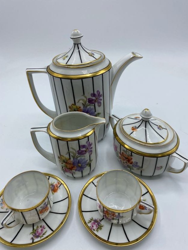 On craque d’amour pour ce joli service à thé qui se compose de 2 tasses à café, de 2 soucoupes, d’1 pot à lait, d’1 sucrier et d’1 théière assortis. Estampillé Mabendorf 1882, le service est en céramique de couleur blanche et décoré de motifs de fleurs de couleur mauve, jaune, orange et bleues, ainsi que de dorures et de fins traits noirs. Vintage, de légères traces d’usure sont à prévoir (cf photos) jolies marques du temps passé. Un service sublime idéal pour l’heure du thé.