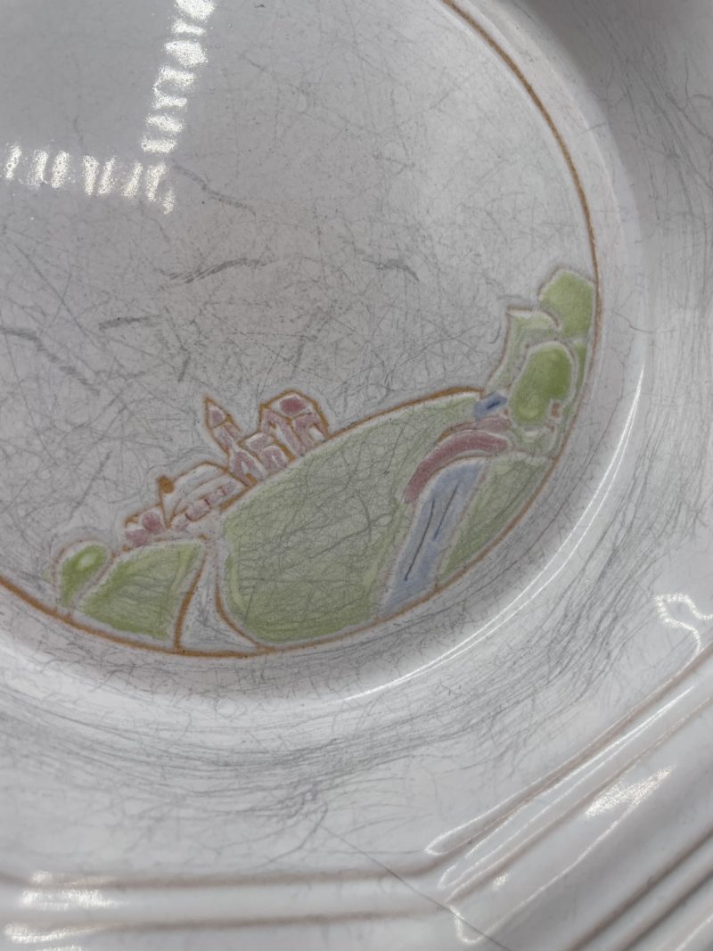 Ce joli service en faïence estampillé « NIDERVILLER PEINT FRANCE MAIN 1748 1770 » se compose de 8 assiettes creuses et de 32 assiettes plates de deux diamètres différents. Ce service est joliment décoré à la main avec un décor champêtre aux tons pastel représentant une vue d’un village sur une colline, décor inaltérable ! Quelques traces d’usure, jolis témoins du temps passé.
