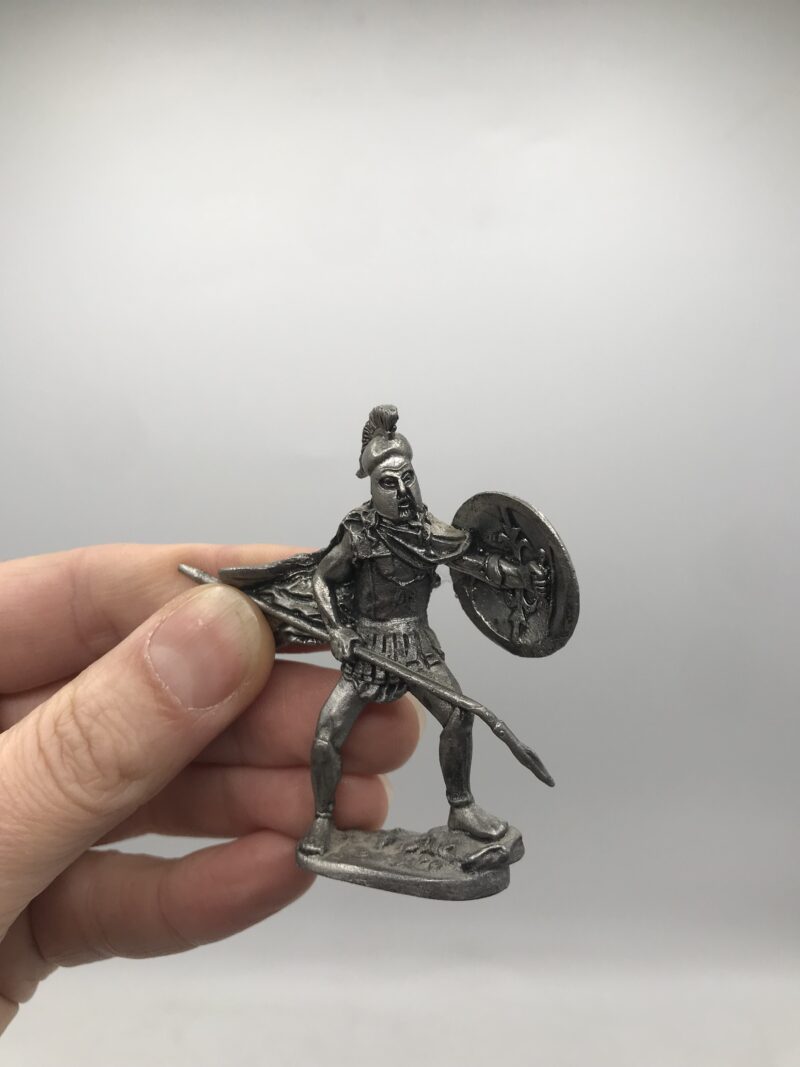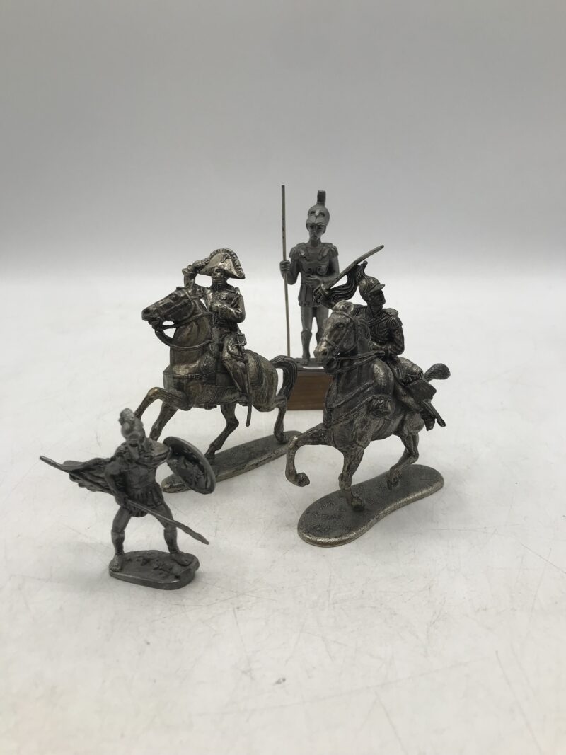 Lot de soldats en plomb et étain. Amoureux des jouets anciens, voici un joli lot composé de 4 soldats et 2 chevaux. Nous avons donc un premier duo soldat cheval, le soldat brandi une épée sur un cheval qui court. Il est noté en dessous Made in France. Le soldat a une hauteur de 8 cm, le cheval lui a une hauteur de 9 cm. Le deuxième duo est formé de Napoléon qui fait le salut sur un cheval qui cabre. Napoléon a une hauteur de 7 cm et son cheval 9 cm. Il est également noté dessous Made in France. Le troisième personnage est un gladiateur qui a une hauteur de 6 cm. Le dernier soldat qui lui est en étain est sur un carré de bois il a une hauteur total de 11 cm. Il est noté étain d’art ciselé main. Ils sont tous en parfait état.