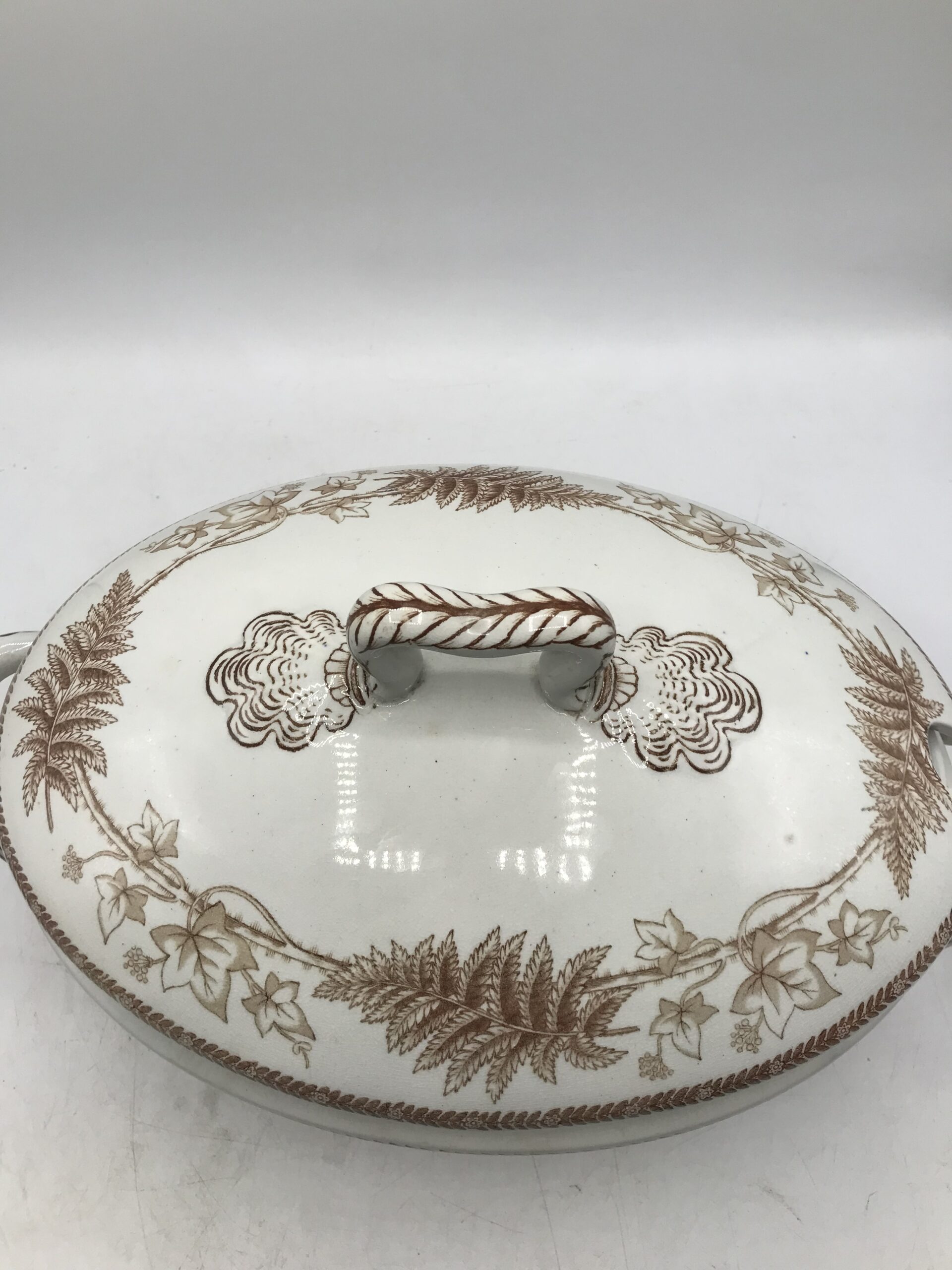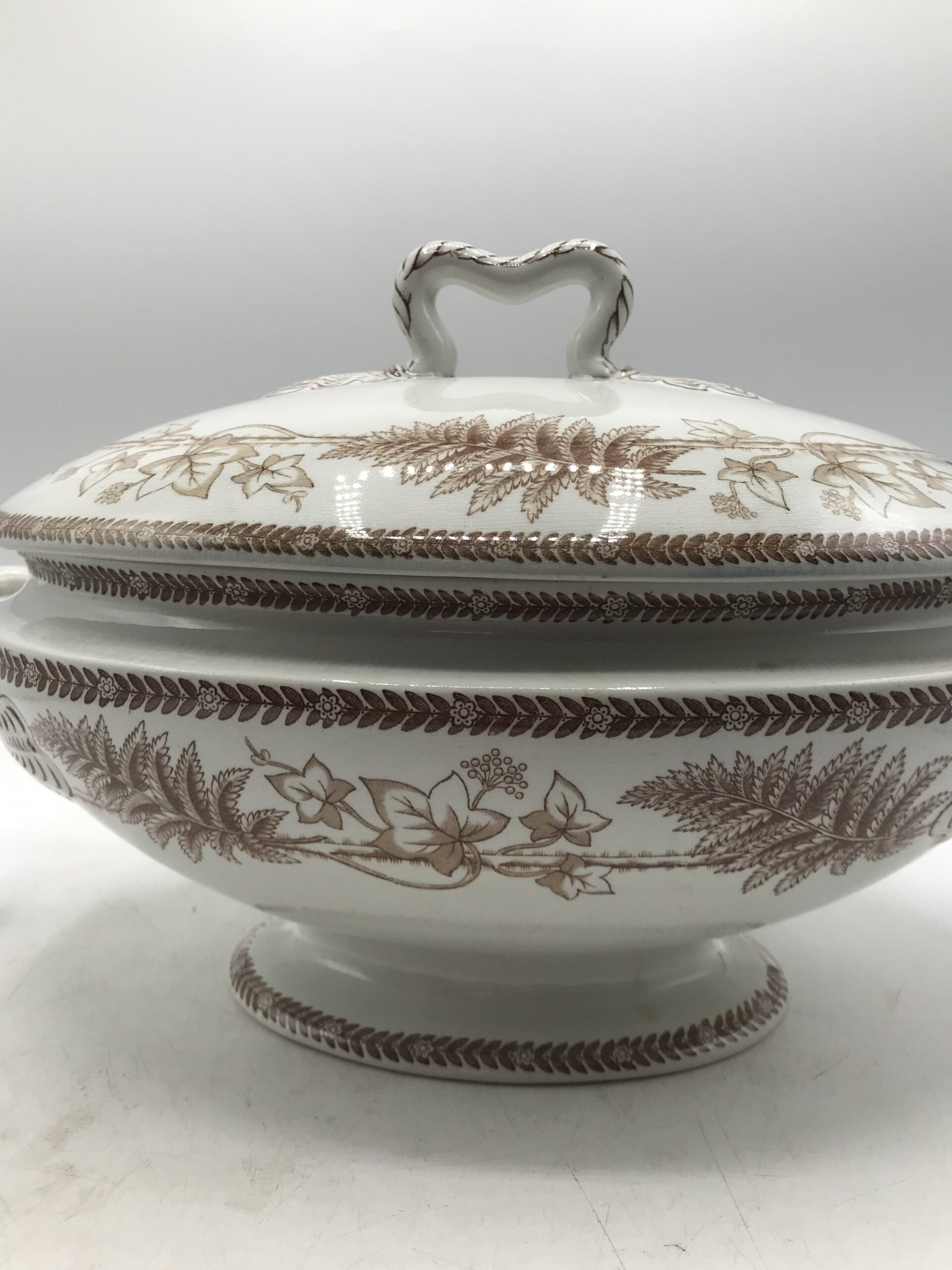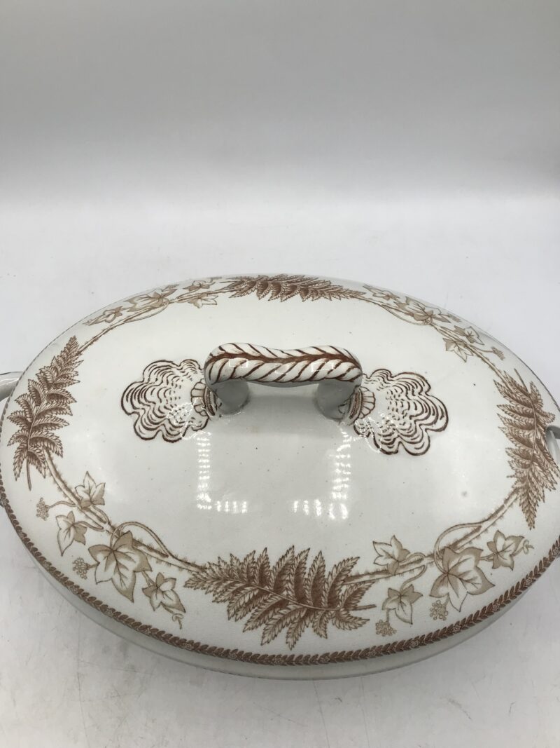 Soupière et son plat JD&S Supérior English porcelain. Superbe soupière et son plat en porcelaine des années 70 JD&S. La soupière de forme ovale est en bon état générale. Elle porte des marques de patine à l’intérieur ( cf photos). Mais aucun éclat. Le plat lui à un diamètre de 29 cm pour une hauteur de 2,5 cm, il porte également des traces de patine et un petit éclat à l’arrière. Très belle collection habillée des décors de couleur cacao, représentants du lierre et des feuilles de fougères. Bel esprit doux et automnale. Un duo gagnant pour une table pleine de charme et de douceur. Avis aux amateurs de porcelaine Anglaise.