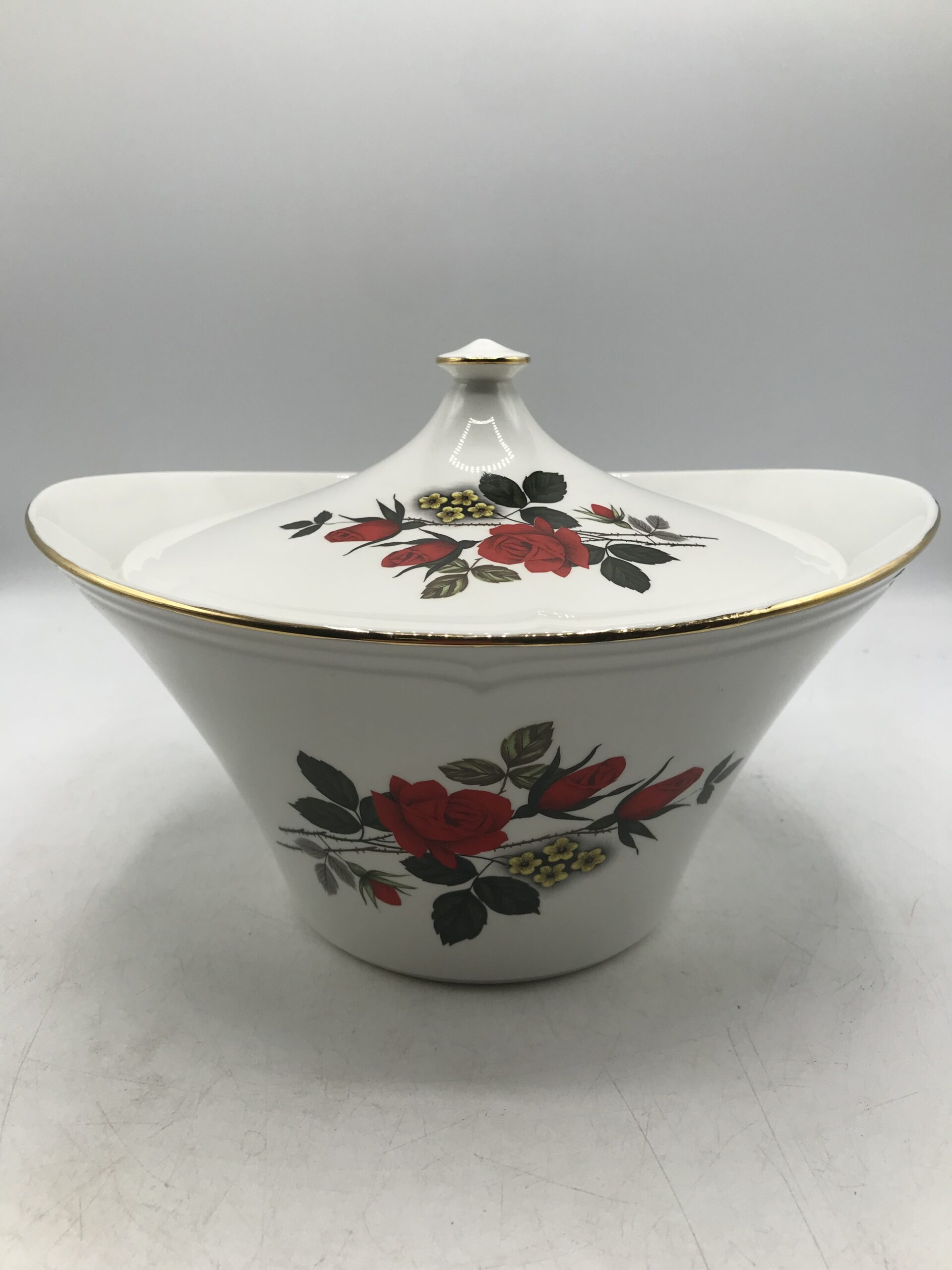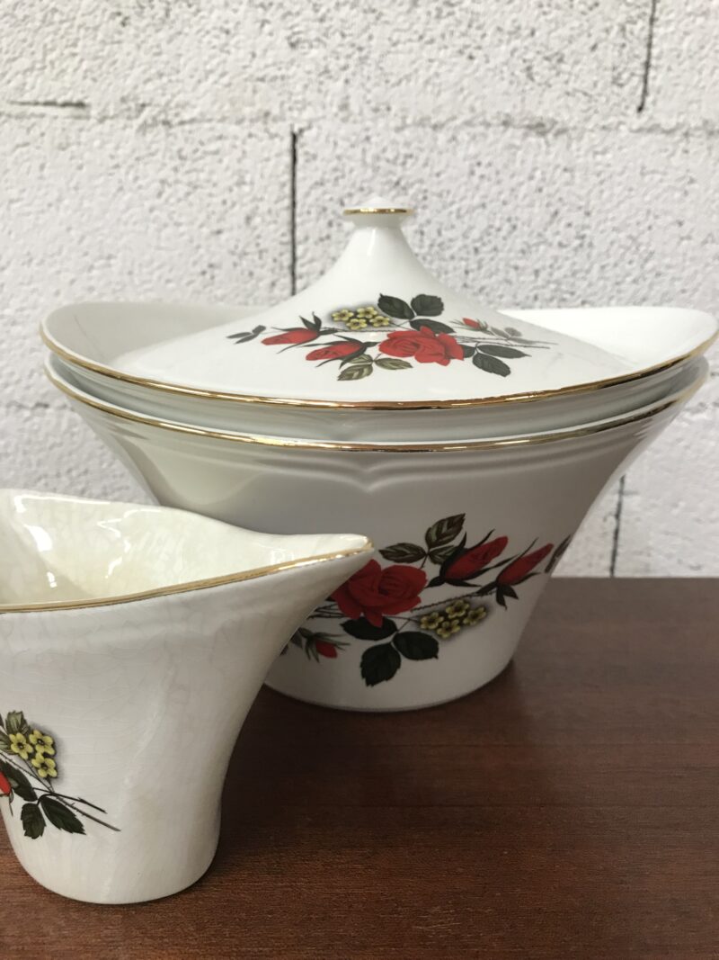 Alerte pépite !!! Soupière, saladier et saucière Moulin des loups. Magnifique service en faïence blanche estampillé Moulin des Loups Orchies. Le service fait partie de la collection “Carmen”. Il est décoré d’un magnifique motif de roses rouges, de petites fleurs jaunes et de liserés dorés. La soupière a un diamètre de 24,5 cm pour une hauteur de 14 cm sans couvercle, a noter deux trois points de patine (cf photo). Le saladier a un diamètre de 24 cm pour une hauteur de 13,5 cm. Et pour finir, la saucière qui est en bon état mais porte une belle patine (cf photo). L’ensemble est en bon état pas d’éclat quelques légères marques d’usure. De la vaisselle signée comme on l’aime. Simple, belle, ancienne, signée et remarquable. Avis aux amateurs de belles tables.
