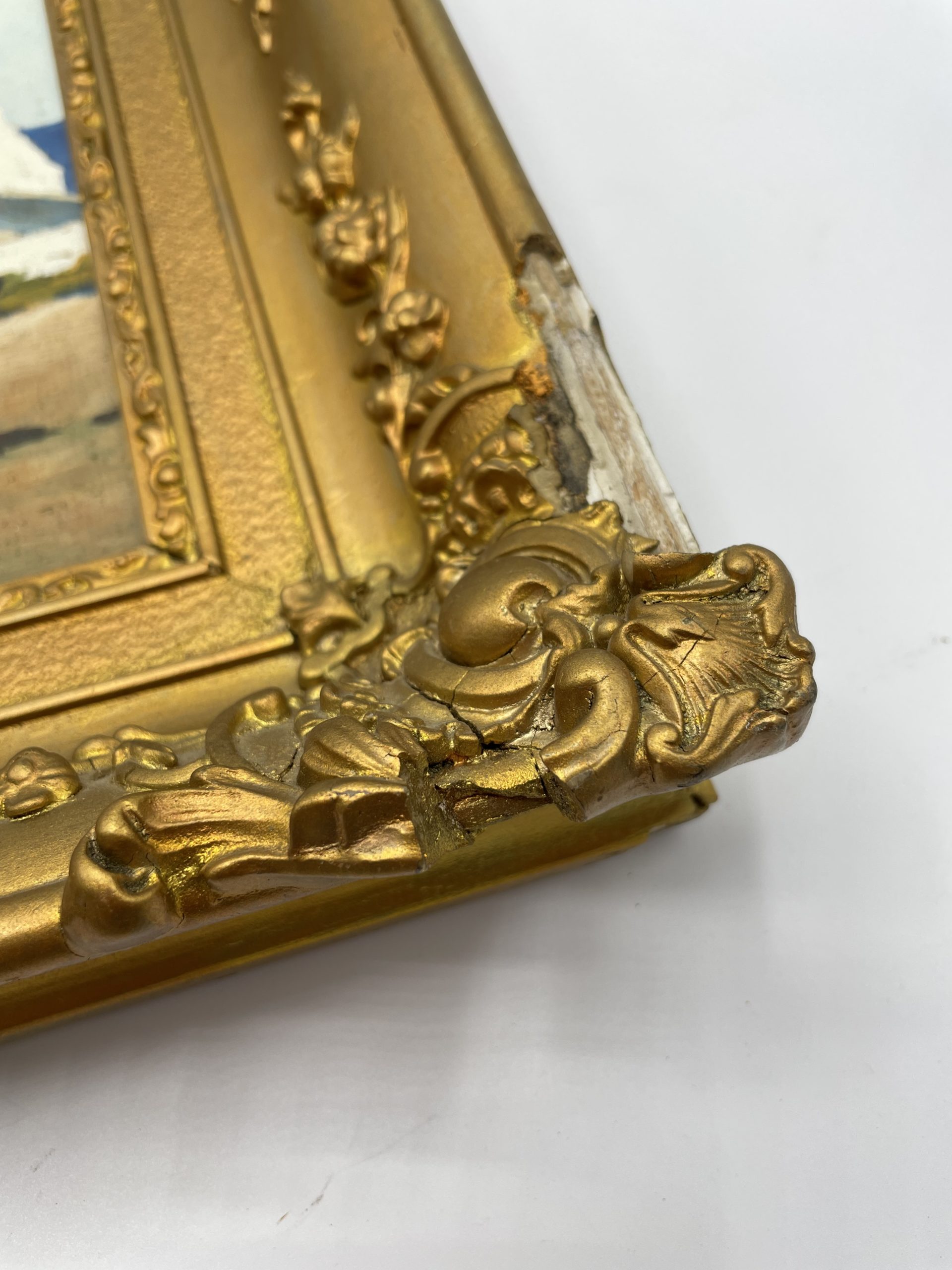 Ce joli tableau représente un paysage de bord de mer d’une maison blanche sur la plage en Bretagne. Datée de 1981, la peinture est signée G.B et elle est encadrée dans un cadre couleur doré. Le cadre est fêlé et abîmé sur plusieurs endroits (cf photos) jolies marques du temps passé. Sur le dos du tableau il est écrit : « Qu’est-ce que créer? C’est, entre autres besoins, celui d’exprimer, transcrire, une émotion, un souvenir. L’émotion, pour moi, c’est la grande affection que je porte à mes amis. Le souvenir, c’est ma Bretagne si douce, si belle, qui semble me lancer un appel… ». Très jolie peinture à la fois réaliste et apaisante qui rappellera les vacances face à l’océan.