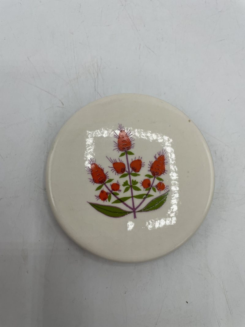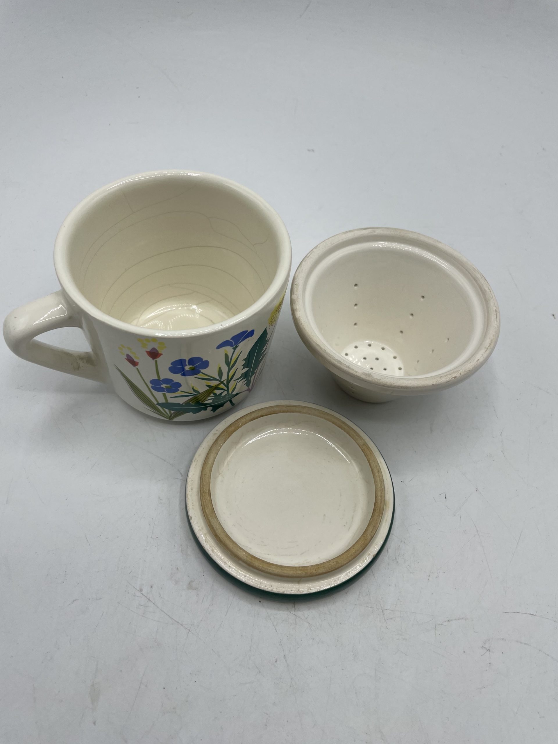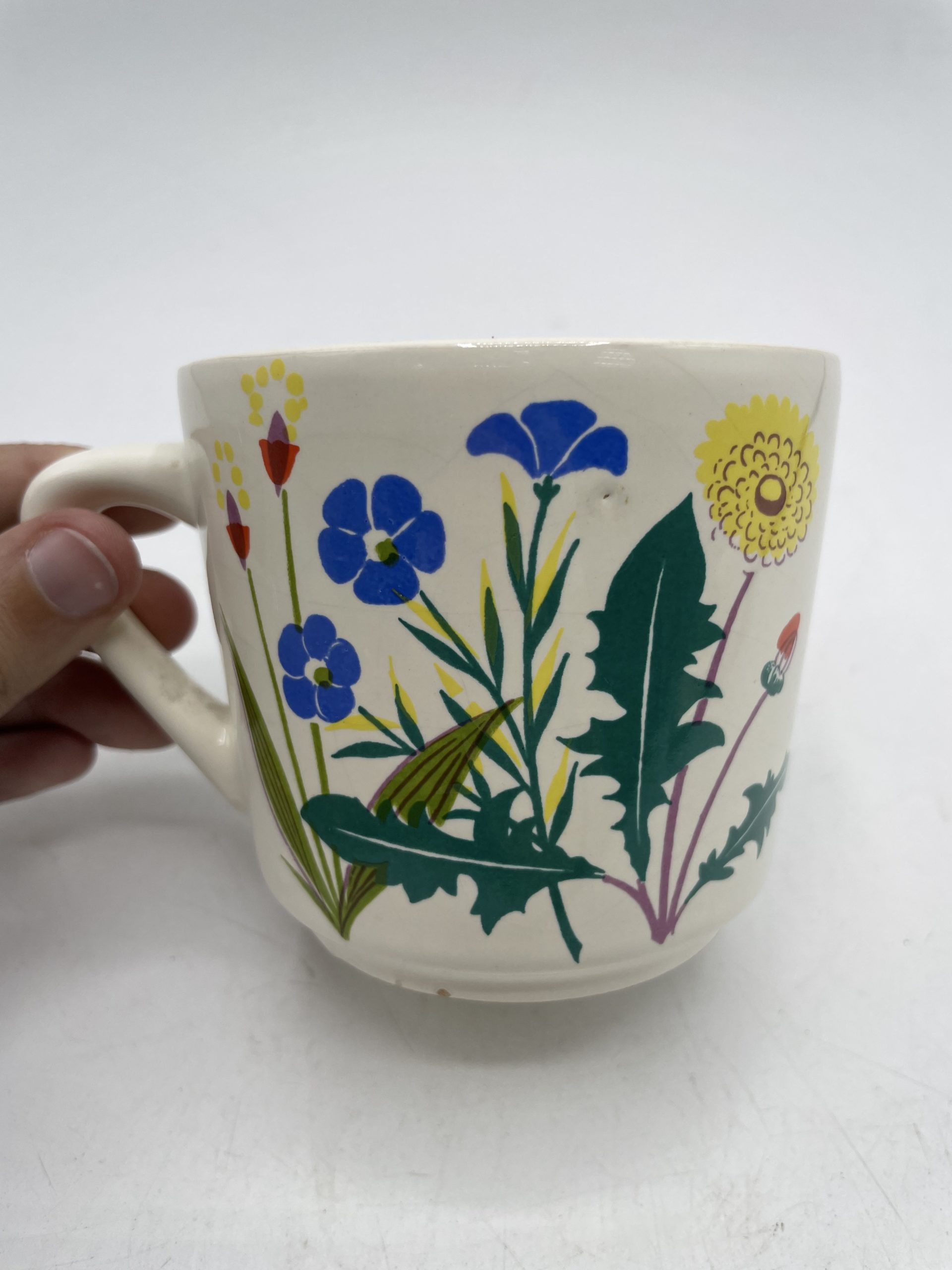 On craque d’amour pour ce joli mug à thé. En céramique, le mug est marqué Waechtersbach et il arrive d’Allemagne de l’Ouest de l’époque de l’URSS. De couleur beige, le mug est décoré de motifs de fleurs de style naïf de couleur verte, rouge, jaune, bleue et violette. Le mug est fourni avec un infuseur à thé intégré et un couvercle décoré d’un motif de fleur et d’un liseré vert pour maintenir le thé au chaud. Vintage des traces d’usure sont à prévoir (cf photos) jolies marques du temps passé. Un joli mug ou une tasse bien pratique pour votre thé du matin ou e l’après-midi !