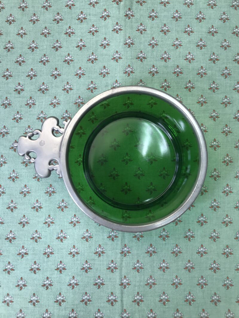 Superbe tasse à vin étain du manoir Paris. Elle est en verre de couleur vert bouteille et le reste en étain. Une belle pièce vintage qui peut servir de vide poche ou autre, à vous de voir. Dans un très bon état rien de spécial à dire. Cette tasse est prête à retrouver une maison et a vivre de nouvelle aventure. Elle à un diamètre de 12 cm pour une hauteur de 4,5 cm. Une petite pièce déco qui se fera remarquer.