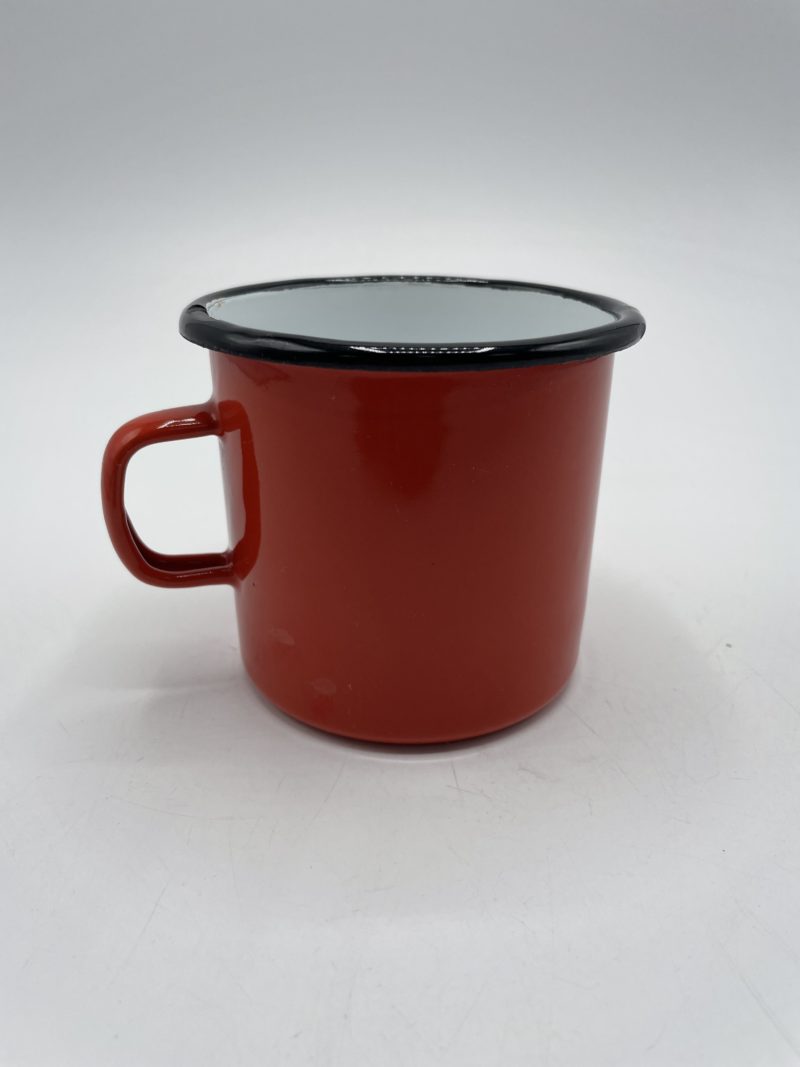 On craque d’amour pour cette jolie tasse vintage. En métal émaillé, la tasse est de couleur rouge et elle est décorée d’un liseré noir. De grandes dimensions, la tasse est parfaite pour boire un bon café chaud, un thé ou une tisane. Vintage, des traces d’usure sont à prévoir (cf photos) jolies traces du temps passé. Une jolie tasse hyper résistante pour le camping ou pour donner à votre cuisine un coté rétro !