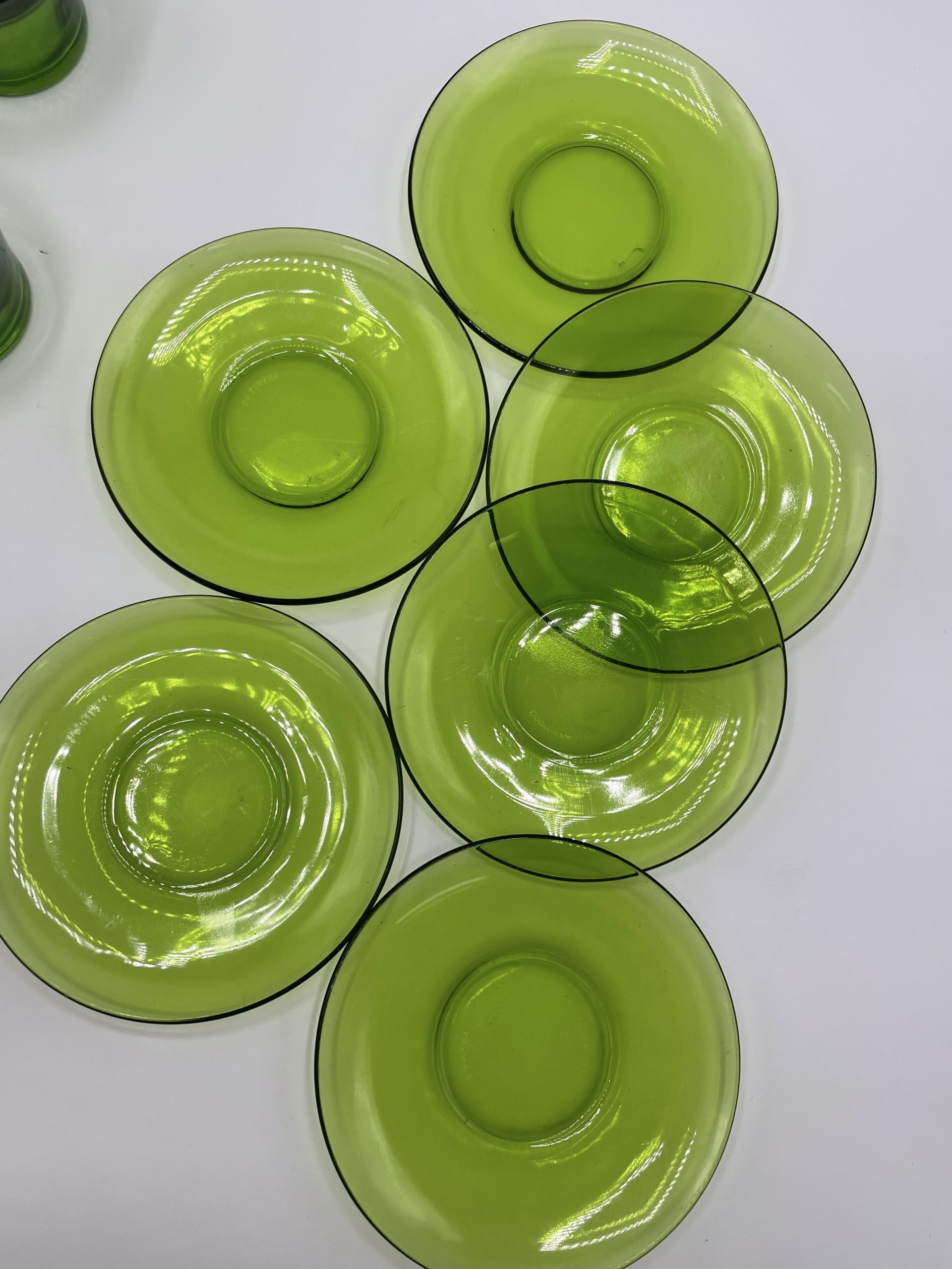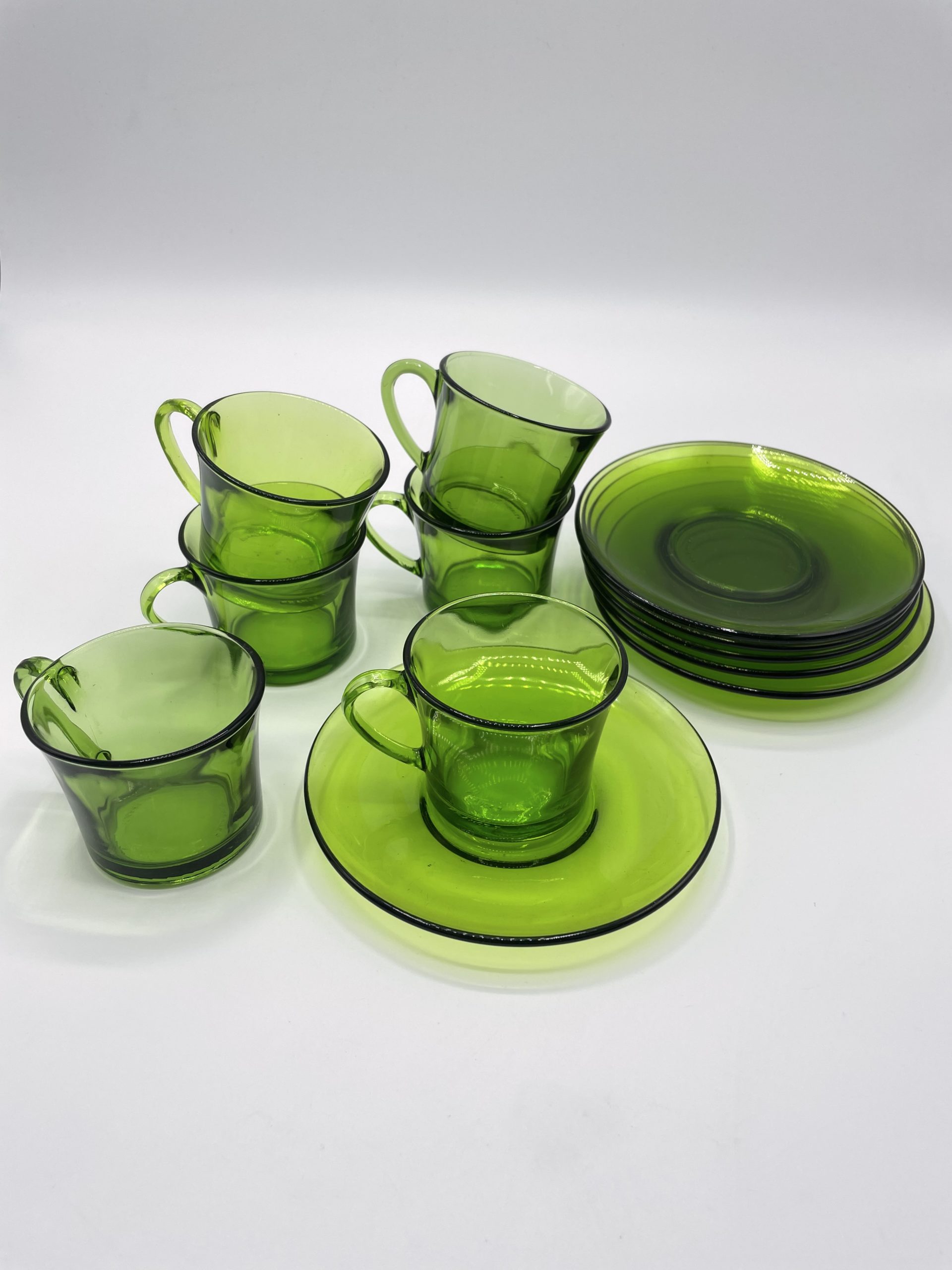 Très joli service à café vintage en verre de couleur vert pomme de la marque française Duralex des années 60. Le service est complet et il est composé de 6 tasses à café et de leurs soucoupes assorties. Quelque traces d’usure sont à prévoir (cf photos), jolies marques du temps passé. Esprit rétro et vintage assuré pour une pause café énergisante !
