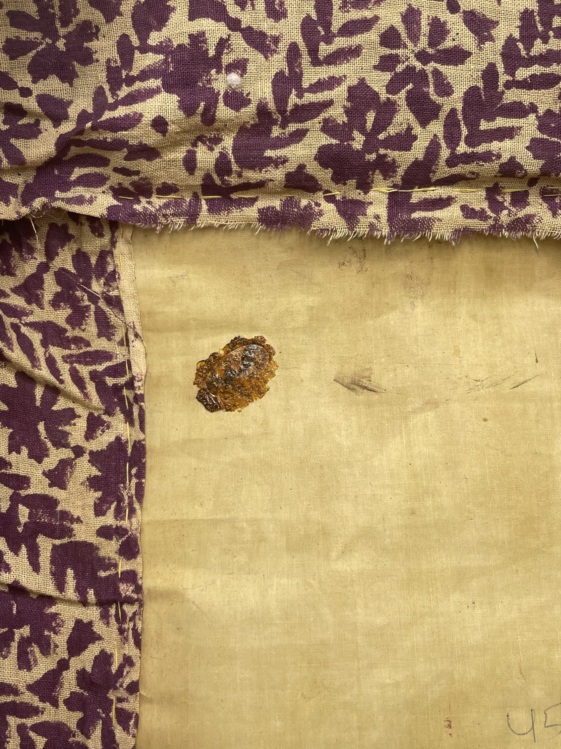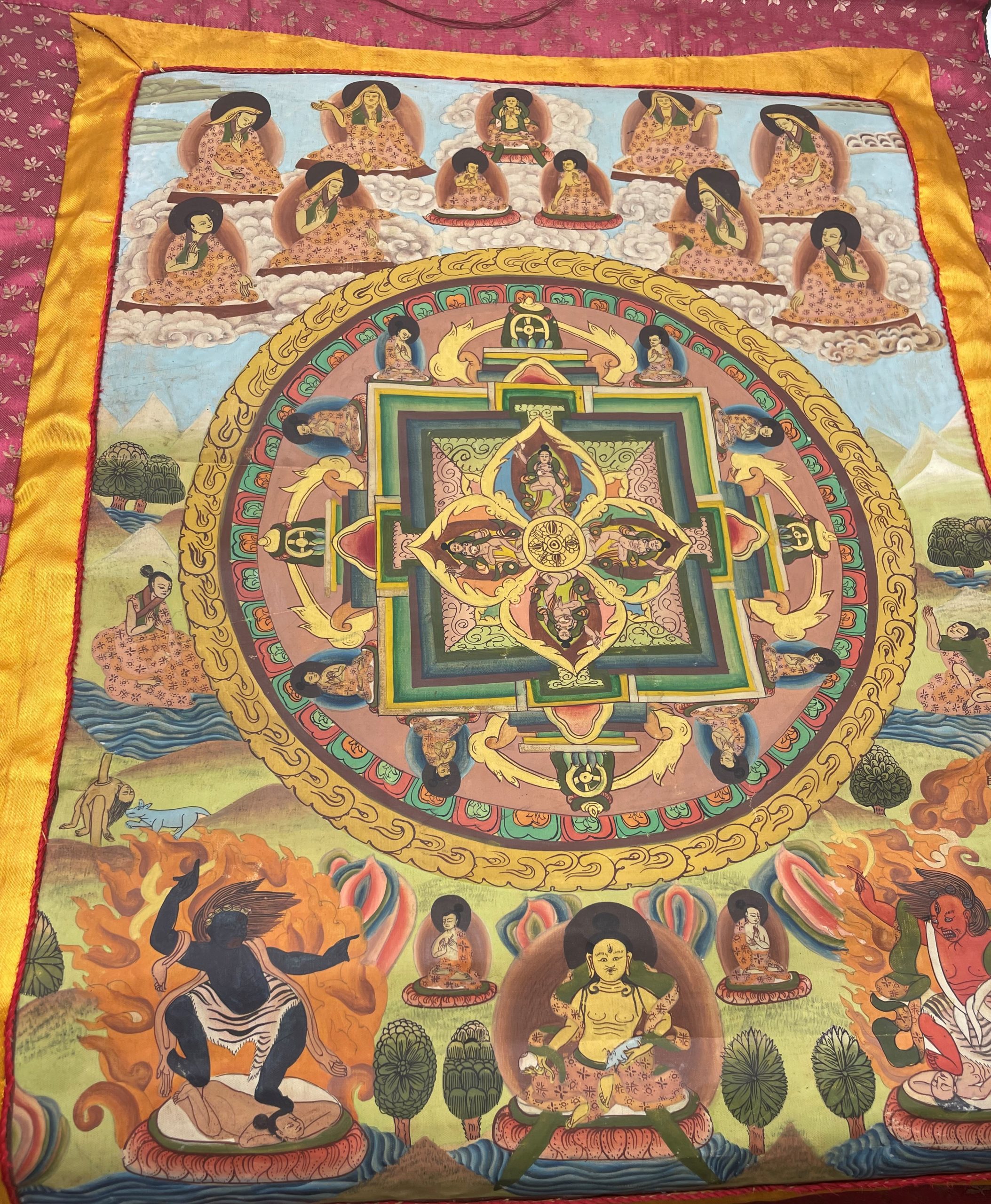 Cette jolie tenture murale est en réalité une illustration sur parchemin réalisée à l’encre et à la peinture. L’illustration représente le Samsara, la route des vies et des morts, qui juge de l’action des hommes pour les envoyer en enfer ou au paradis dans la roue du karma. Ainsi au centre on aperçoit une rosace de bouddhas et en haut du parchemin la représentation des paradis et en bas celles des enfers avant la résurrection de l’âme ou le Nirvana. La tenture en coton a plusieurs couches et doublures. Richement décorée, elle est de couleur orange et framboise et doublée d’un tissu beige à imprimés floraux mauves. Le parchemin contient une inscription à l’arrière qui ressemble à du tibétain ainsi qu’an cachet de cire. Magnifique !