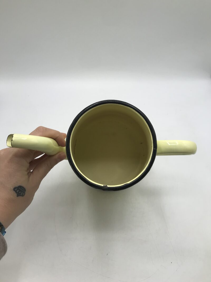 Alerte pépite !!! Magnifique théière en émail de couleur jaune clair. Une superbe pièce vintage pour compléter votre déco de cuisine ou autre. Elle est composée de trois pièces le broc, le filtre à thé et le couvercle. L’émail à traversé le temps donc elle présente des traces d’usure et de rouille ce qui en fait son charme. Un petit bout d’antan. Avis aux amateurs.