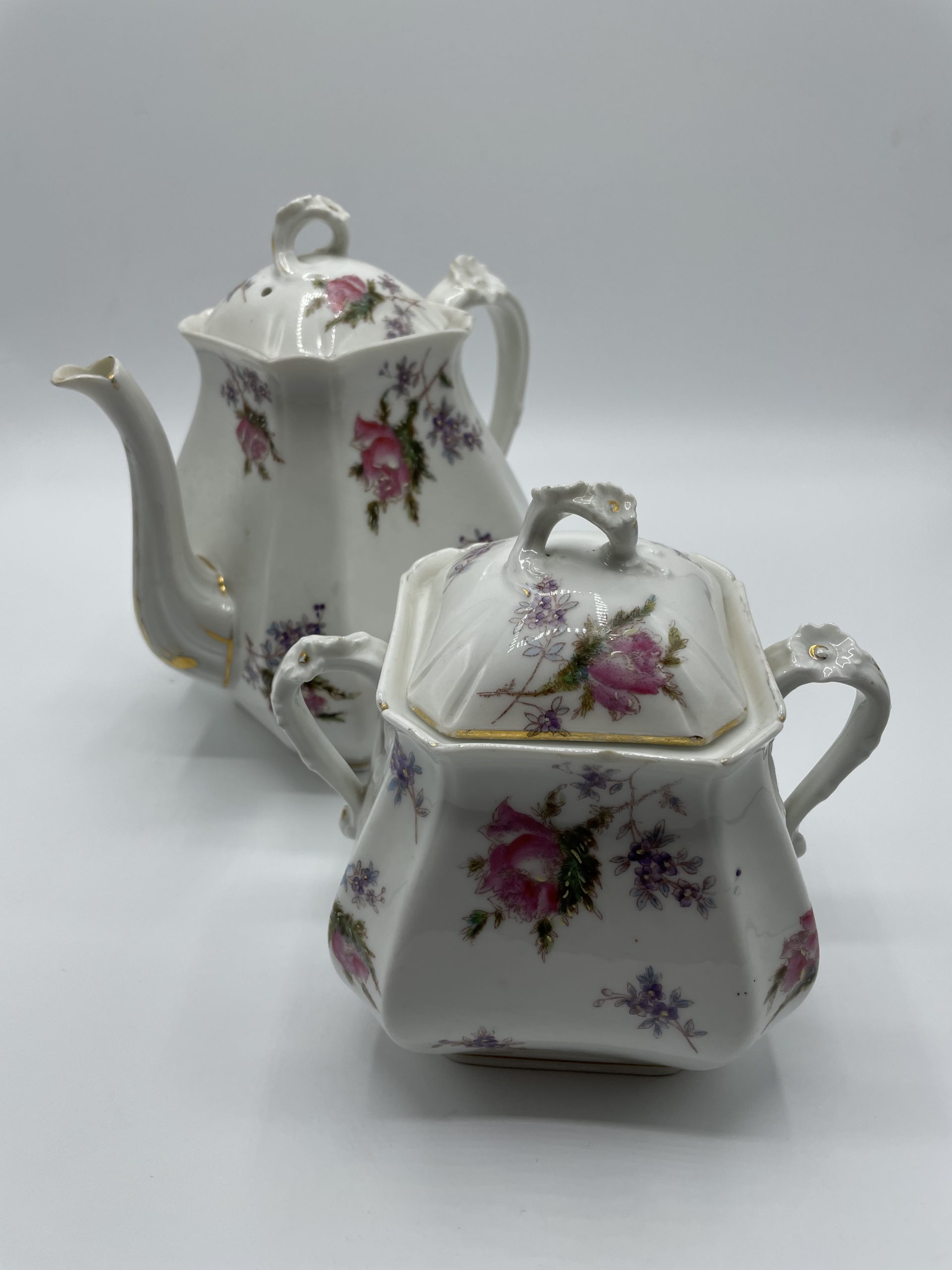 Joli duo d’une théière et de son sucrier assorti. Les deux éléments sont en porcelaine française signée « CFH 6DM » et sont décorés avec un motif de fleurs des champs roses et violettes et de liserés dorés. Avec son esprit champêtre e romantique, ce joli lot viendra compléter votre service à thé pour une pause élégante !