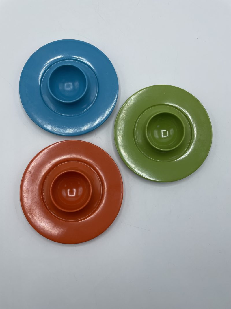 On craque d’amour pour ce joli trio de coquetiers. En mélanmie, ces coquetiers sont robustes te résistants. Avec leurs jolies couleurs pop bleu, orange et vert, ils survitamineront votre repas et votre table ! Fabriqués en Thaïlande, ces jolis coquetiers présentent de légères traces d’usure sans grande incidence sur leur aspect esthétique. Empilables, ils ne prendront pas beaucoup de place dans vos placards. Parfaits aussi pour les enfants, ces jolis coquetiers peuvent être détournés en des bougeoirs funky !