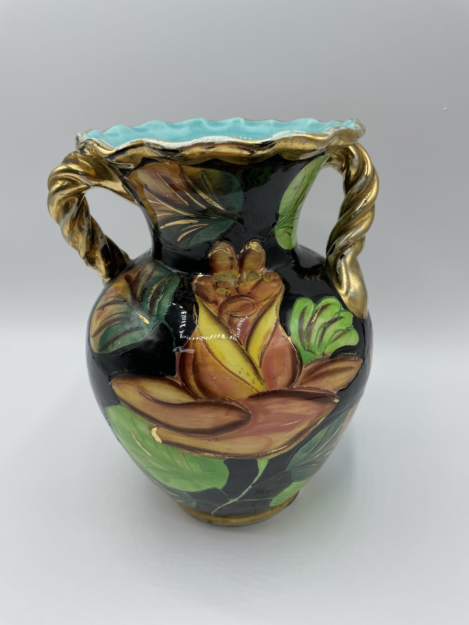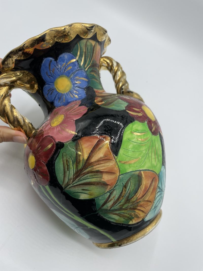 Ce vase en émail cloisonné noir vintage est signé et estampillé Vallauris. Des années50, ce vase vintage est décoré avec des motifs de fleurs multicolores et des détails dorés. Les anses torsadées donne un certain charme antique à ce vase. Vintage, quelques traces d’usure sont à prévoir (cf photos) jolies marques du temps passé. Un joli vase vintage à al fois élégant et intemporel !