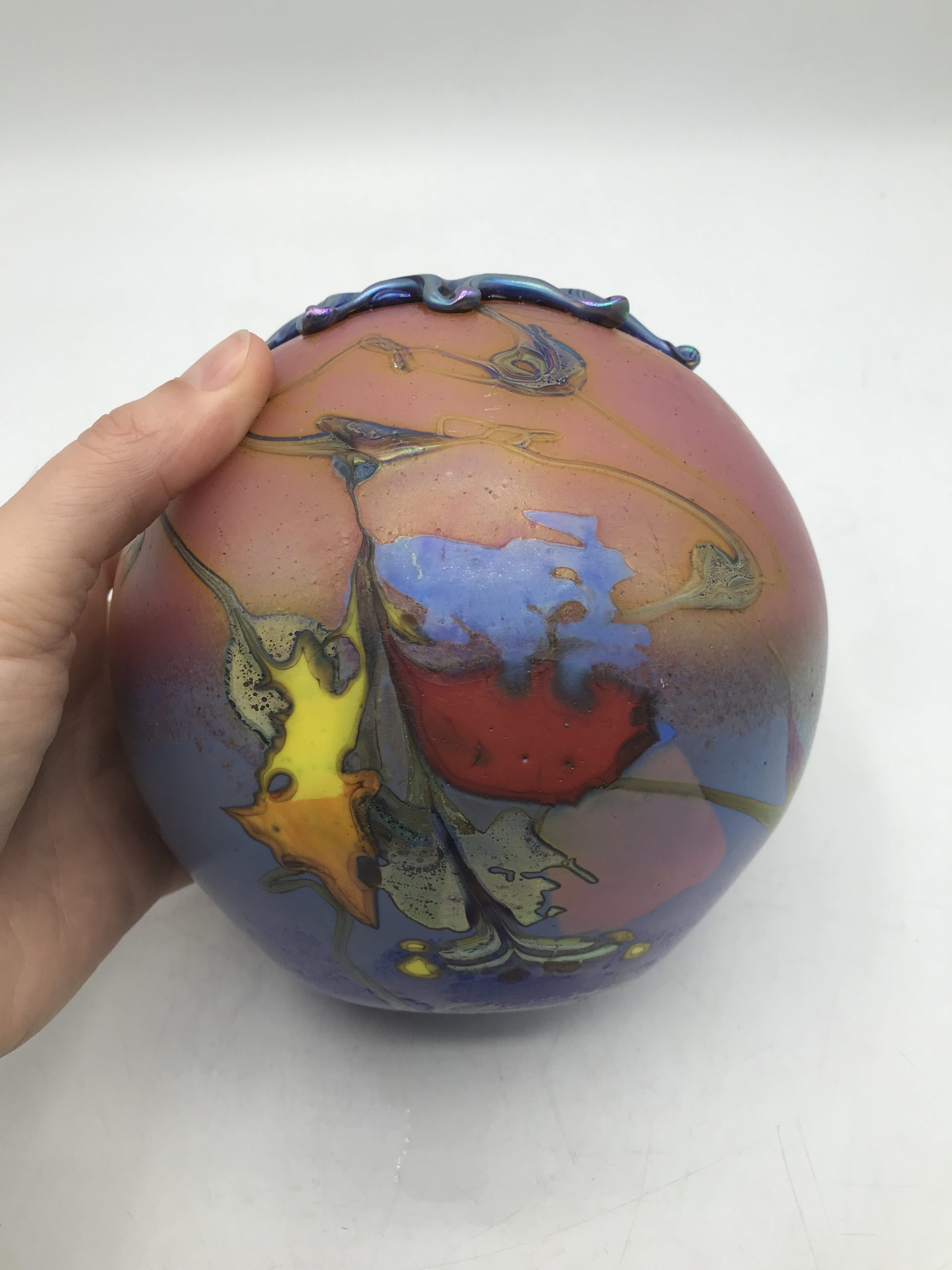 Alerte pépite !! Magnifique vase en verre soufflé par Pascal Guyot et Bernard Aconito, ce vase est signé et daté de 97. Une merveille de mélange de couleurs. Il est habillé d’un « col » en verre soufflé de couleur irisé à tomber ». Une pièce unique qui brillera dans votre intérieur. Une belle touche d’artiste qui mettra en lumière un beau bouquet de fleurs. Avis aux amateurs d’art. le diamètre de l’ouverture du vase est de 5,5 cm.