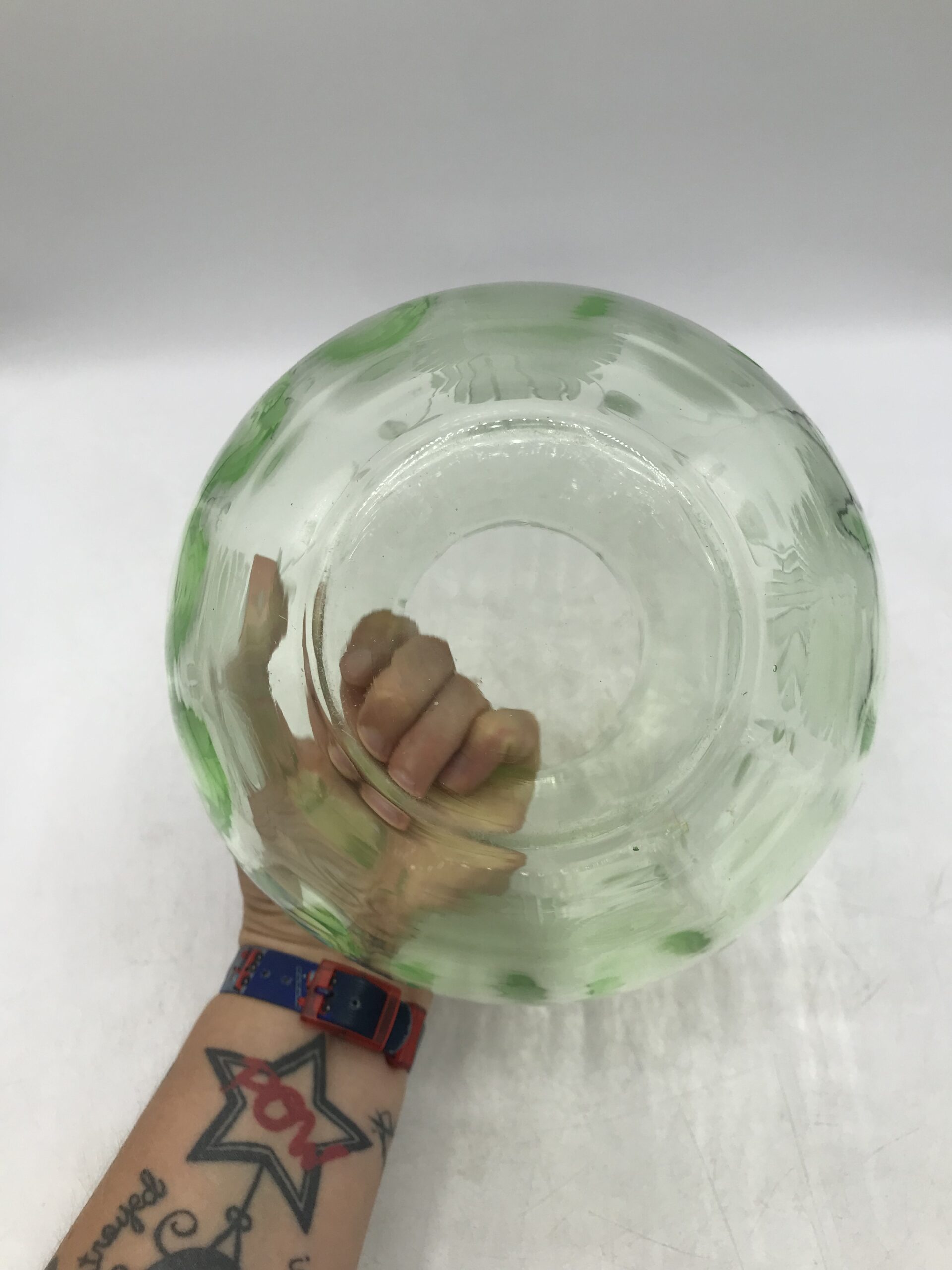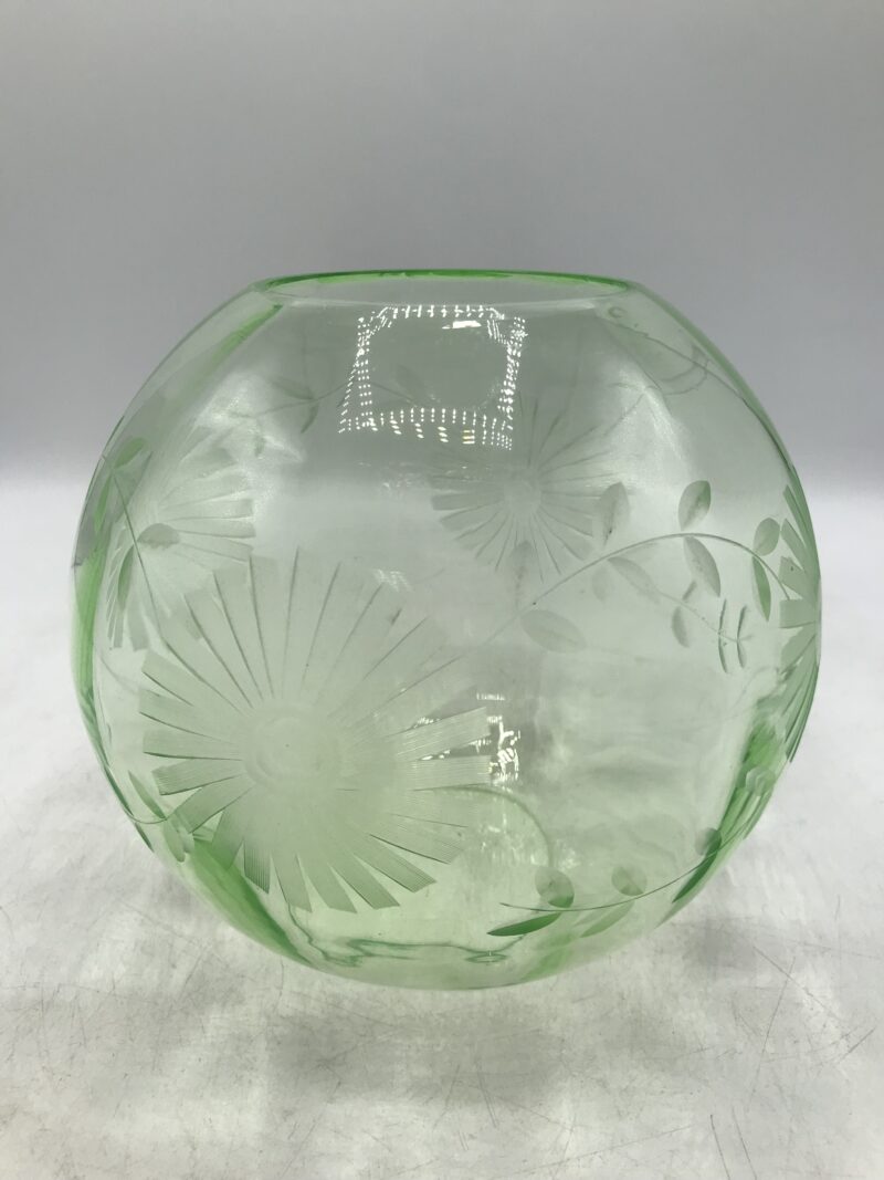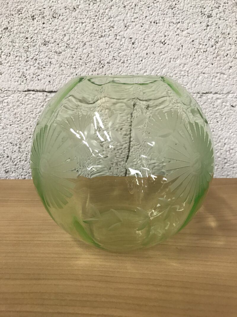 Alerte pépite !!! Vase boule en ouraline. Magnifique vase en forme de boule en ouraline. Le vase est orné des pâquerettes et de branches végétales. Une réalisation toute en finesse et douceur. Avec sa belle couleur verte translucide ce vase est d’une légèreté visuelle à tomber. Envie de fraicheur et d’originalité dans votre décoration intérieur, il est fait pour vous. Il a un diamètre de 17 cm et une hauteur égale. Il est en bon état, à noter des petits éclat sur l’intérieur de la coupe (cf photos). Une merveille, avis aux connaisseurs.