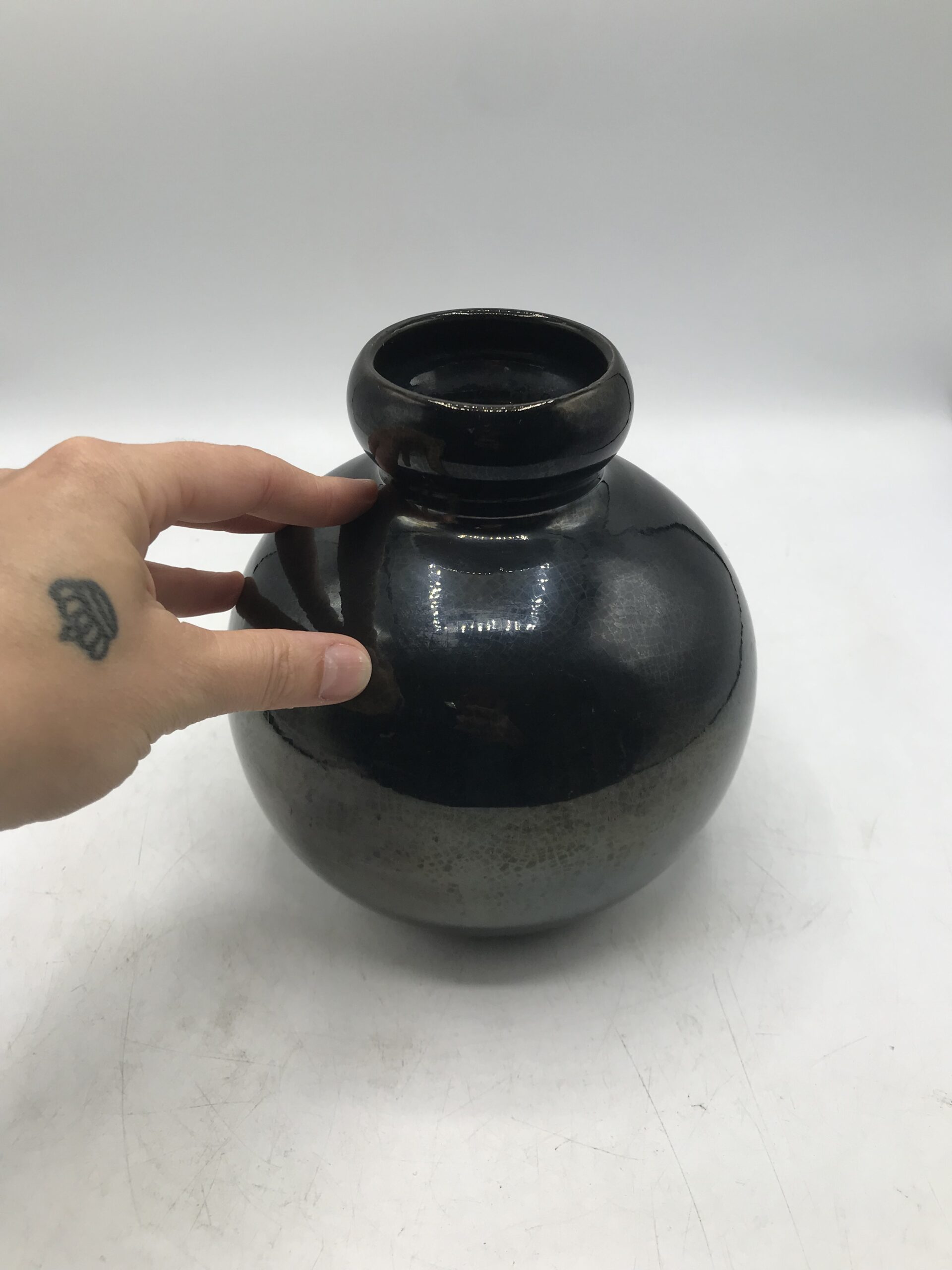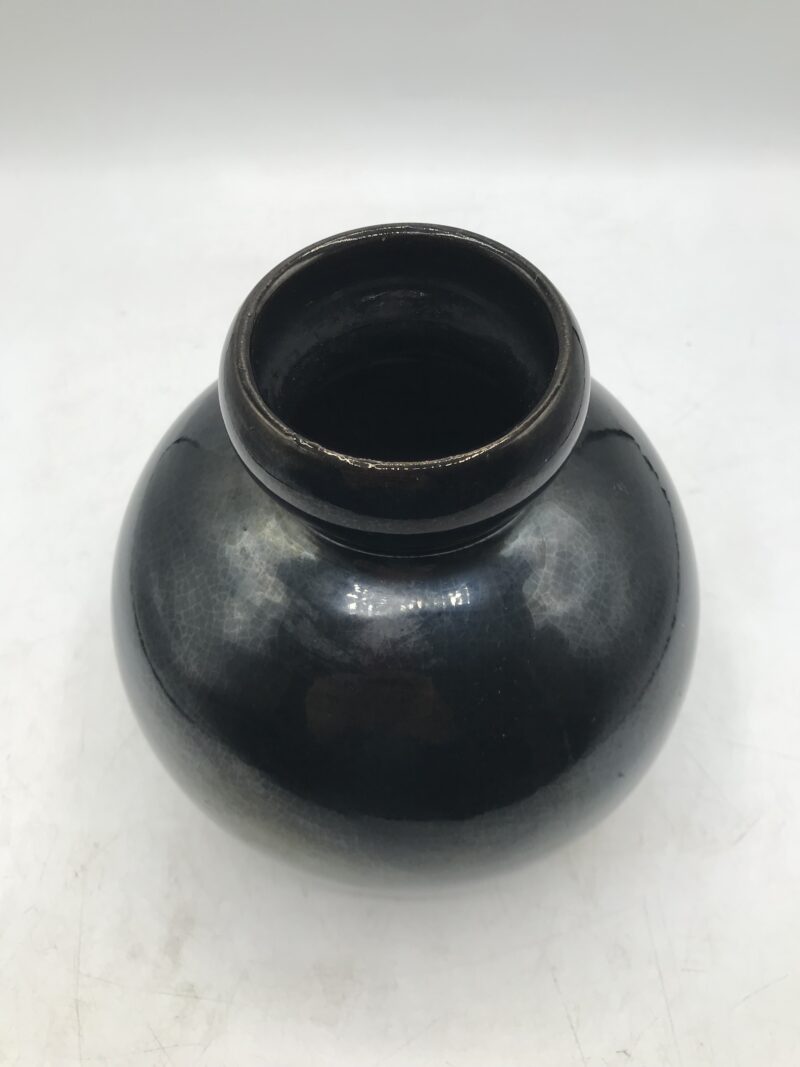 Alerte pépite !!! Vase boule Gaziello Vallauris. Superbe vase signé Gaziello Vallauris 71. Il à un diamètre central de 16 cm, son ouverture fait 7 cm, et une hauteur de 19 cm. Il est d’un noir brillant magnifique. Il à des craquelures qui lui donne un visuel de multitudes de miroirs qui reflètent ce noir profond. Avec sa forme ronde et son col à rebords, il fera sensation dans votre intérieur. Un bouquet de fleurs rose ou rouge feront un contraste magnifique. Un joli vase fait main, signé, en très bon état. Une belle pièce qui vous séduira.