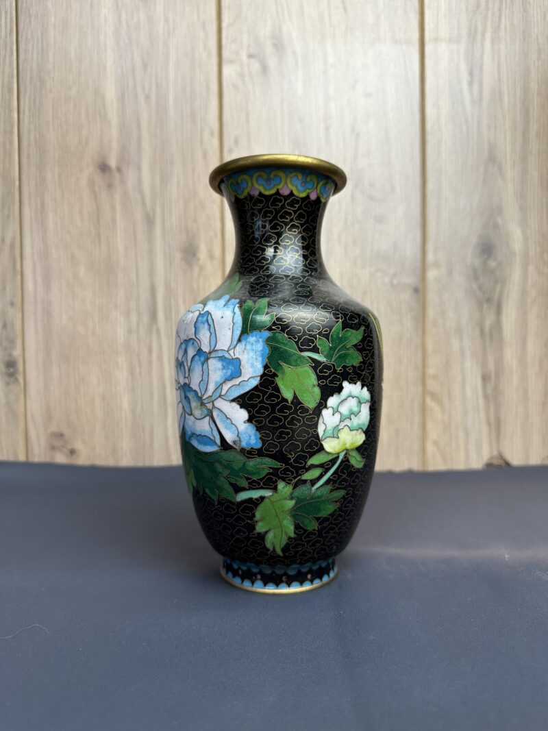 Ce très joli vase cloisonné arbore un décor avec différentes fleurs plus ou moins imposantes, allant du bleu au vert et au rose. Sur un fond noir avec des détails dorés ainsi qu’une frise bleue sur le pied du vase.