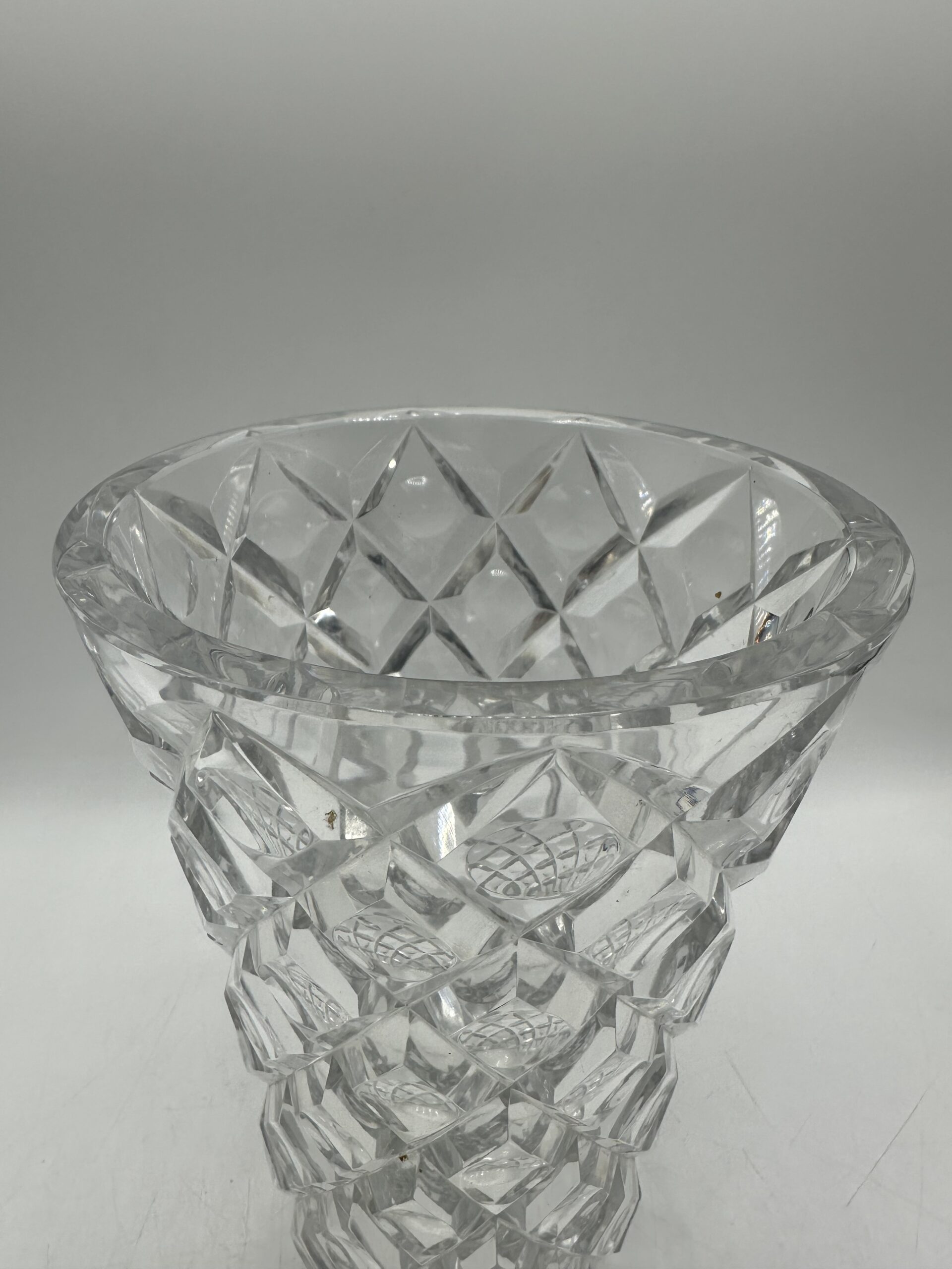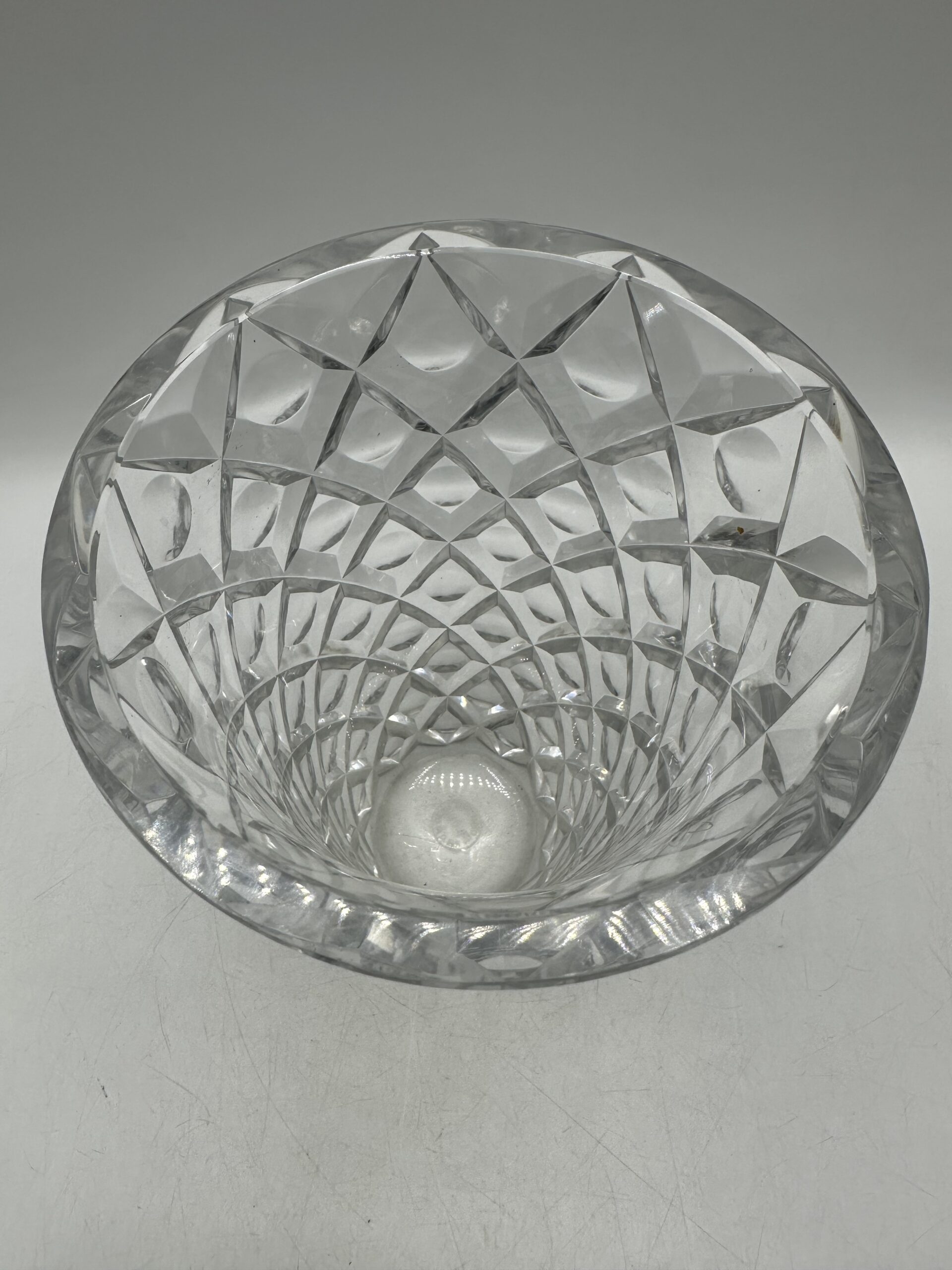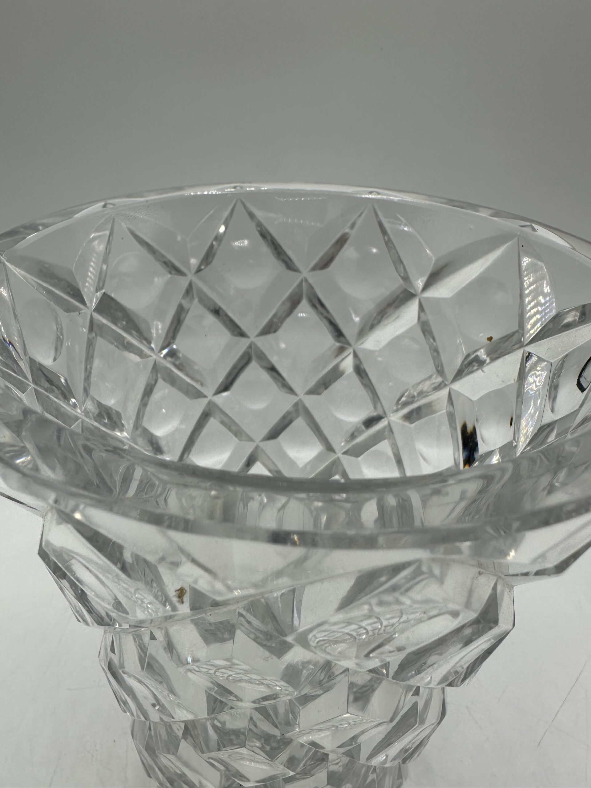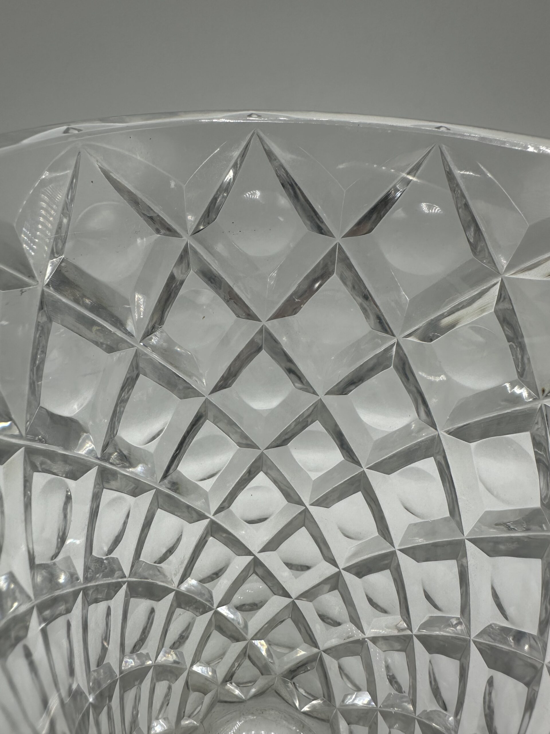 Ce vase présente un magnifique décor ciselé en losanges, avec un rond en leur centre. Ce motif géométrique, typique des créations Saint-Louis, capte la lumière et donne à l’ensemble un jeu de reflets saisissant.