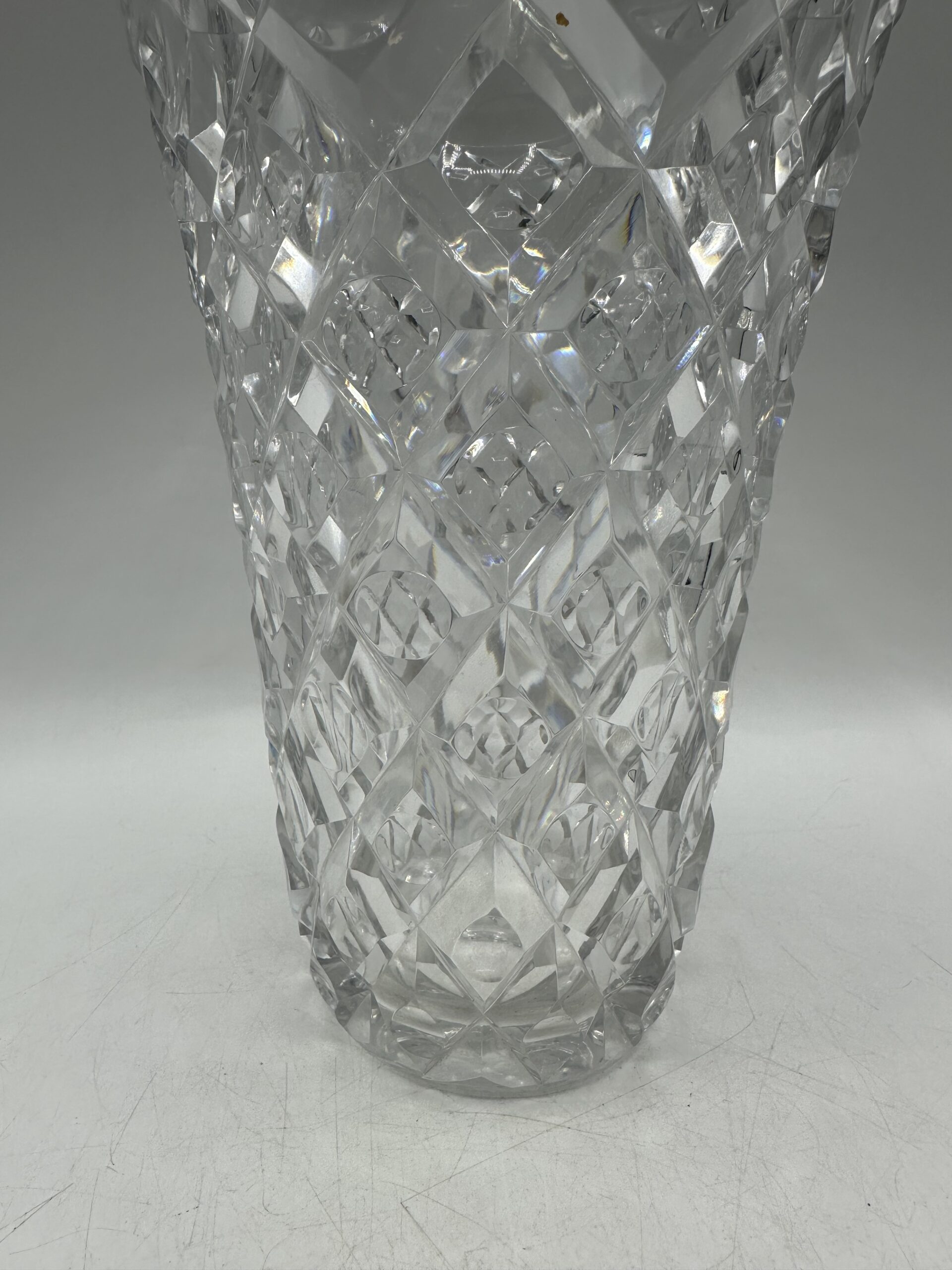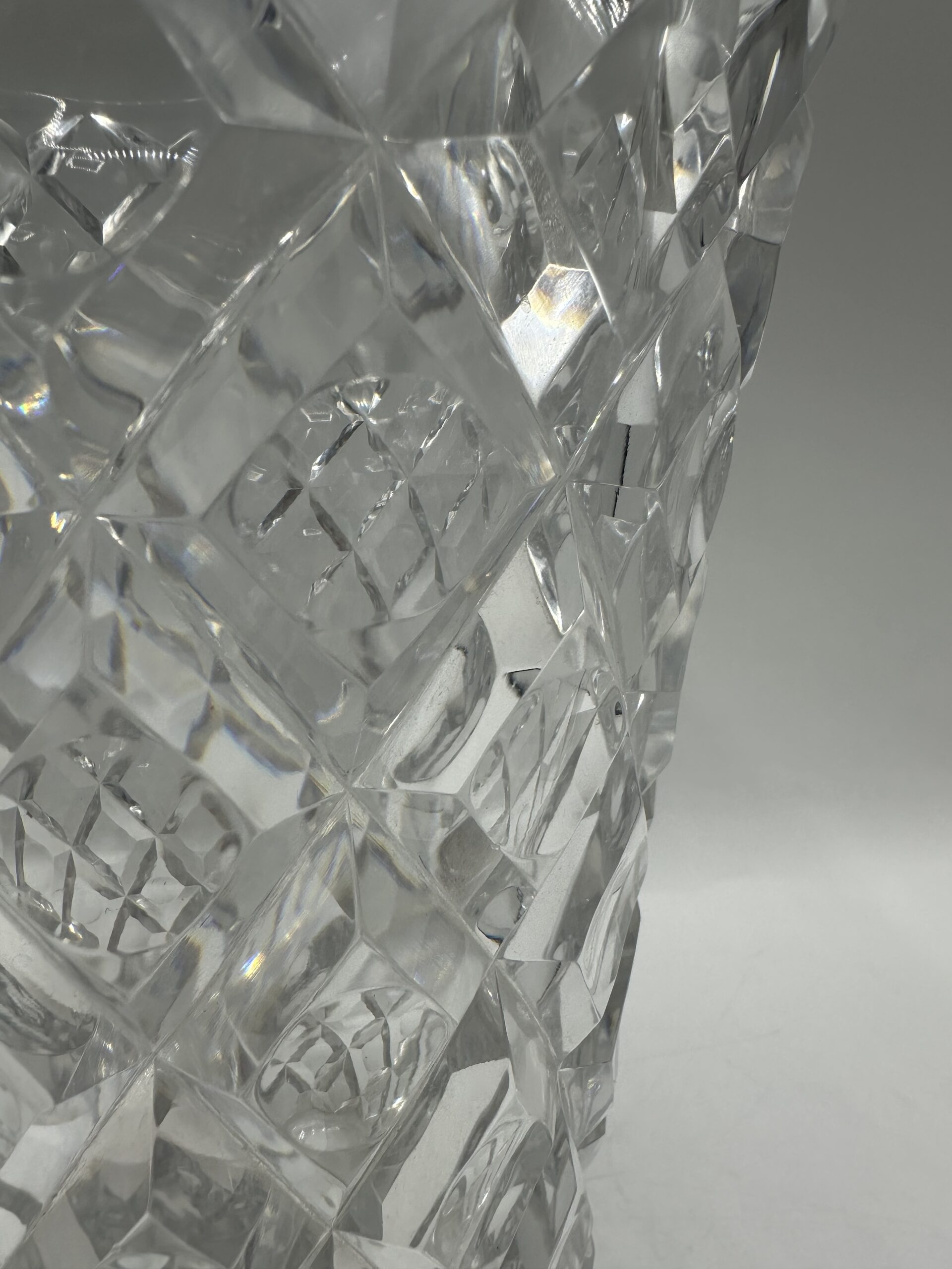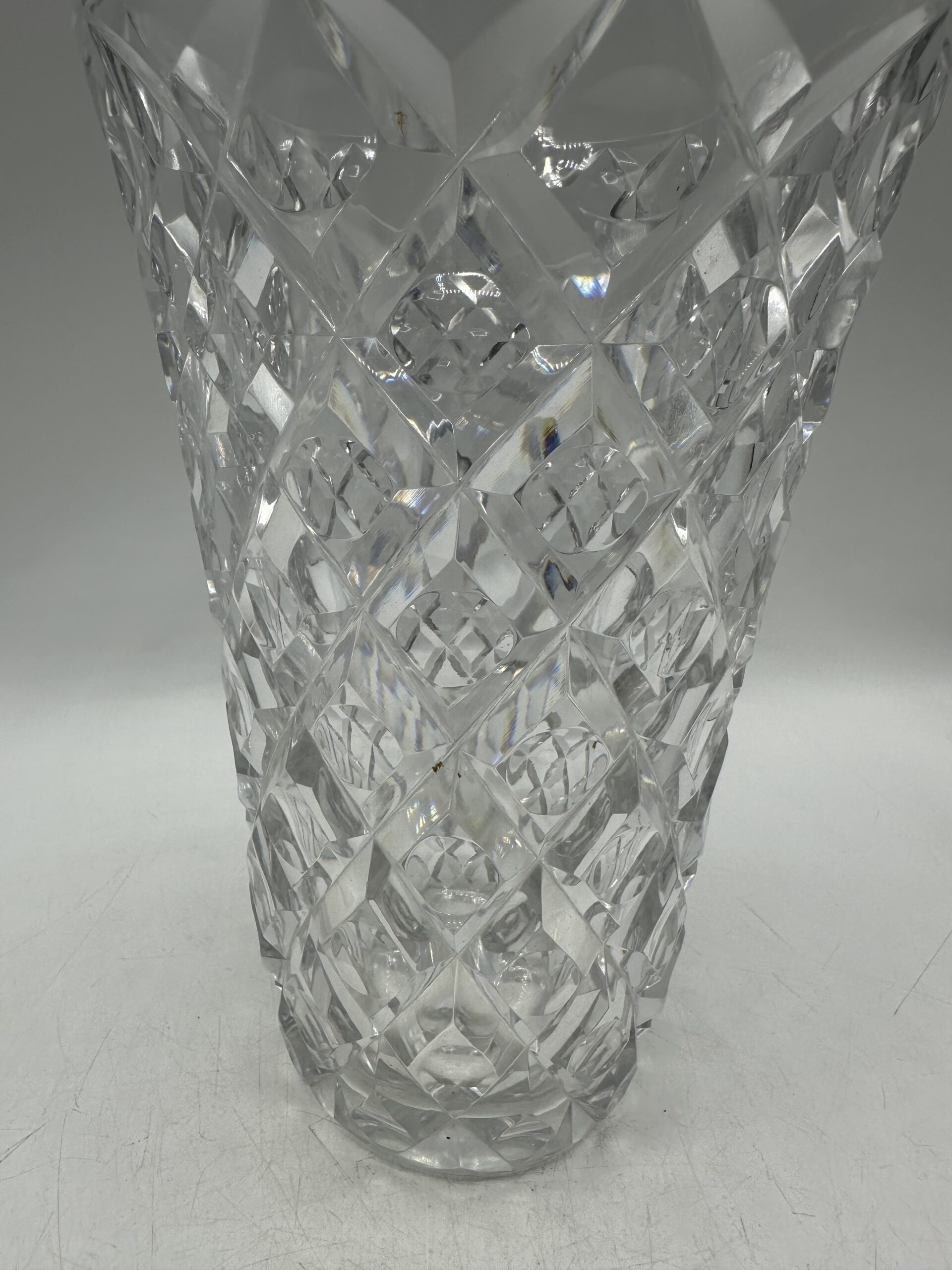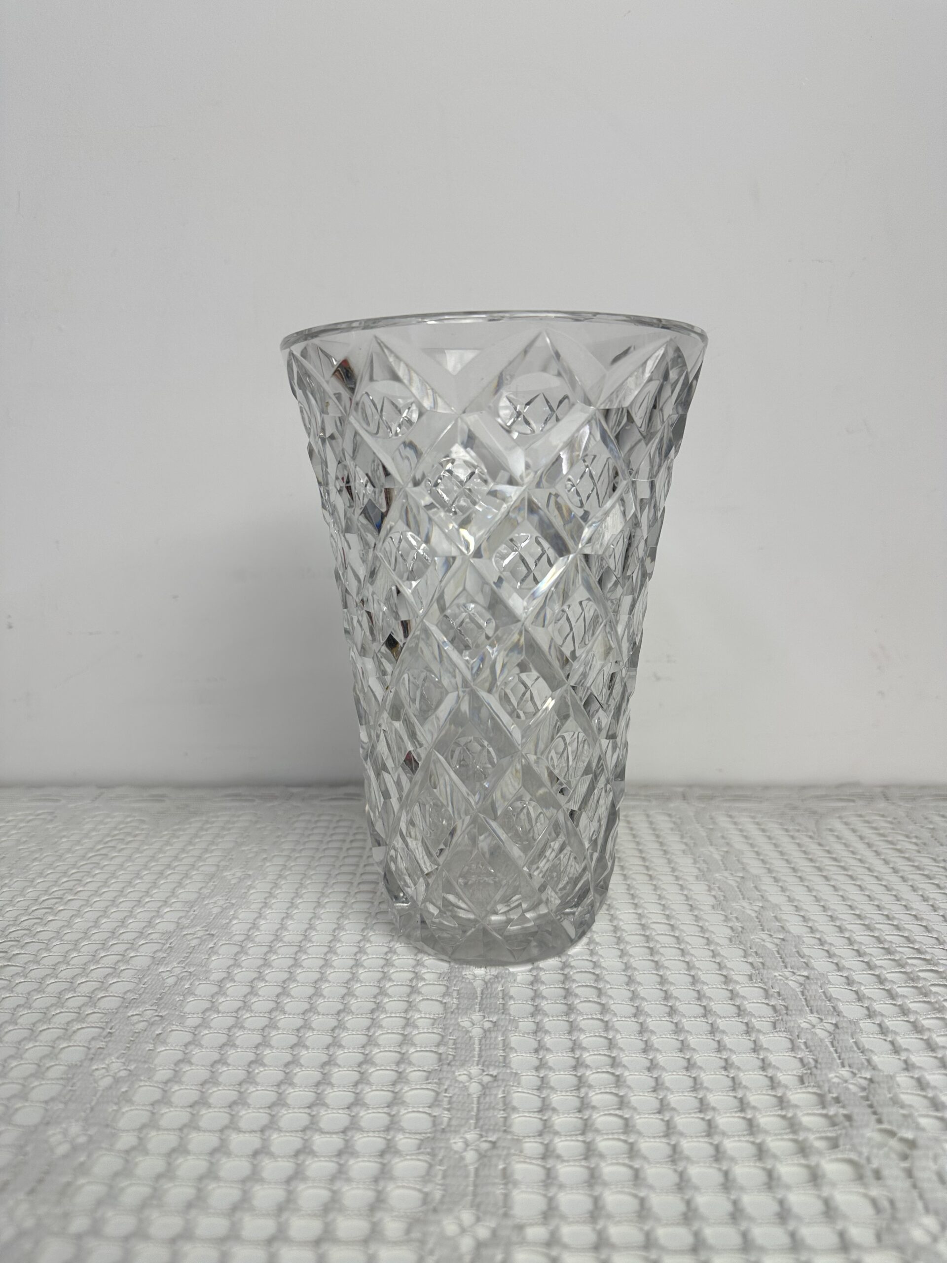 Ce vase présente un magnifique décor ciselé en losanges, avec un rond en leur centre. Ce motif géométrique, typique des créations Saint-Louis, capte la lumière et donne à l’ensemble un jeu de reflets saisissant.
