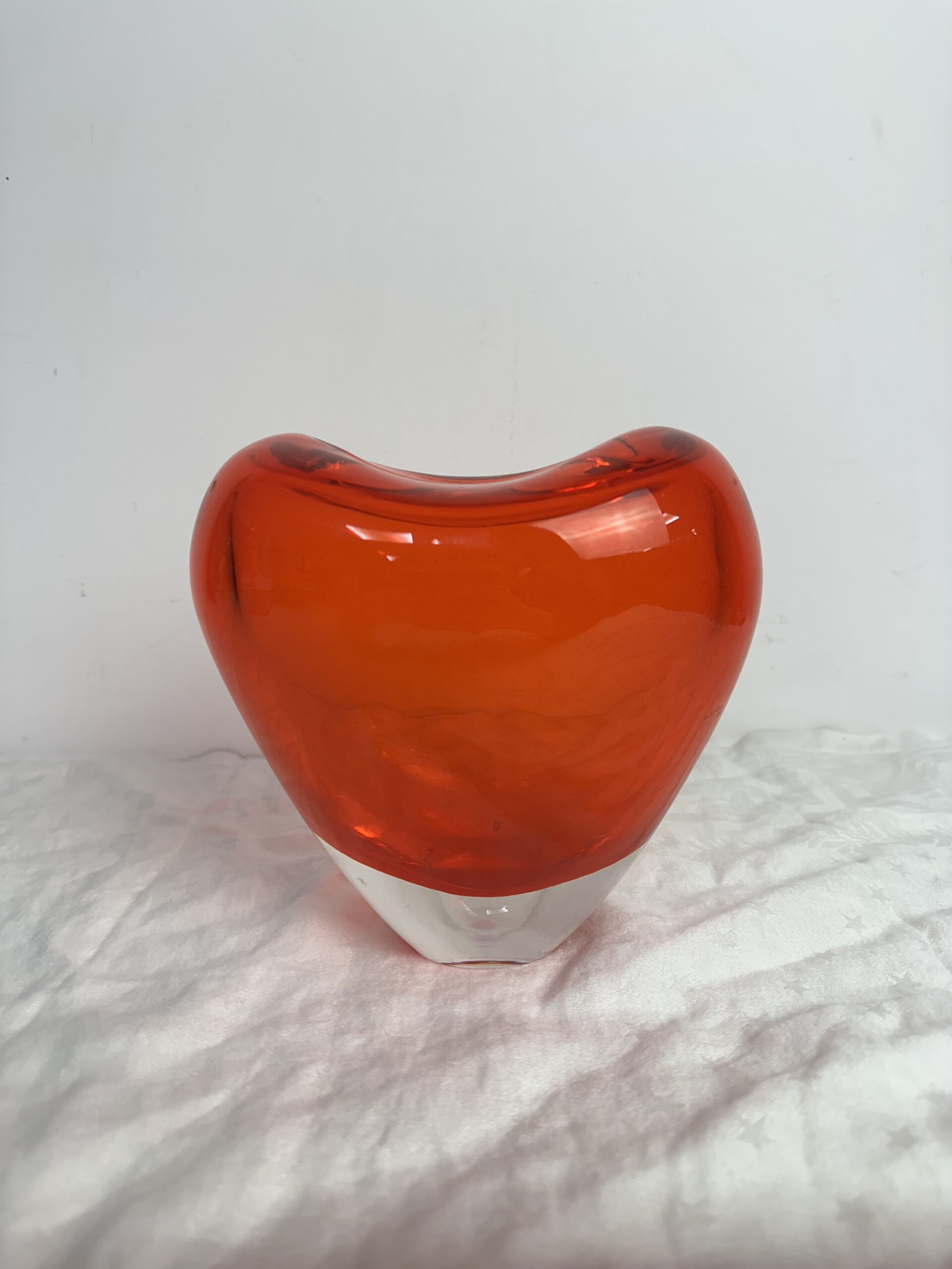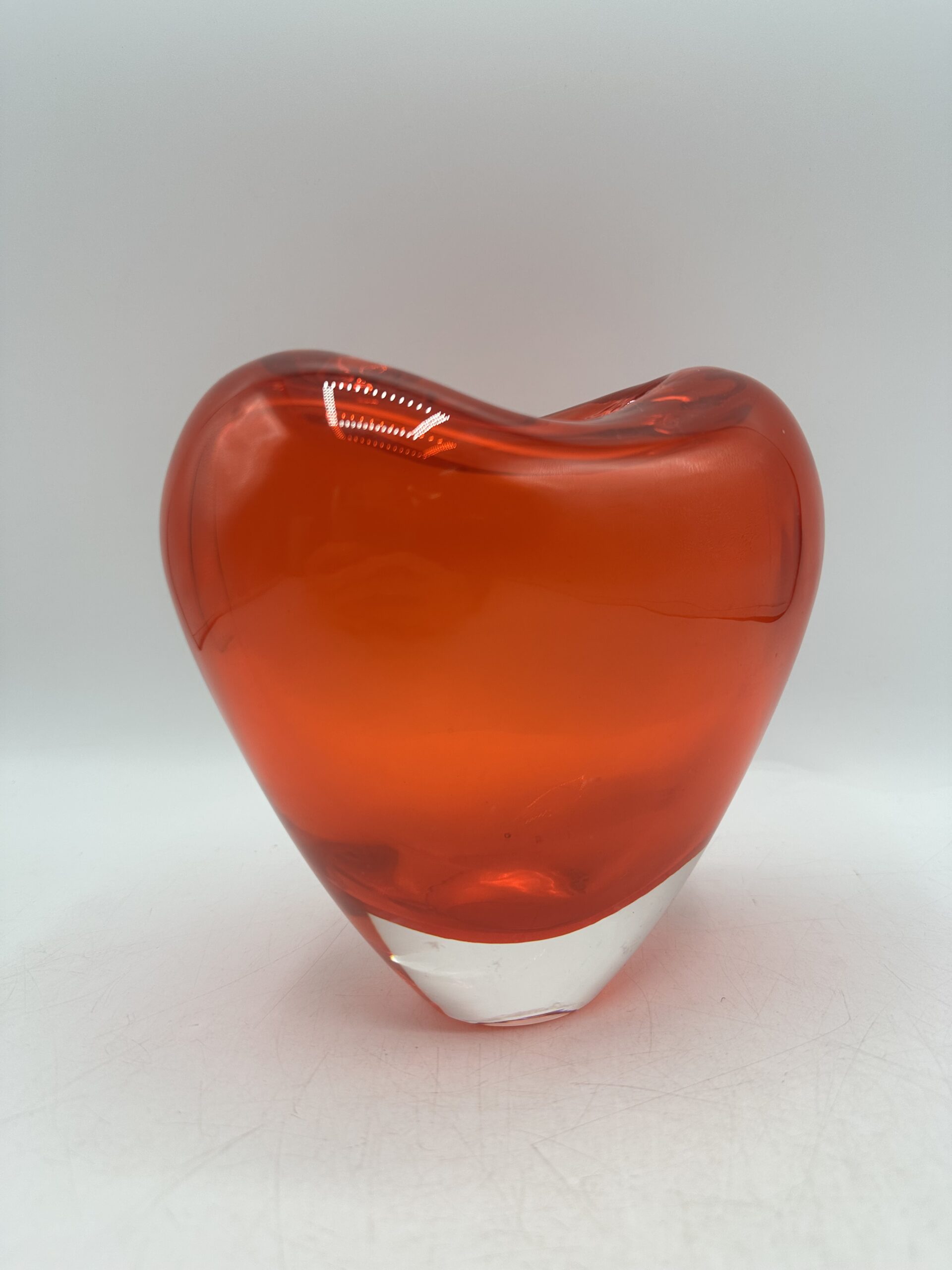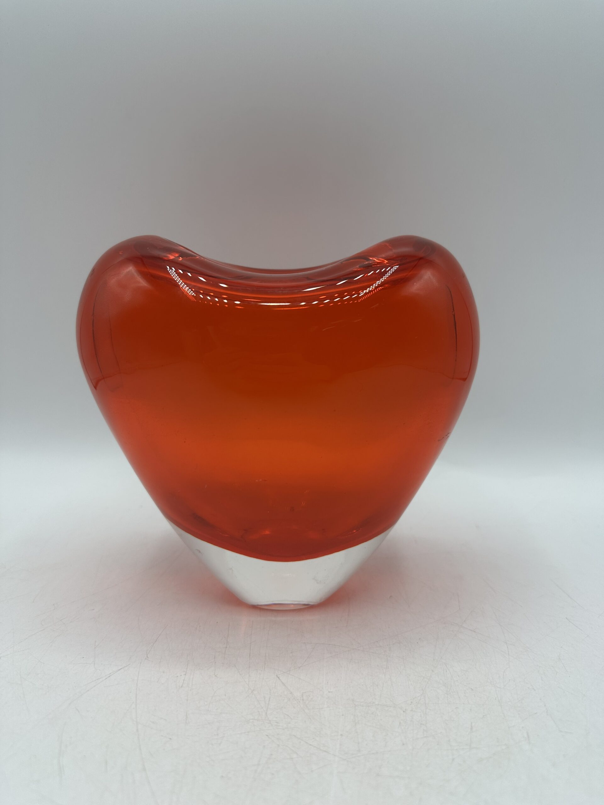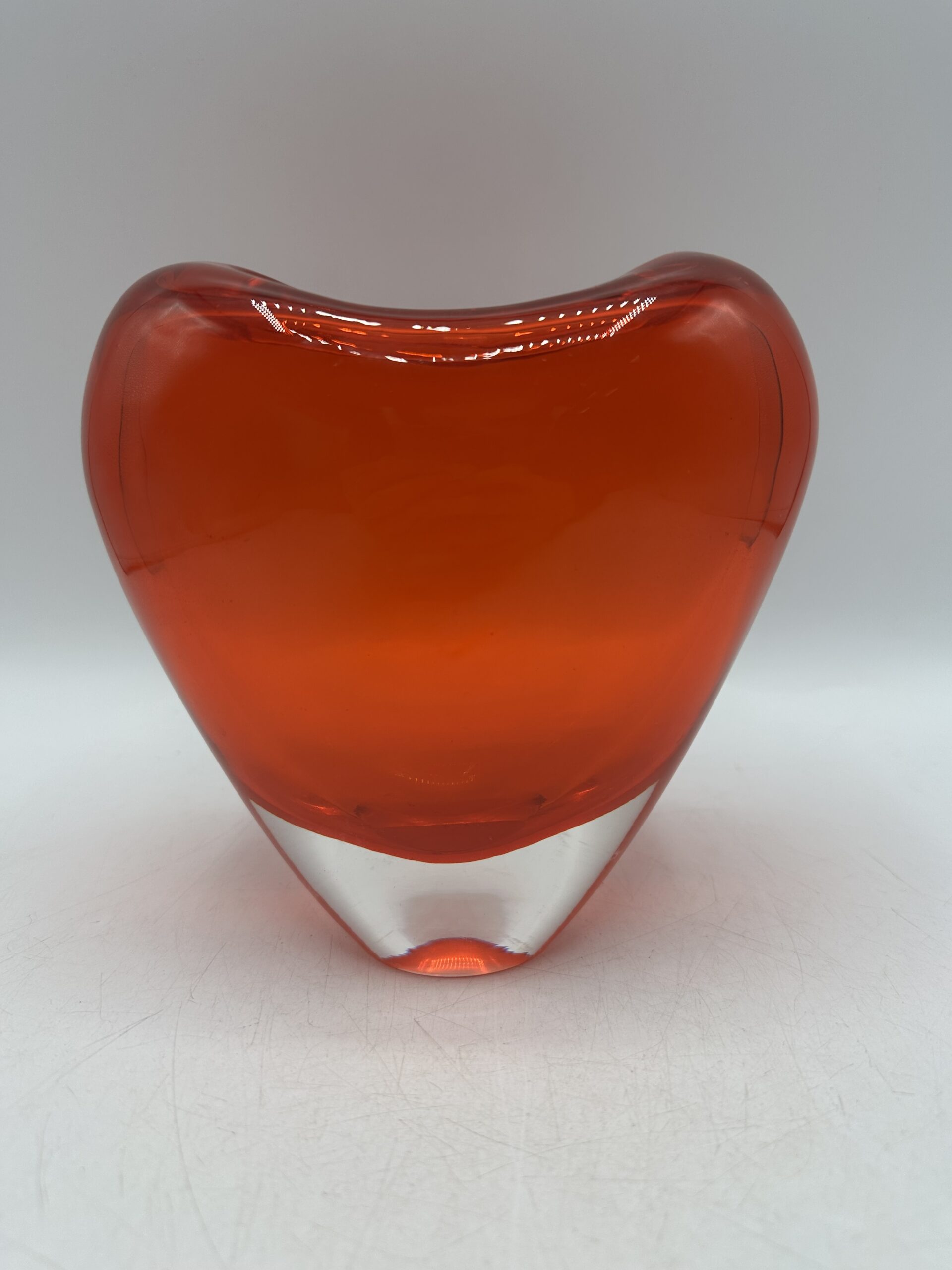 Ce vase en verre épais représente un coeur rouge orangé. IL est en très bon état général, sans casse ni éclats. Il y a de très légères mini rayures à la base, sur le dessous mais rien d’anormal.