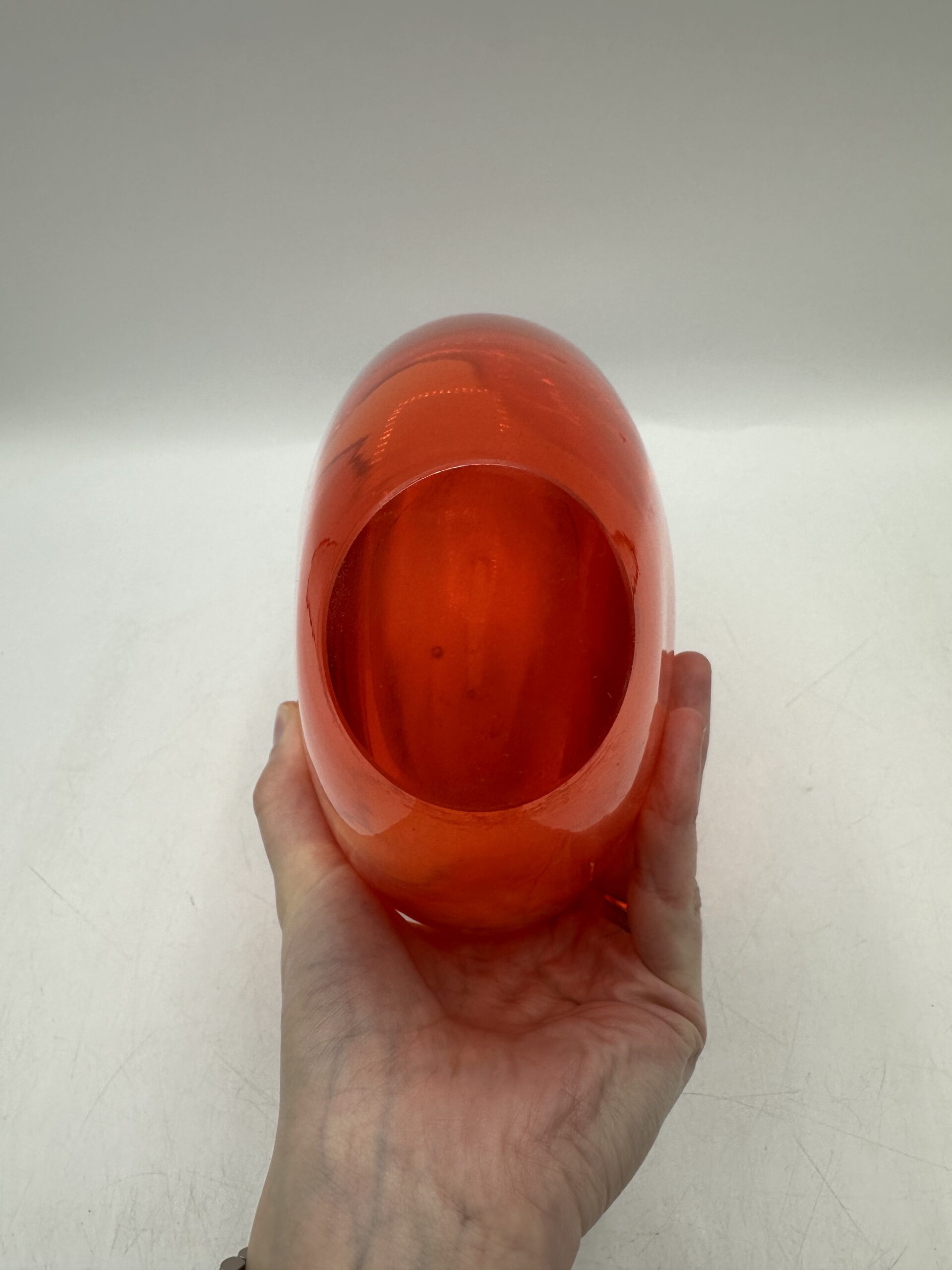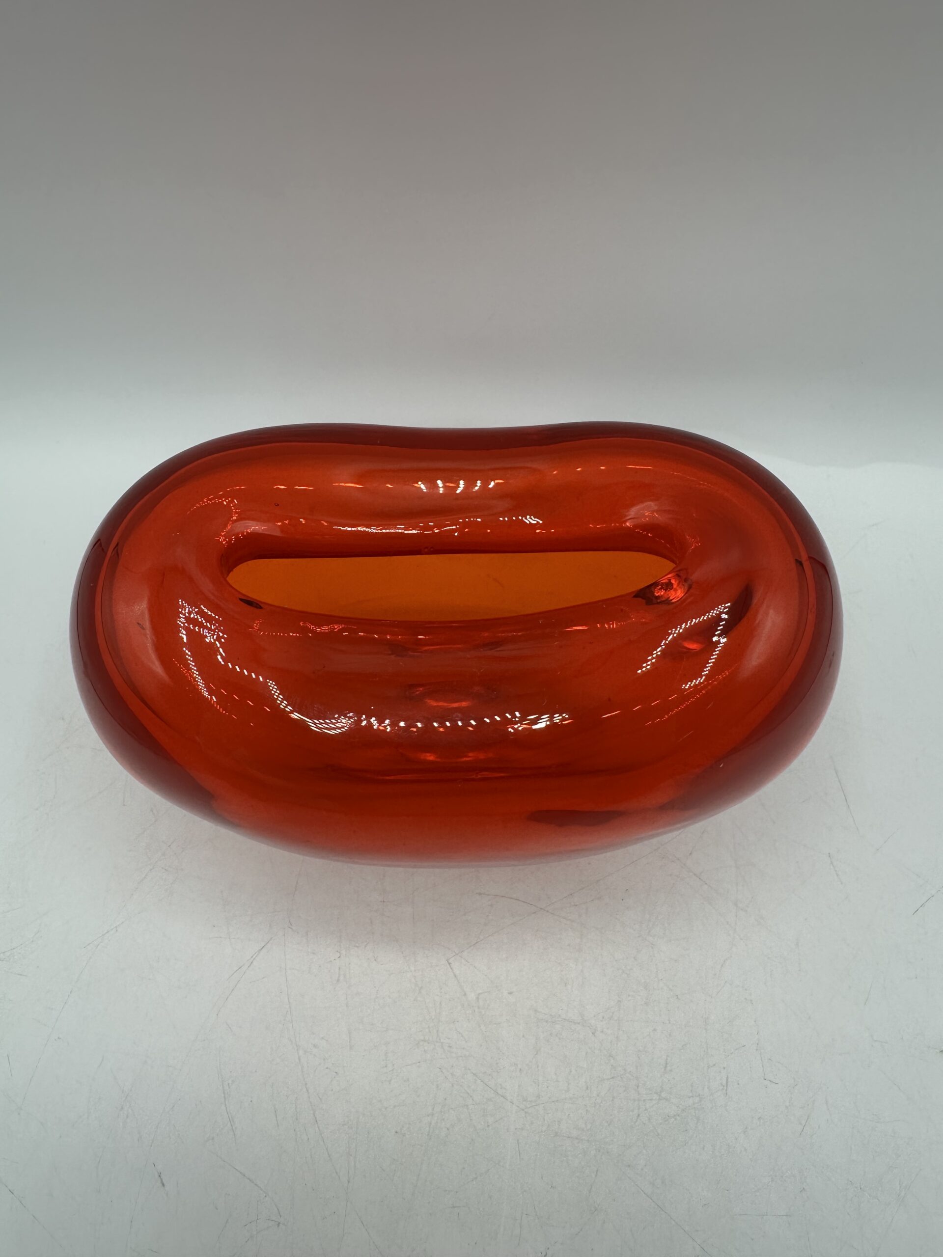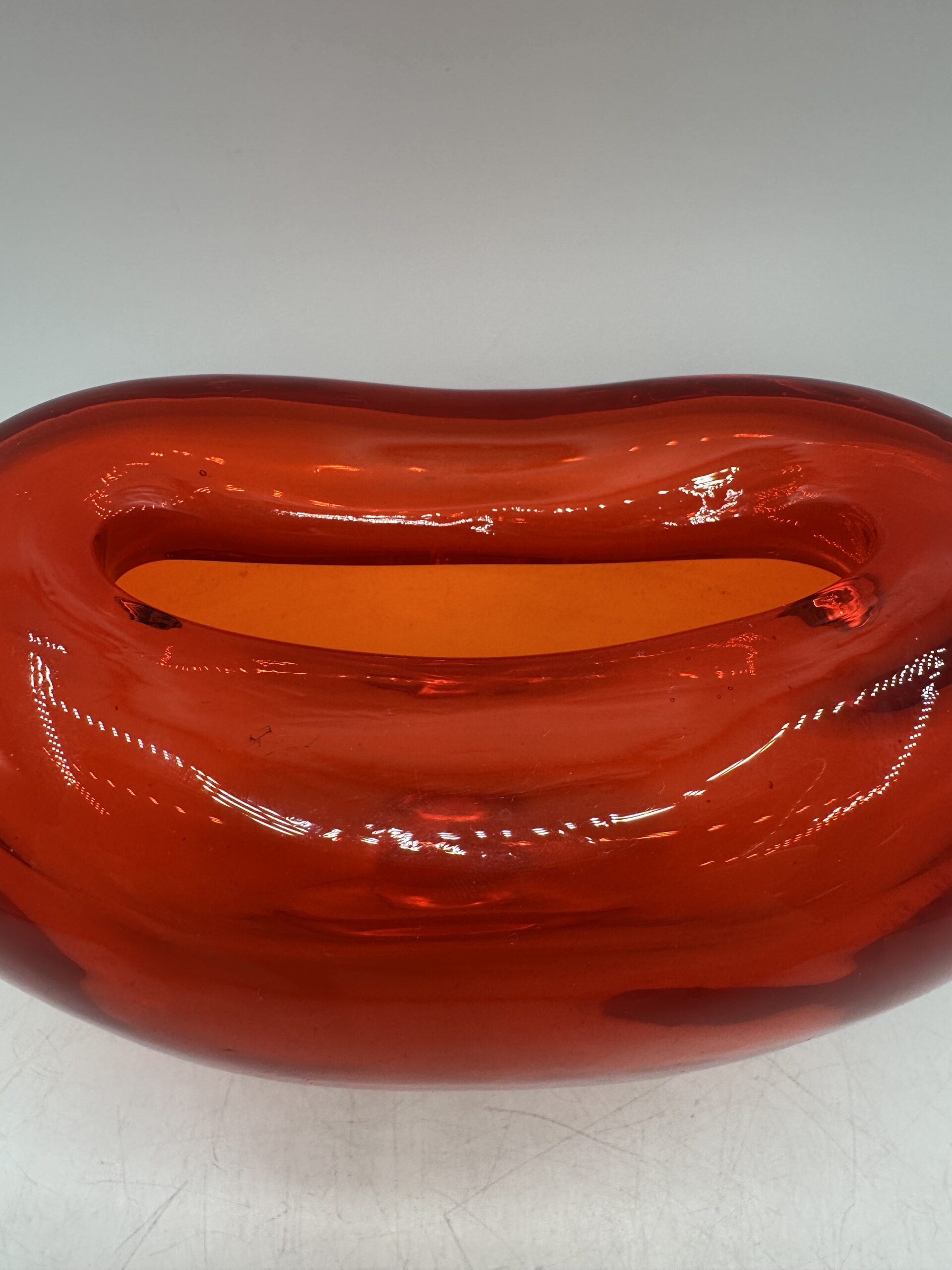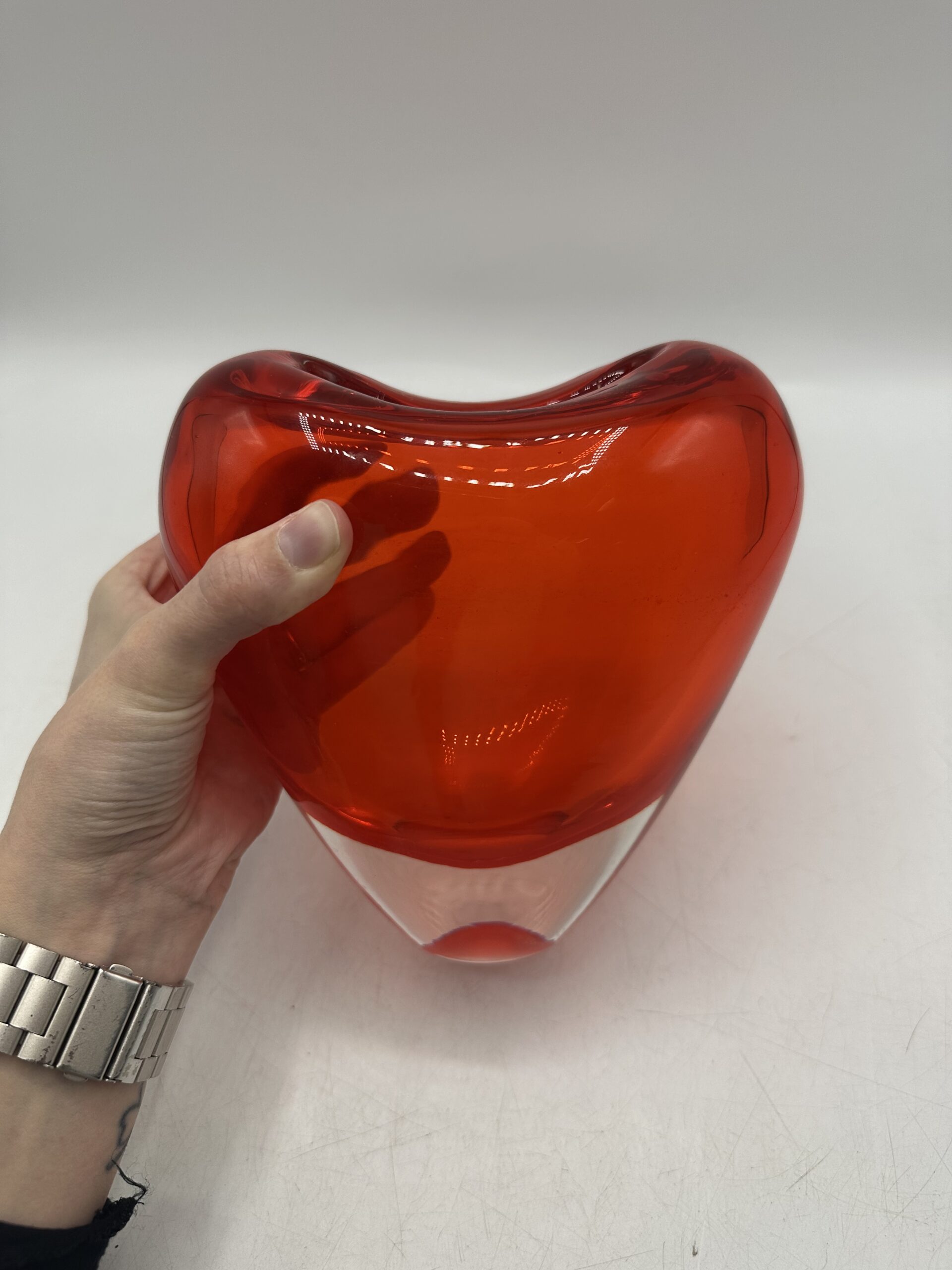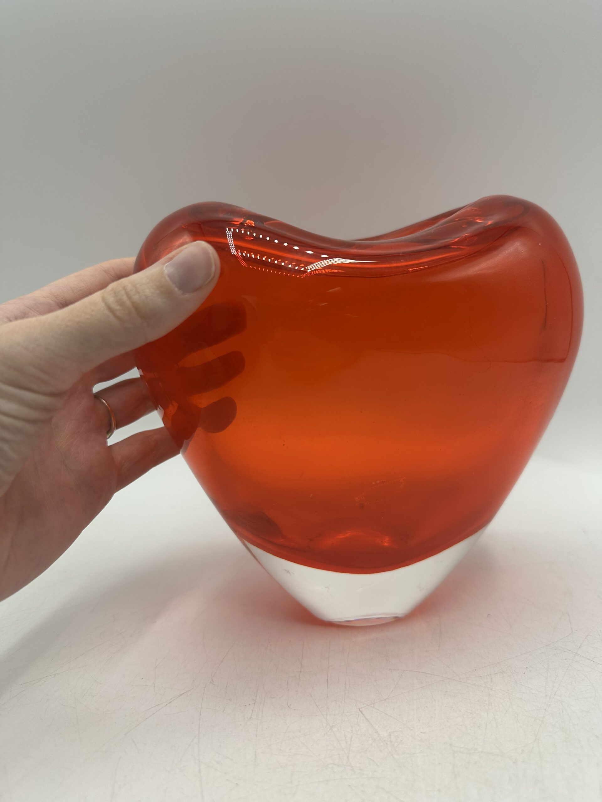 Ce vase en verre épais représente un coeur rouge orangé. IL est en très bon état général, sans casse ni éclats. Il y a de très légères mini rayures à la base, sur le dessous mais rien d’anormal.