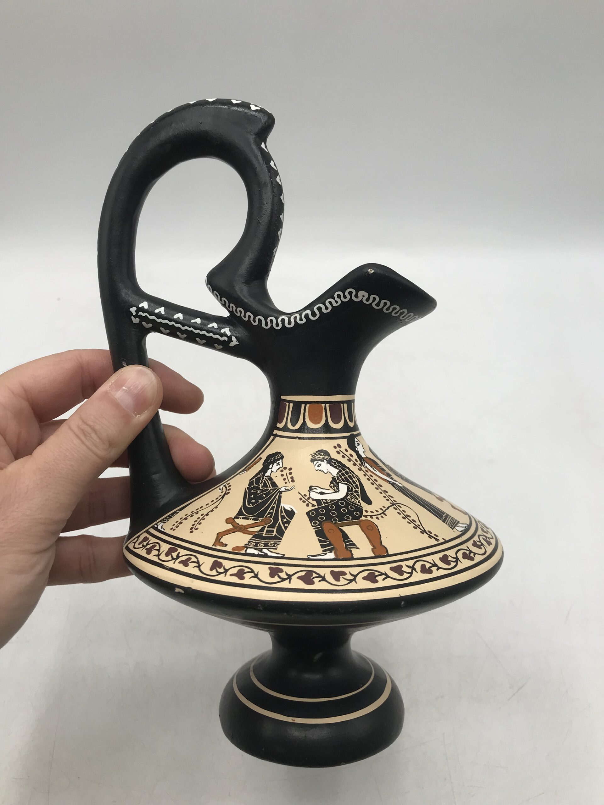 Vase grec en argile. Très joli vase d’origine Grec en argile. Il est en bon état, a noter un petits éclat sur le coté mais vraiment minime (cf photos). Une jolie pièce qui invite au voyage, créer une décoration exotique qui fera voyager vos amis et invités. Il est de couleur noir avec de jolies illustrations de l’époque. Il est noté en dessous, n°216/B nymphes conversing and spinning. ramenez un petit morceau de Grèce chez vous. Un petit vase qui ne laissera personne indifférent. Laissez vous emporter par de nouvelles cultures.