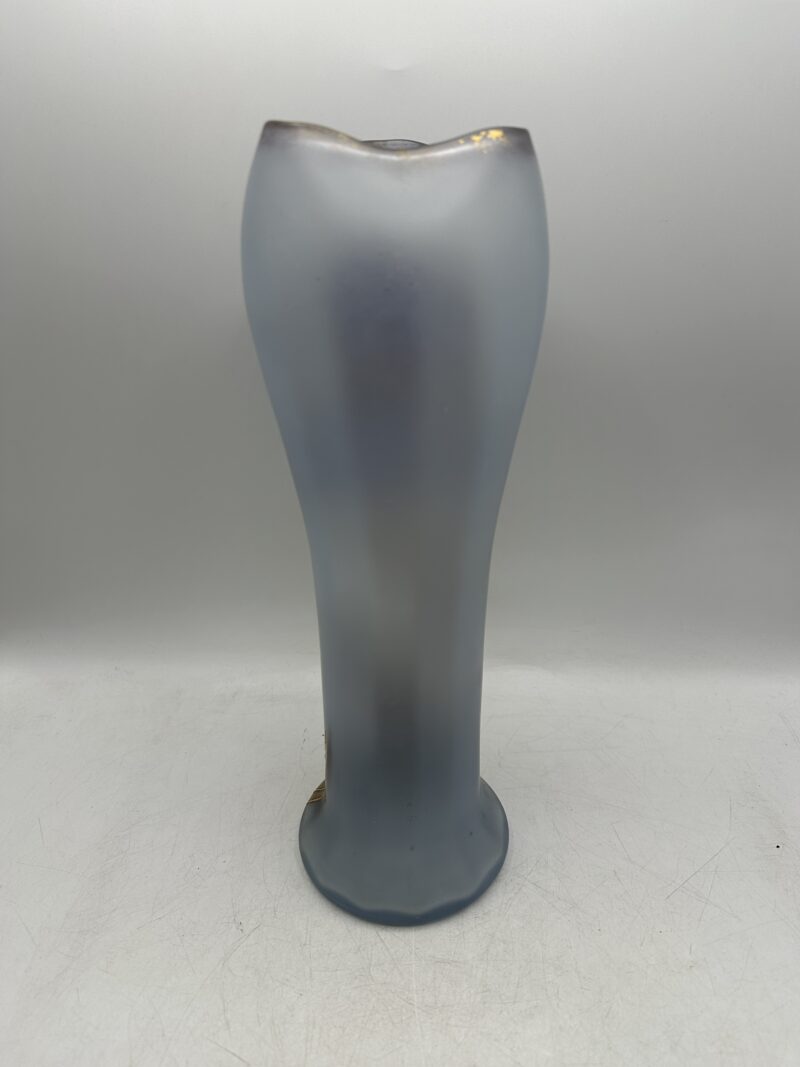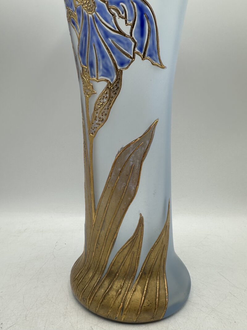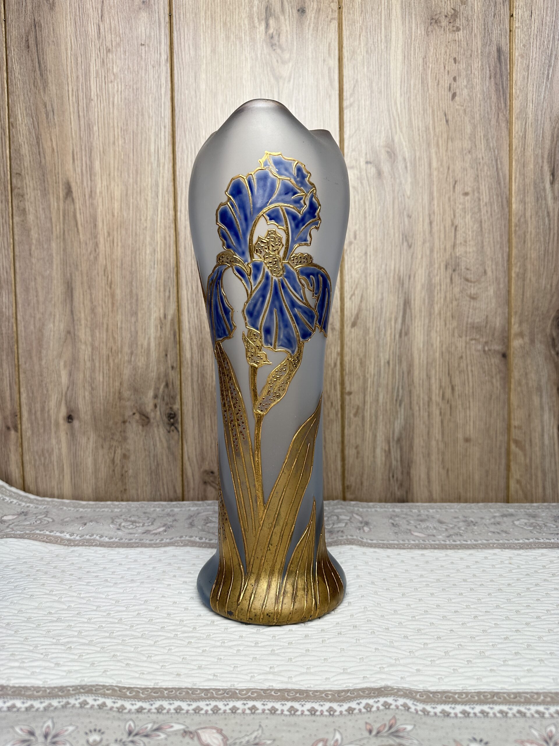 Le modèle Belgrade de Legras laisse apparaitre un Iris violet avec un feuillage doré, le tout émaillé et légèrement en relief. Le bord du vase est irrégulier, laissant place à des courbes faisant penser à celles d’une fleur. Le verre du vase est givré ce qui lui apporte une légère opacité, dans les tons de bleu/violet. Vase du célèbre verrier Legras, vers 1900, sans signature.