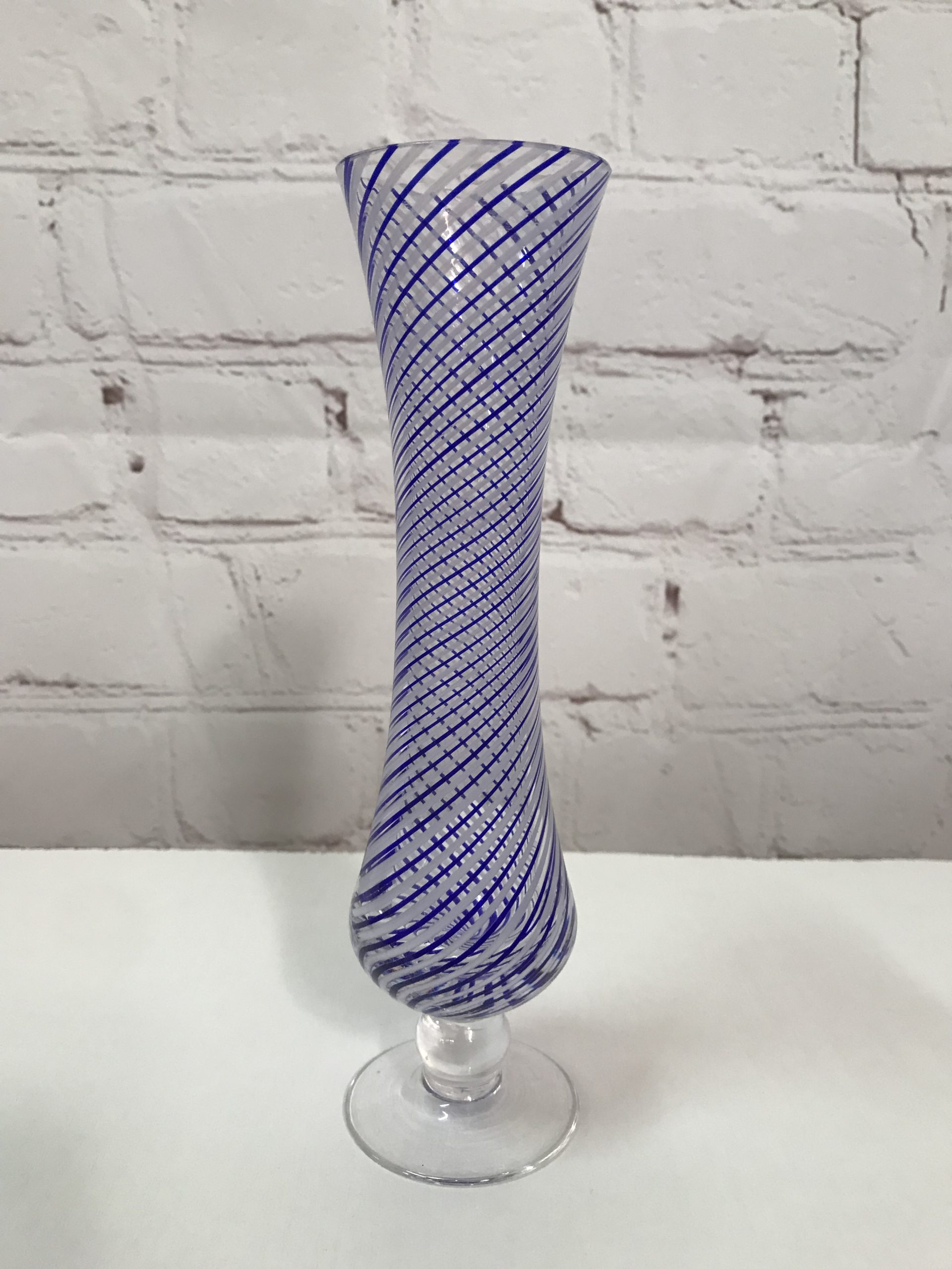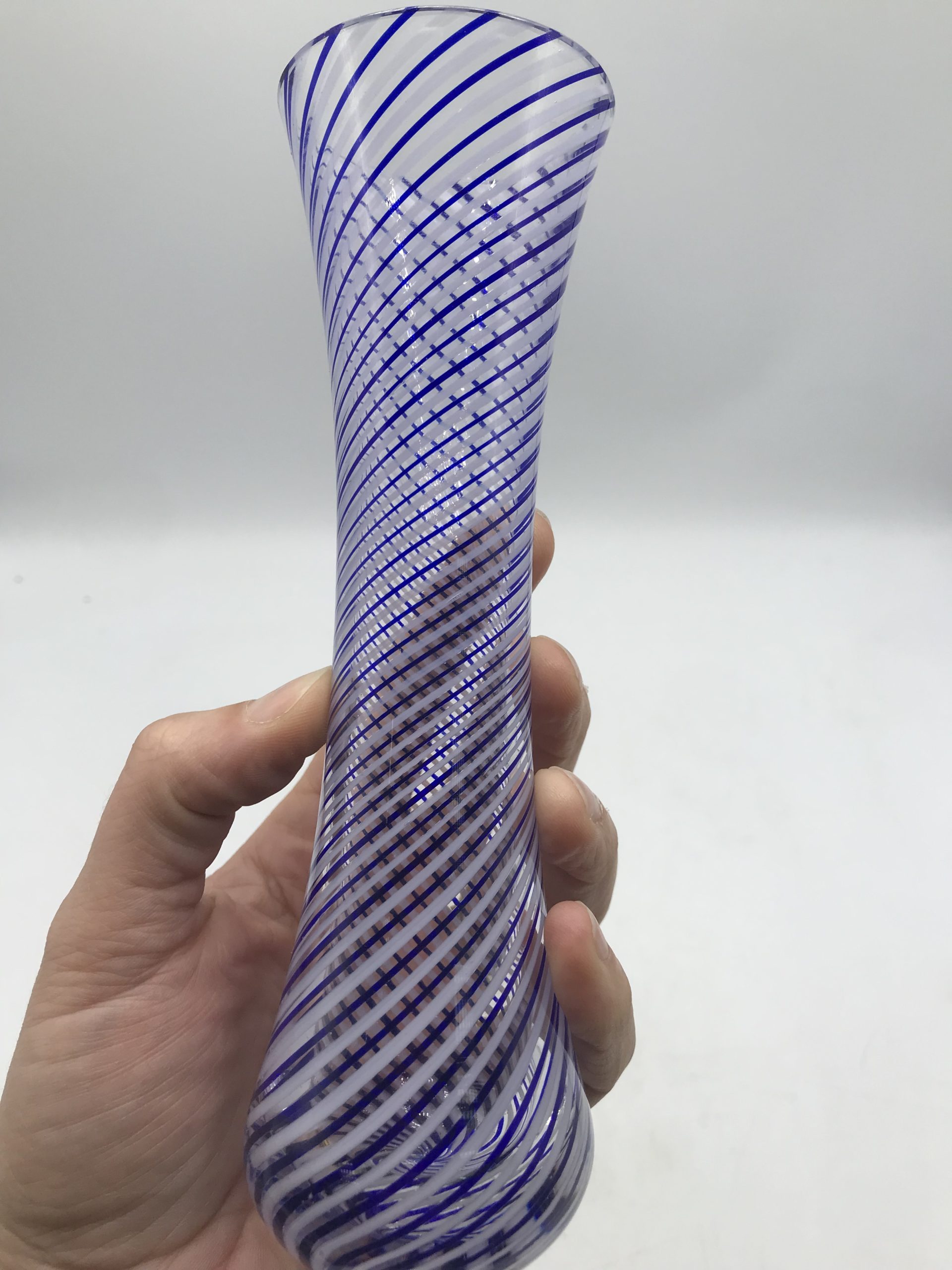 Petite pépite !! Un superbe petit vase style verre Murano. Décor en filigramme bleu et blanc qui crée un effet hypnotisant. Très belle pièce pleine de finesse qui apportera un coté psychédélique. Pour les amateur de jolis bibelots. Laissez vous tenter. Ouverture du vase 5,5 cm.