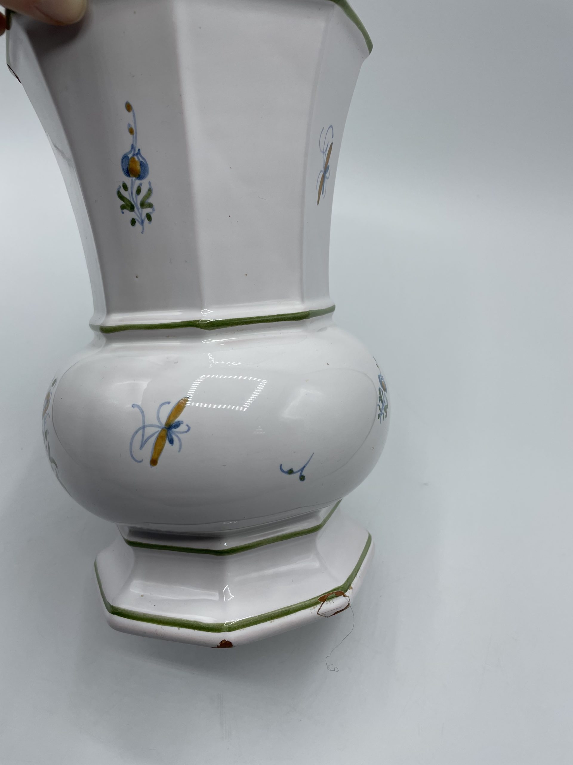 Ce grand vase est un joli vase vintage en faïence de Moustiers. De forme Medicis, c vase de grande taille est parfait pour accueillir de jolis bouquets. En faïence blanche, le vase est décoré d’un décor peint à la main d’une dame jouant du violon assise sur un animal imaginaire à deux queues et il est signé Ceseau. Vintage, des traces d’usure sont à prévoir (cf photos) jolies traces du temps passé. A la fois romantique et champêtre, il sera parfait pour un look shabby chic ou maison à la campagne.
