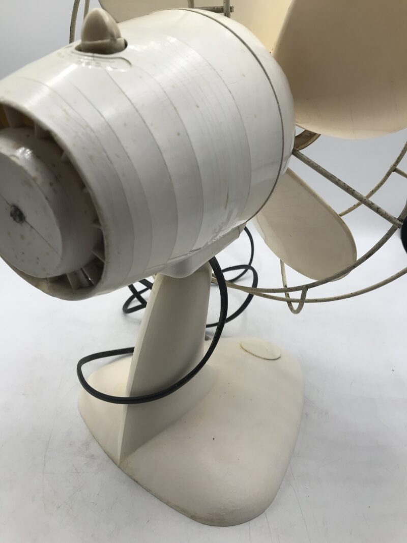 Alerte pépite !!!! Ventilateur Calor Bivolt écru vintage. Ce ventilateur à poser est une superbe pièce de décoration. Il date des années 50. Il porte des marques d’usure (cf photos), le plastique est décoloré à certains endroits, les parties métalliques du cerclage des pales est rouillé et la peinture écaillée par endroit. Les pales portent des marques d’usure. La position oscillante ne marche pas très bien, il est à utiliser en position fixe. Le moteur marche très bien et il est plutôt silencieux pour un modèle ancien. En bref il porte les marques de son âge. Un nettoyage plus en profondeur lui redonnera un look plus neuf. Il a un fort potentiel, il représente toute une époque. L’été arrive il serra votre compagnon fidèle et étonnera vos amis. En plus d’apporter un peu de fraicheur les jours de grande chaleur, c’est un accessoire dont l’esthétisme typiquement Mid-century ravira les nostalgiques de cette époque. Ambiance Breakfast in America garantie. Laissez vous séduire.
