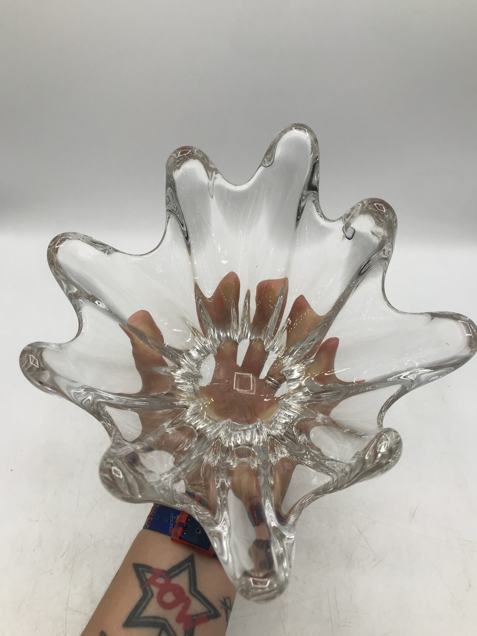 Alerte grosse pépite !!!! Vide poche Maison DAUM vintage. Très beau vide poche ou vase pour bouquet court est fourni. Il est en forme de « d’éclat de goutte d’eau » une vraie merveille. Vide poche en cristal très épais, signée DAUM FRANCE, la signature est sur le coté ( cf photo). Le vide poche est dans un bon état pas d’éclat. A noter des rayures d’usage sur le fond. Une grande signature pour un objet déco emblématique. Une pièce déco intemporelle. Avis au connaisseurs et amateurs avertis.