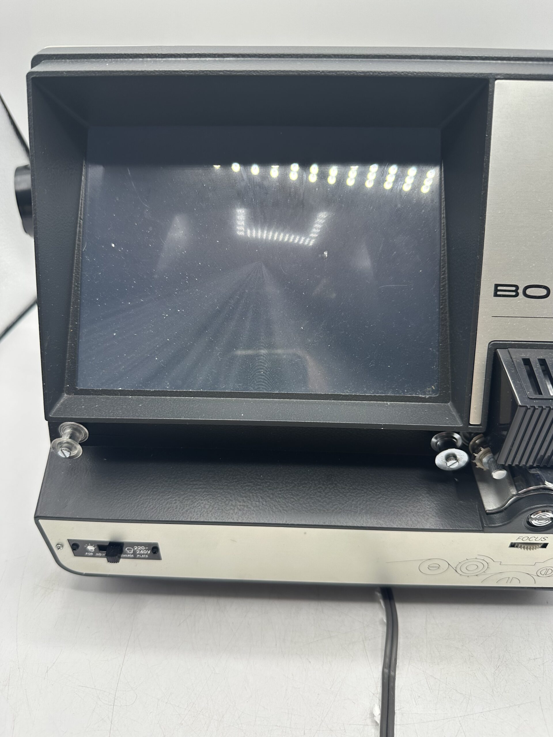 La visionneuse à été testée électriquement, le courant passe mais après je ne sais pas si le tout fonctionne correctement, je n’ai pas de quoi tester. La visionneuse est vendue pour objet déco, mais il y a de fortes chances que celle ci fonctionne bien. L’écran, les commandes et l’ensemble du mécanisme sont en bel état, sans dommages visibles.